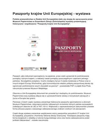 Paszporty krajów Unii Europejskiej - wystawa Polskie przewodnictwo w Radzie Unii Europejskiej stało się okazją do opracowania przez Muzeum Papiernictwa w Dusznikach Zdroju (Dolnośląskie) wystawy prezentującej historyczne i współczesne "Paszporty krajów Unii Europejskiej". Paszport, jako dokument sporządzony na papierze, przez wieki uprawniał do podróżowania pomiędzy różnymi krajami, a niekiedy nawet pomiędzy poszczególnymi częściami jednego państwa. Szczególnie pożądany i trudno dostępny był po II wojnie światowej w Polsce oraz w innych krajach Europy Wschodniej, gdyż komunistyczne władze polityką paszportową starały się ograniczać podróżowanie swych obywateli za granice" - powiedziała PAP w piątek Ewa Pluta, rzeczniczka prasowa Muzeum Miejskiego. Obecnie w Unii Europejskiej dokument ten przestał być niezbędny do podróżowania. Muzeum Papiernictwa swą wystawą włącza się w upowszechnianie wiedzy o korzyściach płynących z życia w Europie bez granic. Pierwsza z trzech części wystawy prezentuje historyczne paszporty zgromadzone w zbiorach Muzeum Papiernictwa, dotyczące podróży odbywanych na terenie różnych państw europejskich (należących obecnie do UE) w XIX i XX w. Większość z zaprezentowanych dokumentów posiada formę arkusza papieru czerpanego zabezpieczanego znakiem wodnym lub pieczęciami. Część druga wystawy prezentuje współczesne wzory paszportów wszystkich 27 krajów Unii Europejskiej, pozyskane z Komendy Głównej Straży Granicznej. "Dzisiejsze paszporty mają formę książeczki z okładką w kolorze burgundzkiego wina oraz liczne zabezpieczenia przed próbami fałszerstwa" - mówiła rzeczniczka. Wystawę kończy prezentacja procesu produkcji współczesnych paszportów w Polskiej Wytwórni Papierów Wartościowych. W 2012 r. ekspozycja będzie gościła w Brukseli, w Parlamencie Europejskim oraz w Warszawie w Muzeum Niepodległości. Organizatorem wystawy jest Muzeum Papiernictwa w Dusznikach Zdroju. Wystawę będzie można oglądać w Sali Lustrzanej Domu Kultury w Świeciu podczas trwania projektu „Tolerancja poprzez Futbol” (15.06-01.07.2012) , a następnie w Muzeum Ziemi Chełmińskiej ( 06.07-15.09.2012)