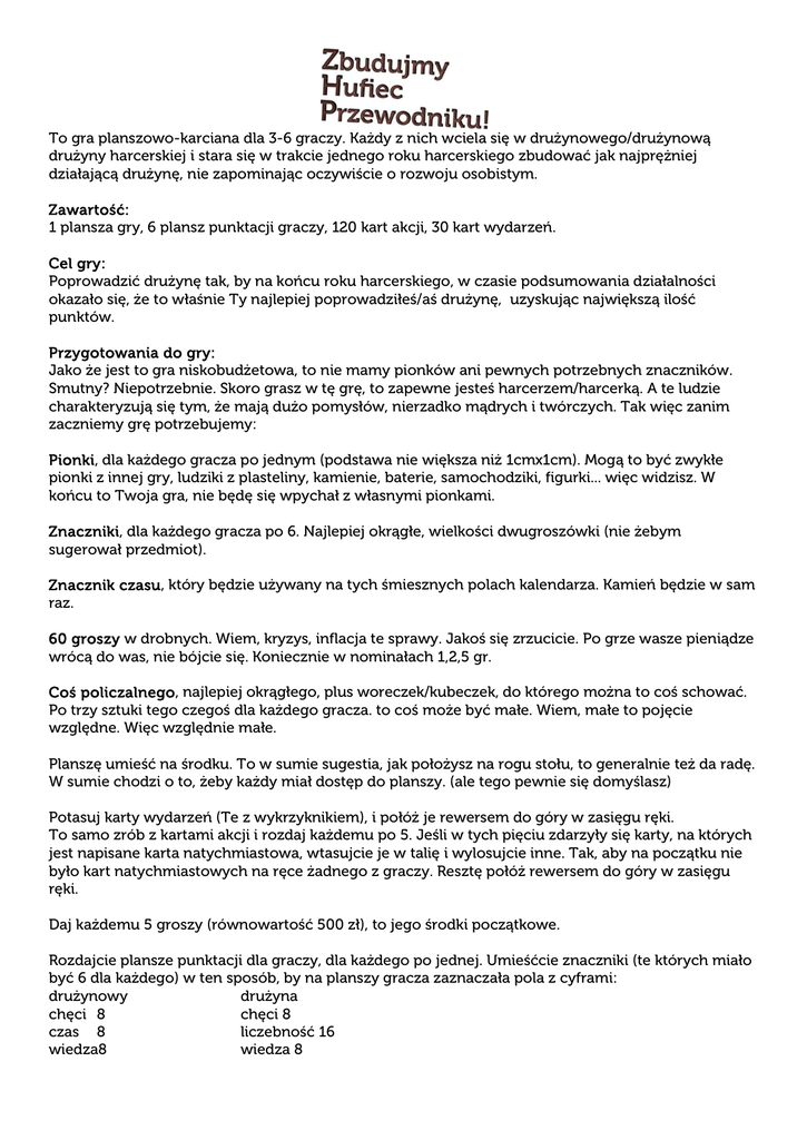 To gra planszowokarciana dla 36 graczy. Każdy z nich wciela się w drużynowego/drużynową drużyny harcerskiej i stara się w trakcie jednego roku harcerskiego zbudować jak najprężniej działającą drużynę, nie zapominając oczywiście o rozwoju osobistym. Zawartość: 1 plansza gry, 6 plansz punktacji graczy, 120 kart akcji, 30 kart wydarzeń. Cel gry: Poprowadzić drużynę tak, by na końcu roku harcerskiego, w czasie podsumowania działalności okazało się, że to właśnie Ty najlepiej poprowadziłeś/aś drużynę, uzyskując największą ilość punktów. Przygotowania do gry: Jako że jest to gra niskobudżetowa, to nie mamy pionków ani pewnych potrzebnych znaczników. Smutny? Niepotrzebnie. Skoro grasz w tę grę, to zapewne jesteś harcerzem/harcerką. A te ludzie charakteryzują się tym, że mają dużo pomysłów, nierzadko mądrych i twórczych. Tak więc zanim zaczniemy grę potrzebujemy: Pionki, dla każdego gracza po jednym (podstawa nie większa niż 1cmx1cm). Mogą to być zwykłe pionki z innej gry, ludziki z plasteliny, kamienie, baterie, samochodziki, figurki... więc widzisz. W końcu to Twoja gra, nie będę się wpychał z własnymi pionkami. Znaczniki, dla każdego gracza po 6. Najlepiej okrągłe, wielkości dwugroszówki (nie żebym sugerował przedmiot). Znacznik czasu, który będzie używany na tych śmiesznych polach kalendarza. Kamień będzie w sam raz. 60 groszy w drobnych. Wiem, kryzys, inflacja te sprawy. Jakoś się zrzucicie. Po grze wasze pieniądze wrócą do was, nie bójcie się. Koniecznie w nominałach 1,2,5 gr. Coś policzalnego, najlepiej okrągłego, plus woreczek/kubeczek, do którego można to coś schować. Po trzy sztuki tego czegoś dla każdego gracza. to coś może być małe. Wiem, małe to pojęcie względne. Więc względnie małe. Planszę umieść na środku. To w sumie sugestia, jak położysz na rogu stołu, to generalnie też da radę. W sumie chodzi o to, żeby każdy miał dostęp do planszy. (ale tego pewnie się domyślasz) Potasuj karty wydarzeń (Te z wykrzyknikiem), i połóż je rewersem do góry w zasięgu ręki. To samo zrób z kartami akcji i rozdaj każdemu po 5. Jeśli w tych pięciu zdarzyły się karty, na których jest napisane karta natychmiastowa, wtasujcie je w talię i wylosujcie inne. Tak, aby na początku nie było kart natychmiastowych na ręce żadnego z graczy. Resztę połóż rewersem do góry w zasięgu ręki. Daj każdemu 5 groszy (równowartość 500 zł), to jego środki początkowe. Rozdajcie plansze punktacji dla graczy, dla każdego po jednej. Umieśćcie znaczniki (te których miało być 6 dla każdego) w ten sposób, by na planszy gracza zaznaczała pola z cyframi: drużynowy drużyna chęci 8 chęci 8 czas 8 liczebność 16 wiedza8 wiedza 8 Wariant dla zaawansowanych: Rozdziel punkty początkowe dowolnie, tak aby suma punktów drużynowego wynosiła 24, a drużyny 32. Dobra, wszystko gotowe. Czas na Zbudowanie Hufca, Przewodniku! Plansza: Jak widzisz na planszy są dwie części. Mapa i Kalendarz. Mapa: Składa się z dróg i lokacji, w których można wykonywać akcje. Lokacje to te okrągłe miejsca z symbolami. W każdej lokacji może jednocześnie znajdować się jedna osoba! Z jednej lokacji do drugiej zawsze idziemy najkrótszą drogą. Gdy idziemy do innej lokacji i mijamy graczy, możemy wymienić z nimi kartę (karty) w dowolny, korzystny dla nas sposób, ale zawsze 1 za 1. Gdy wymienimy kartę zyskujemy jeszcze jedną rzecz, a mianowicie możemy podnieść swój suwak chęci (czyli chęci drużynowego) o 1. Uwaga! Samo przemieszczanie się pomiędzy lokacjami nie jest liczone jako akcja w turze! Tylko akcja w danej lokacji. Kalendarz: Jak nie trudno się domyślić zaczynamy we wrześniu, kończymy w sierpniu. Kładziemy na nim znacznik, i przesuwamy go po każdej turze o 1 miesiąc. Plansza gracza: Składa się z sześciu suwaków/torów punktacji. Jak pewnie zauważyłeś/aś jest podzielony na dwie części drużynowy/a i drużyna. Każda z tych cech/właściwości ma swoją wartość, która wielokrotnie zostanie zmieniona w czasie gry. Do tego potrzebne są właśnie znaczniki. Pamiętaj, by utrzymywać równowagę pomiędzy tymi współczynnikami, i aby nie pomylić chęci drużyny i drużynowego/ej oraz wiedzy. Karty wydarzeń: Co miesiąc zostaje odkryta nowa, obowiązująca wszystkich graczy karta wydarzeń. (we wrześniu nie!) Następnie rozpatrywana, i zastosowana przez wszystkich w grze. Wydarzenia są różne. Pozytywne i negatywne. Nikt nie mówił, że robota drużynowego jest prosta... Jeśli zagrasz już kilkukrotnie, i uznasz, że jedna karta wydarzenia to za mało, śmiało, możesz wyciągać dwie miesięcznie. Karty akcji: To właśnie je będziesz zagrywał w czasie swojej kolejki. Na każdej jest wszystko napisane, jeśli posiadłeś umiejętności czytania ze zrozumieniem, to dasz radę. Na większości z nich jest symbol (symbole) lokacji. Aby wykonać tę akcję, trzeba zagrać kartę i udać się do wskazanego miejsca. Oczywiście, jeśli jest wolne. Jeśli jest kwota, np. 100 zł oznacza to, że dana akcja wymaga środków pieniężnych i musisz uiścić daną kwotę, lub otrzymujesz wymienioną na karcie kwotę, w przypadku akcji zarobkowych. Na dole karty są pewne plusy i minusy wynikające z jej zagrania. Przesuń swoje suwaki o wskazane wartości na karcie, w momencie jej zagrywania. Żadna cecha nie może być niższa od 1 i wyższa od 16 (z wyjątkiem liczebności 32) Oznacza to, że jeśli zagram kartę dającą mi +1 wiedzy drużynowego i +1 wiedzy drużyny, a wiedzę drużynowego mam już na 16, to zwiększę o 1 tylko wiedzę drużyny. Jeśli chociaż chwilę później zdarzy się sytuacja w której np. będziesz musiał/a odjąć o 1 z wiedzy drużynowego/ej, to musisz przenieść wskaźnik na 15, mimo tego, że miałaś 16 i 1, który się "nie zmieścił". Nie można zagrać karty, gdy odejmuje ona więcej danej cechy niż ma