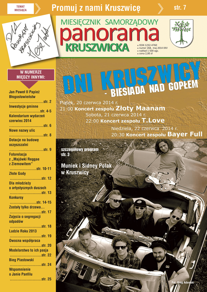 TEMAT MIESIĄCA panorama KRUSZWICKA Promuj z nami Kruszwicę MIESIĘCZNIK SAMORZĄDOWY str. 7 ISSN 1232-4760 numer 268, maj 2014 XXV nakład 1 500 egz. cena 2,00 zł W NUMERZE MIĘDZY INNYMI: Jan Paweł II Papież Błogosławieństw ...........................str. 2 Inwestycje gminne ........................str. 4-5 Kalendarium wydarzeń czerwiec 2014 ...........................str. 6 Nowe nazwy ulic ...........................str. 8 Dotacje na budowę oczyszczalni ...........................str. 9 Fotorelacja z „Majówki Reggae z Ziemowitem” .....................str. 10-11 Złote Gody .........................str. 12 Dla młodzieży o artystycznych duszach .........................str. 13 Konkursy .....................str. 14-15 Zostały tylko drzewa... .........................str. 17 Zajęcia o segregacji odpadów .........................str. 18 Ludzie Roku 2013 .........................str. 19 Owocna współpraca .........................str. 20 Modelarstwo to ich pasja .........................str. 22 Bieg Piastowski .........................str. 24 Wspomnienie o Janie Panfilu .........................str. 25 szczegółowy program str. 3 Muniek i Sidney Polak w Kruszwicy Fot. Greg Adamski 2 panorama KRUSZWICKA Jan Paweł II Papież Błogosławieństw 27 kwietnia Centrum Kultury i Sportu „Ziemowit” w Kruszwicy i PARAFIA PW. ŚW. TERESY OD DZIECIĄTKA JEZUS W KRUSZWICY zaprosili mieszkańców Kruszwicy na specjalny montaż słowno-muzyczny o drodze do świętości Papieża Polaka pt: „Jan Paweł II Papież Błogosławieństw”. Poruszona została tematyka świętości, znaczenie błogosławieństwa, obejrzeć było można projekcję multimedialną dotyczącą życia Papieża i jego pontyfikatu. Montaż w wykonaniu sekcji teatralnej Pawła Lewartow- skiego działającego przy CKIS „Ziemowit” w Kruszwicy. Nad muzyczną stroną czuwała sekcja wokalna i chór Lento, działający przy CKIS „Ziemowit” w Kruszwicy pod okiem Iwony Jasińskiej oraz Krzysztof Kosiński z uczennicami MOW Kruszwica. Wśród wykonywanych utworów nie zabrakło pieśni Rubika i ulubionej piosenki Papieża „Barki”. - Dziękuję naszemu Centrum za tak wzruszający program i zapraszam do nas częściej – powiedział na zakończenie ksiądz Wojciech Danecki, proboszcz parafii. Święto 3 Maja W dniu 3 maja br. o godz.12.00 z okazji rocznicy uchwalenia Konstytucji 3 Maja w Kolegiacie pw. św. Ap. Piotra i Pawła w Kruszwicy odbyła się Msza Święta w intencji ojczyzny. Po Mszy Świętej odbył się program artystyczny w wykonaniu Centrum Kultury i Sportu „Ziemowit” w Kruszwicy. Fot. Marzena Stróżyk Fot. Marzena Stróżyk 4 panorama KRUSZWICKA Inwestycje gminne Podobnie jak w latach ubiegłych Gmina Kruszwica w 2014 roku zaplanowała szereg prac inwestycyjnych i remontowych. Pierwsze efekty można już zaobserwować. Wykonana została przebudowa ulicy Grodzkiej w Kruszwicy, której dotychczasowy stan techniczny stwarzał zagrożenie dla jej użytkowników. Z początkiem roku wznowiono także działania na kruszwickim rynku. Zakończone zostały prace kanalizacyjne. Dziś można też dostrzec fragmenty układanej kostki granitowej pod miejsca parkingowe i chodniki. Wykonawca realizuje zadanie zgodnie z zaplanowanym harmonogramem. Ostateczny efekt będzie można zobaczyć we wrześniu. W maju br. zakończono remont świetlicy wiejskiej w Gocanowie. Nowa elewacja, dach, schody i ochronne barierki cieszą oko. Odnowiony budynek z pewnością będzie miejscem przyjaznym i bezpiecznym dla mieszkańców sołectwa. Zrealizowano również pierwsze zadania inwestycyjne z funduszu sołeckiego: wykonano ogrodzenie placu zabaw w Tarnówku, przyłącze wodno-kanalizacyjne w świetlicy wiejskiej w Gocanowie, dzięki któremu możliwe było wydzielenie łazienki oraz zakupiono kosiarkę samobieżną dla potrzeb sołectwa Sławsk Wielki. Zadania te mają szczególny charakter, ponieważ to właśnie sami mieszkańcy zdecydowali o ich realizacji. Przypomnijmy, że łącznie zaplanowano 10 takich zadań. Warto także dodać, że pieniądze na ich realizację pochodzą nie tylko z budżetu Gminy, ale również z budżetu państwa (30%). Również w maju zakończyły się przetargi nieograniczone, w wyniku których wybrano wykonawców kolejnych inwestycji. Są to: przebudowa drogi gminnej z Kobylnicy Małej do Rzeczycy (I etap), przebudowa parkingu przy ulicy Kujawskiej 14 na Zagoplu, plac zabaw na Półwyspie Rzępowskim oraz drugi etap budowy pieszojezdni w Chełmcach. Prace ruszą niebawem. Będą to z pewnością kolejne przedsięwzięcia zmieniające na lepsze naszą Gminę. panorama KRUSZWICKA 5 Realizacja inwestycji z funduszu sołeckiego Rozstrzygnięte przetargi 6 panorama KRUSZWICKA Kalendarium wydarzeń czerwiec 2014 panorama KRUSZWICKA 7 Promuj Kruszwicę W naklejki z hasłem „MOJE MIIASTO KRUSZWICA Legendarna Stolica Polski” może zaopatrzyć się każdy mieszkaniec naszego miasta. Potem wystarczy je nakleić na tylną szybę w samochodzie i w drogę. Głównym założeniem takiego sposobu promocji Kruszwicy jest to, aby mieszkańcy umieszczając je na swoich autach promowali miasto wszędzie tam, gdzie jeżdżą w sprawach prywatnych czy też służbowych. – Do tej pory w ramach promocji zlecaliśmy oklejanie autobusów Nadgoplańskiej Komunikacji Autobusowej. W tym roku postanowiliśmy zrobić coś innego. Autokar, mimo swoich dużych gabarytów, to jednak jeden nośnik reklamy, a naklejek wydrukowanych zostało 3000 sztuk. Dzięki temu każdy mieszkaniec ma okazję promować nasze miasto – mówi Burmistrz Kruszwicy Dariusz Witczak. Naklejki można otrzymać bezpłatnie w Urzędzie Miejskim w Kruszwicy pokój 30 (Biuro Obsługi Interesanta). Poszli na spacer po starej części miasta Kruszwica Na początku maja zakończył się cykl wycieczek dla uczniów szkół podstawowych i gimnazjalnych z terenu Gminy Kruszwica. Pomysłodawcą niezwykłych lekcji historii był Zastępca Burmistrz