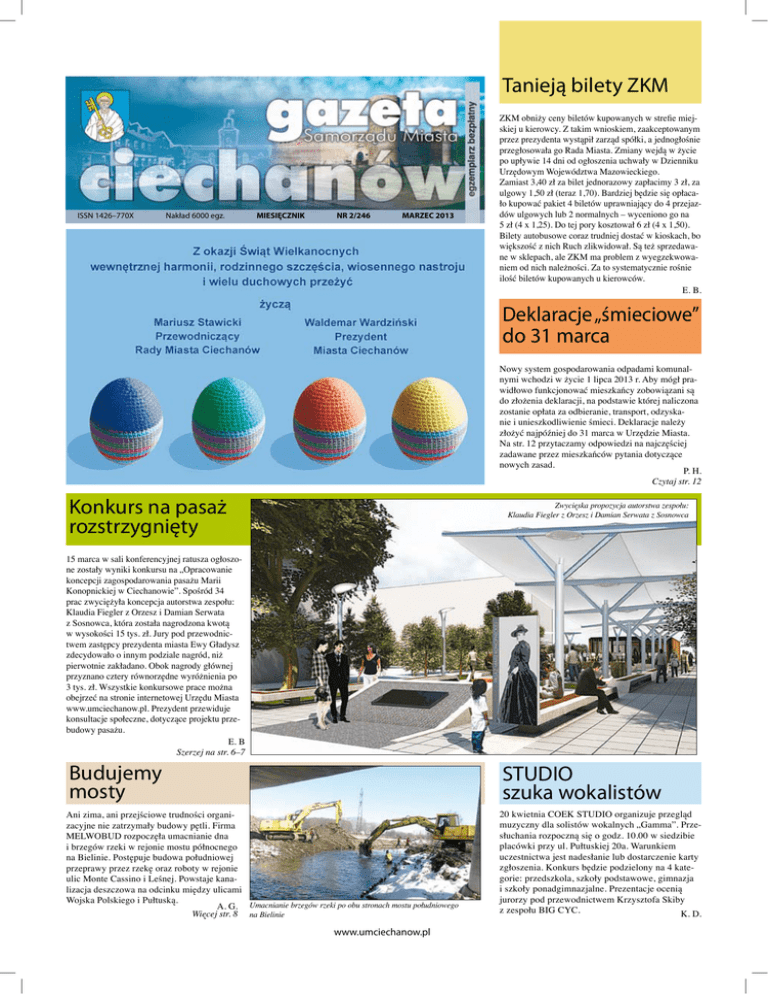 Tanieją bilety ZKM ISSN 1426–770X Nakład 6000 egz. MIESIĘCZNIK NR 2/246 MARZEC 2013 ZKM obniży ceny biletów kupowanych w strefie miejskiej u kierowcy. Z takim wnioskiem, zaakceptowanym przez prezydenta wystąpił zarząd spółki, a jednogłośnie przegłosowała go Rada Miasta. Zmiany wejdą w życie po upływie 14 dni od ogłoszenia uchwały w Dzienniku Urzędowym Województwa Mazowieckiego. Zamiast 3,40 zł za bilet jednorazowy zapłacimy 3 zł, za ulgowy 1,50 zł (teraz 1,70). Bardziej będzie się opłacało kupować pakiet 4 biletów uprawniający do 4 przejazdów ulgowych lub 2 normalnych – wyceniono go na 5 zł (4 x 1,25). Do tej pory kosztował 6 zł (4 x 1,50). Bilety autobusowe coraz trudniej dostać w kioskach, bo większość z nich Ruch zlikwidował. Są też sprzedawane w sklepach, ale ZKM ma problem z wyegzekwowaniem od nich należności. Za to systematycznie rośnie ilość biletów kupowanych u kierowców. E. B. Deklaracje „śmieciowe” do 31 marca Nowy system gospodarowania odpadami komunalnymi wchodzi w życie 1 lipca 2013 r. Aby mógł prawidłowo funkcjonować mieszkańcy zobowiązani są do złożenia deklaracji, na podstawie której naliczona zostanie opłata za odbieranie, transport, odzyskanie i unieszkodliwienie śmieci. Deklaracje należy złożyć najpóźniej do 31 marca w Urzędzie Miasta. Na str. 12 przytaczamy odpowiedzi na najczęściej zadawane przez mieszkańców pytania dotyczące nowych zasad. P. H. Czytaj str. 12 Konkurs na pasaż rozstrzygnięty Zwycięska propozycja autorstwa zespołu: Klaudia Fiegler z Orzesz i Damian Serwata z Sosnowca 15 marca w sali konferencyjnej ratusza ogłoszone zostały wyniki konkursu na „Opracowanie koncepcji zagospodarowania pasażu Marii Konopnickiej w Ciechanowie”. Spośród 34 prac zwyciężyła koncepcja autorstwa zespołu: Klaudia Fiegler z Orzesz i Damian Serwata z Sosnowca, która została nagrodzona kwotą w wysokości 15 tys. zł. Jury pod przewodnictwem zastępcy prezydenta miasta Ewy Gładysz zdecydowało o innym podziale nagród, niż pierwotnie zakładano. Obok nagrody głównej przyznano cztery równorzędne wyróżnienia po 3 tys. zł. Wszystkie konkursowe prace można obejrzeć na stronie internetowej Urzędu Miasta www.umciechanow.pl. Prezydent przewiduje konsultacje społeczne, dotyczące projektu przebudowy pasażu. E. B Szerzej na str. 6–7 Budujemy mosty STUDIO szuka wokalistów Ani zima, ani przejściowe trudności organizacyjne nie zatrzymały budowy pętli. Firma MELWOBUD rozpoczęła umacnianie dna i brzegów rzeki w rejonie mostu północnego na Bielinie. Postępuje budowa południowej przeprawy przez rzekę oraz roboty w rejonie ulic Monte Cassino i Leśnej. Powstaje kanalizacja deszczowa na odcinku między ulicami Wojska Polskiego i Pułtuską. A. G. Umacnianie brzegów rzeki po obu stronach mostu południowego Więcej str. 8 na Bielinie www.umciechanow.pl 20 kwietnia COEK STUDIO organizuje przegląd muzyczny dla solistów wokalnych „Gamma”. Przesłuchania rozpoczną się o godz. 10.00 w siedzibie placówki przy ul. Pułtuskiej 20a. Warunkiem uczestnictwa jest nadesłanie lub dostarczenie karty zgłoszenia. Konkurs będzie podzielony na 4 kategorie: przedszkola, szkoły podstawowe, gimnazja i szkoły ponadgimnazjalne. Prezentacje ocenią jurorzy pod przewodnictwem Krzysztofa Skiby z zespołu BIG CYC. K. D. Samorządu Miasta INFORMACJE Nowe władze hufca 16 lutego Zjazd Nadzwyczajny Hufca ZHP wybrał nowe władze. W wyniku głosowania komendantem hufca został Piotr Rzeczkowski. Wyłoniono też komisję rewizyjną. Członkami komendy zostali: Olga Dąbrowska, Anna Rzeczkowska, Krzysztof Piotrowski i Łukasz Niewiadomski. W obradach oprócz harcerzy uczestniczyli przedstawiciele lokalnych władz i instytucji (w tym Urzędu Miasta), które przez ostatnie 3 lata wspierały inicjatywę powołania hufca w Ciechanowie. Hufiec liczy 15 jednostek i zrzesza 160 harcerzy. Urząd Miasta włączył się do akcji „Godzina dla Ziemi” Jest to prosta idea, która szybko przerodziła się w największą na świecie inicjatywę społeczną. Miliony ludzi wyłączają światła na jedną godzinę tej samej nocy, aby zaoszczędzić energię i skupić się na tym, co łączy nas wszystkich – naszej planecie. W tym roku do akcji przyłączył się także ciechanowski samorząd. 23 marca na godzinę wyłączono oświetlenie ratusza. W latach ubiegłych w akcji wzięło udział ponad 500 miast na całym świecie, w tym 50 w Polsce. Dodatkowe 75 tys. zł na konkursy Potrzebujący dostaną na święta 8 ton żywności W dniach 15-17 marca Ciechanowski Bank Żywności wspólnie z organizacjami partnerskimi po raz pierwszy zorganizował Wielkanocną Zbiórkę Żywności. Produkty spożywcze zbierano w 36 sklepach na terenie Północnego Mazowsza. Uczestniczyło w niej 500 wolontariuszy. Efekt – 8 ton żywności. Zakupami można było podzielić się w 8 miejscowościach, w tym w Ciechanowie. Cukier, mąka, makaron, olej, ryż, konserwy i słodycze trafią do potrzebujących rodzin przed Wielkanocą. W zbiórkę zaangażowały się ciechanowskie organizacje pozarządowe: Chrześcijańskie Stowarzyszenie Dobroczynności, Akcja Katolicka, Towarzystwo Przyjaciół Dzieci, Stowarzyszenie Diabetyków, Stowarzyszenie Serce Matki, Stowarzyszenie dla Niepełnosprawnych oraz Polski Czerwony Krzyż. Ich pracę koordynowała Małgorzata Bartczak. Transport darów do magazynu Banku Żywności zapewniła Państwowa Wyższa Szkoła Zawodowa i Chrześcijańskie Stowarzyszenie Dobroczynności. W akcję włączyła się także młodzież licealna oraz uczniowie gimnazjów. XIX Ogólnopolskie Zawody w Pływaniu Szkół STO W dniach 5–7 kwietnia w pływalni „U–Ciecha” odbędą się XIX Ogólnopolskie Zawody w Pływaniu Szkół STO. Jak co roku weźmie w nich udział kilkaset zawodników ze szkół podstawowych, gimnazjalnych oraz ponadgimnazjalnych. Organizatorem Zawodów są: Społeczne Towarzystwo Oś