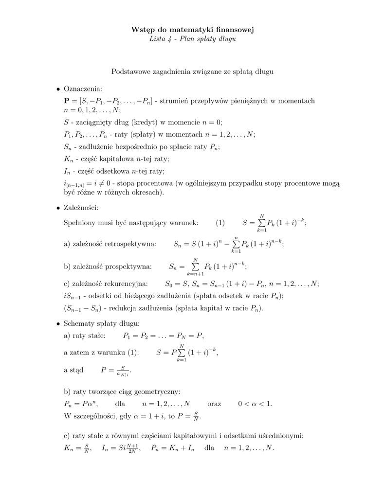 P1 , P2 , . . . , Pn - raty (spłaty) w momentach n = 1, 2, . . . , N ;