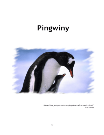 Pingwiny „Niemożliwe jest patrzenie na pingwina i odczuwanie złości” Joe Moore 1/3 Rozdział 1. Wstęp Pingwiny przez wielu uznawane są za zwierzęta komiczne, człowiek odnosi się do nich z sympatią i uznaniem. W tej pracy zastanowimy się nad przyczynami takiego podejścia ludzi do tych przemiłych nielotów. Rozdział 2. Czym jest pingwin Rodzina pingwinów obejmuje gatunki morskie (na lądzie pojawiają się jedynie w strefie brzegowej) zamieszkujące zimne morza półkuli południowej. Najliczniejsze wokół Antarktydy i sąsiednich wysp, najwięcej gatunków w pobliżu Nowej Zelandii. Najdalej na północ (na równiku) na Galapagos gnieździ się pingwin równikowy. Rozdział 3. Cechy charakterystyczne 1. długość od 20-30 do 120-140 cm; 2. silnie przesunięte ku tyłowi mocne nogi;.krótki, sztywny ogon, pełniący z nogami funkcję steru; 3. wąskie skrzydła pełniące funkcję płetw napędowych; 4. nielotne; 5. brzuch biały, grzbiet i głowa ciemna (czarna, granatowa, szara); 6. na lądzie chodzą w postawie wyprostowanej, bądź ślizgają się na brzuchu, odpychając się kończynami; 7. monogamiczne; 8. kolonijne (największe kolonie liczą do miliona osobników); 9. odżywiają się pokarmem zwierzęcym: rybami, głowonogami i skorupiakami, które zdobywają w morzu. Rozdział 4. Odniesienia do pingwinów w kulturze masowej Podrozdział 4.1. Pingwiny w kinie i telewizji Najczęściej pojawiającymi się gatunkami są: 1 ● pingwin cesarski 2 ● pingwin królewski 3 ● skocz grubodzioby (p. grubodzioby) Pingwiny pojawiają się głównie w filmach animowanych, przykładami takich filmów są: ● „Tupot małych stóp” ● „Na fali” 1 A ptenodytes forsteri 2 Aptenodytes patagonicus 3 Eudyptes pachyrhynchus 2/3 „Pingwin Pik-Pok” ● „Pingwin Pingu” Filmy dla dzieci nie są jednak jedynym miejscem gdzie zobaczyć można te przemiłe stworzenia. W kinach na całym świecie furorę zrobił ostatnio film „Marsz pingwinów”, zdobywając Oskara i 11 innych nagród. ● Podrozdział 4.2. Pingwiny w Internecie Chyba najbardziej popularnym pingwinem w Internecie jest Tux, maskotka systemu operacyjnego Linux. Zdaniem twórcy tego systemu ma on przypominać „objedzonego, zadowolonego z życia pingwina”. Rozdział 5. Przyczyny sympatii ludzko-pingwiniej Ludzka sympatia do pingwinów bierze się prawdopodobnie z fizycznego podobieństwa między ludźmi i tymi nielotami. Zdaniem psychologów w grę wchodzi tu nasz silny instynkt opiekuńczy. Drugą przyczyną może być podobieństwo zachowań. Wiele cech pingwinów, na przykład monogamię oraz życie w dużych stadach można zauważyć również w naszym społeczeństwie. Spis treści Rozdział 1. Wstęp.................................................................................................................................2 Rozdział 2. Czym jest pingwin.............................................................................................................2 Rozdział 3. Cechy charakterystyczne...................................................................................................2 Rozdział 4. Odniesienia do pingwinów w kulturze masowej...............................................................2 Podrozdział 4.1. Pingwiny w kinie i telewizji................................................................................. 2 Podrozdział 4.2. Pingwiny w Internecie.......................................................................................... 2 Rozdział 5. Przyczyny sympatii ludzko-pingwiniej............................................................................. 3 3/3