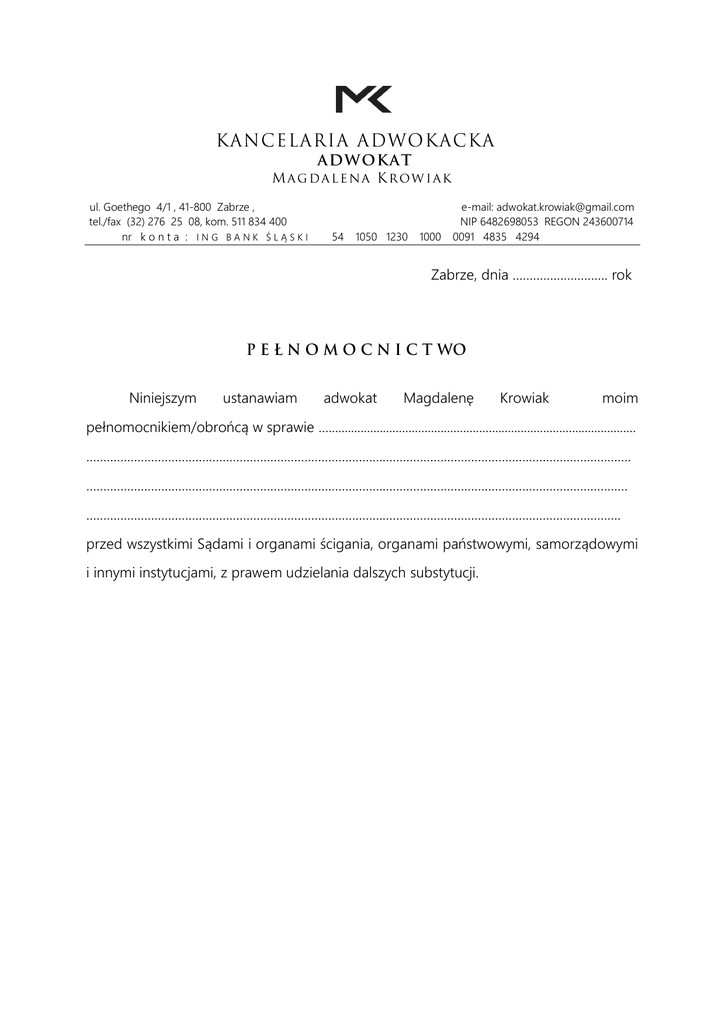 ul. Goethego 4/1 , 41-800 Zabrze , tel./fax (32) 276 25 08, kom. 511 834 400 nr k o n t a : I N G B A N K Ś L Ą S K I 54 1050 1230 1000 e-mail: [email protected] NIP 6482698053 REGON 243600714 0091 4835 4294 Zabrze, dnia ………………………. rok Niniejszym ustanawiam adwokat Magdalenę Krowiak moim pełnomocnikiem/obrońcą w sprawie …................................................................................................ ……………………………………………………………………………………………………………………………………………. …………………………………………………………………………………………………………………………………………… …………………………………………………………………………………………………………………………………………. przed wszystkimi Sądami i organami ścigania, organami państwowymi, samorządowymi i innymi instytucjami, z prawem udzielania dalszych substytucji.