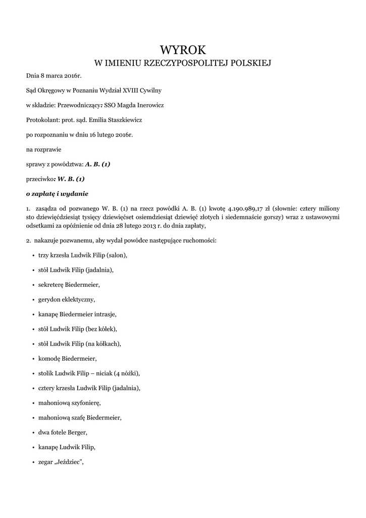 WYROK W IMIENIU RZECZYPOSPOLITEJ POLSKIEJ Dnia 8 marca 2016r. Sąd Okręgowy w Poznaniu Wydział XVIII Cywilny w składzie: Przewodniczący: SSO Magda Inerowicz Protokolant: prot. sąd. Emilia Staszkiewicz po rozpoznaniu w dniu 16 lutego 2016r. na rozprawie sprawy z powództwa: A. B. (1) przeciwko: W. B. (1) o zapłatę i wydanie 1. zasądza od pozwanego W. B. (1) na rzecz powódki A. B. (1) kwotę 4.190.989,17 zł (słownie: cztery miliony sto dziewięćdziesiąt tysięcy dziewięćset osiemdziesiąt dziewięć złotych i siedemnaście gorszy) wraz z ustawowymi odsetkami za opóźnienie od dnia 28 lutego 2013 r. do dnia zapłaty, 2. nakazuje pozwanemu, aby wydał powódce następujące ruchomości: • trzy krzesła Ludwik Filip (salon), • stół Ludwik Filip (jadalnia), • sekreterę Biedermeier, • gerydon eklektyczny, • kanapę Biedermeier intrasje, • stół Ludwik Filip (bez kółek), • stół Ludwik Filip (na kółkach), • komodę Biedermeier, • stolik Ludwik Filip – niciak (4 nóżki), • cztery krzesła Ludwik Filip (jadalnia), • mahoniową szyfonierę, • mahoniową szafę Biedermeier, • dwa fotele Berger, • kanapę Ludwik Filip, • zegar „Jeździec”, • zegar „Boulle Chińczyk”, • zegar „Gigant”, • parawan, • sekretarzyk Napoleon III, • stolik Galle, • witrynę Napoleon III, • gerydon Napoleon III, • pomocnik Napoleon III, • półkę Biedermeier z pracy, • sofę Lph w papugi, • lampę sufit (pokój muzyczny), • lampę marmur, • popiersie z marmuru, • czarną kolumnę, • lustro i konsolę, • lustro Sopot, • 2 kinkiety (salon), • Lampę sufit – kryształ (kominkowy), • słupek kolumny LPh, 1. w pozostałej części powództwo oddala; 2. kosztami procesu obciąża strony stosunkowo: powódkę w 14 %, a pozwanego w 86 % i z tego tytułu: a) zasądza od pozwanego na rzecz powódki kwotę 98.536,22 zł tytułem zwrotu kosztów procesu, w tym kwotę 12.384 zł tytułem zwrotu kosztów zastępstwa procesowego, b) zasądza od powódki na rzecz pozwanego kwotę 2.018,38 zł tytułem zwrotu kosztów zastępstwa procesowego. /-/ SSO M. Inerowicz UZASADNIENIE W dniu 28 lutego 2013 r. do tut. Sądu wpłynął pozew A. B. (1) przeciwko W. B. (1) (rozszerzony pismem procesowym z dnia 2 czerwca 2014 r. oraz rozszerzony i sprecyzowany pismem procesowym z dnia 19 maja 2015 r.) o zasądzenie od pozwanego na rzecz powódki kwoty 4.893.158,02 zł wraz z ustawowymi odsetkami liczonymi od dnia wniesienia pozwu do dnia zapłaty, na którą to kwotę składają się następujące kwoty: • kwota 1.954.299,88 zł wraz z ustawowymi odsetkami od dnia wniesienia pozwu do dnia zapłaty tytułem należności głównych udzielonych i nierozliczonych pożyczek, • kwota 1.160.543,07 zł wraz z ustawowymi odsetkami od dnia wniesienia pozwu do dnia zapłaty tytułem odsetek od udzielonych pożyczek (łącznie wszystkie odsetki do dnia wniesienia pozwu), • kwota 750.000 zł wraz z ustawowymi odsetkami od dnia wniesienia pozwu do dnia zapłaty tytułem kwoty wypłaconej z rachunku bankowego powódki przez pozwanego w dniu 19 stycznia 2009 r.; • kwota 967.315,07 zł wraz z odsetkami do dnia wniesienia pozwu wraz z ustawowymi odsetkami od dnia wniesienia pozwu do dnia zapłaty tytułem rozliczenia „przedwstępnej umowy sprzedaży nieruchomości” z dnia 30 sierpnia 2005 r., • kwota 61.000 zł wraz z ustawowymi odsetkami od dnia wniesienia pozwu do dnia zapłaty stanowiącą równowartość obrazu Alberta Reigera „Rwący potok, ewentualnie nakazanie wydania ww. przedmiotu łącznie kwoty 4.893.158,02 zł oraz, po rozszerzeniu powództwa pismem z dnia 2 czerwca 2014r. (k. 1068-1070), o nakazanie pozwanemu wydania na rzecz powódki następujących ruchomości stanowiących własność powódki: - trzech krzeseł Ludwik Filip, - mahoniowego stołu Ludwik Filip ok. 1880 r., - sofy - sekretery Biedermeier z ok. 1830 r., - gerydonu eklektycznego, - kanapy Biedermeier; - stołu Ludwik Filip bez kółek; - stołu Ludwik Filip na kółkach; - stołu Ludwik Filip (mahoń), - komody Biedermeier; - stolika Ludwik Filip (niciak) ok. 1860 r., - stolika Ludwik Filip (niciak), - komody Biedermeier; - czterech krzeseł Ludwik Filip; - mahoniowej szyfoniery; - mahoniowej szafy Biedermeier; - dwóch foteli Berger; - kanapy Ludwik Filip; - zegara „Jeździec” ; - zegara „ Bulle” Chińczyk, - zegara „Gigant” ; - parawanu; - sekretarzyka N III; - niciaka Lph; - stolika Galle; - witryny N III; - gerydonu N III; - pomocnika N III; - półki Biedermeier z pracy; - sofy Lpg w papugi; - lampy sufit; - lampy z marmuru; - popiersia marmur; - czarnej kolumny; - lustra konsoli; - lustra Sopot; - kinkietów salon; - lampy sufit kominkowy; - słupka kolumny Lph; ewentualnie zasądzenia od pozwanego na rzecz powódki kwoty 264.056,80 zł wraz z odsetkami od dnia doręczenia pisma z dnia 2 czerwca 2014 r. do dnia zapłaty. W uzasadnieniu pozwu powódka podała, iż strony są małżeństwem w trakcie sprawy rozwodowej. Jeszcze przed zawarciem związku małżeńskiego w dniu 26 sierpnia 2003 r. strony zawarły umowę majątkową małżeńską wyłączającą wspólność ustawową majątku nabytego przez oboje lub jednego z nich po zawarciu związku małżeńskiego. Przed, jak i w trakcie trwania związku małżeńskiego powódka dokonywała zakupu antyków, które stanowiły wyposażenie domu przy ul. (...) w P., w którym strony zamieszkiwały i w którym obecnie zamieszkuje wyłącznie pozwany. Powódka oszacowała wartość tych ruchomości ostatecznie na kwotę 264.056,80 zł i domagała się ich wydania na podstawie art. 222 § 1 k.c., ewentualnie o zasądzenie ww. kwoty na jej rzecz. Nadto w latach 2006 – 2011 powódka zawarła z pozwanym jako pożyczkobiorcą osiem umów pożyczek na łączną kwotę 3.000.000 zł. Powódka wskazała, że pozwany zwrócił jej kwoty, które zostały przez nią zaliczone na poczet całkowitej spłaty pożyczki nr