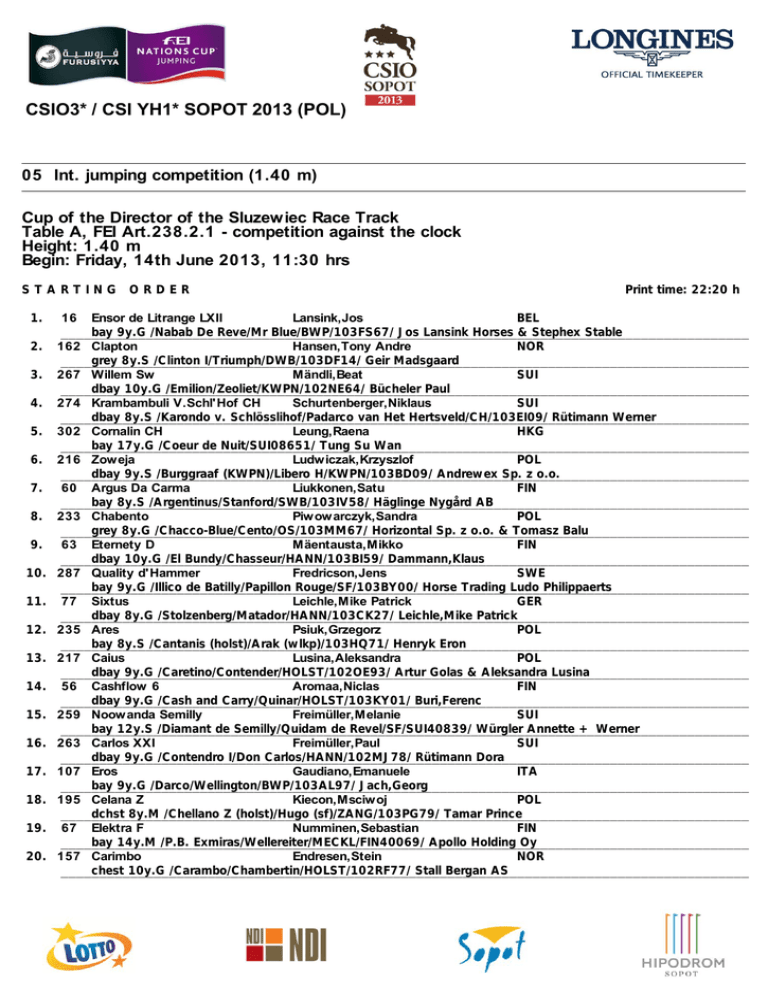 CSIO3* / CSI YH1* SOPOT 2013 (POL) 05 Int. jumping competition (1.40 m) Cup of the Director of the Sluzewiec Race Track Table A, FEI Art.238.2.1 - competition against the clock Height: 1.40 m Begin: Friday, 14th June 2013, 11:30 hrs STARTING ORDER 1. 2. 3. 4. 5. 6. 7. 8. 9. 10. 11. 12. 13. 14. 15. 16. 17. 18. 19. 20. Print time: 22:20 h 16 Ensor de Litrange LXII Lansink,Jos BEL _________________________________________________________________________________________ bay 9y.G /Nabab De Reve/Mr Blue/BWP/103FS67/ Jos Lansink Horses & Stephex Stable 162 Clapton Hansen,Tony Andre NOR _________________________________________________________________________________________ grey 8y.S /Clinton I/Triumph/DWB/103DF14/ Geir Madsgaard 267 Willem Sw Mändli,Beat SUI _________________________________________________________________________________________ dbay 10y.G /Emilion/Zeoliet/KWPN/102NE64/ Bücheler Paul 274 Krambambuli V.Schl'Hof CH Schurtenberger,Niklaus SUI _________________________________________________________________________________________ dbay 8y.S /Karondo v. Schlösslihof/Padarco van Het Hertsveld/CH/103EI09/ Rütimann Werner 302 Cornalin CH Leung,Raena HKG _________________________________________________________________________________________ bay 17y.G /Coeur de Nuit/SUI08651/ Tung Su Wan 216 Zoweja Ludwiczak,Krzyszlof POL _________________________________________________________________________________________ dbay 9y.S /Burggraaf (KWPN)/Libero H/KWPN/103BD09/ Andrewex Sp. z o.o. 60 Argus Da Carma Liukkonen,Satu FIN _________________________________________________________________________________________ bay 8y.S /Argentinus/Stanford/SWB/103IV58/ Häglinge Nygård AB 233 Chabento Piwowarczyk,Sandra POL _________________________________________________________________________________________ grey 8y.G /Chacco-Blue/Cento/OS/103MM67/ Horizontal Sp. z o.o. & Tomasz Balu 63 Eternety D Mäentausta,Mikko FIN _________________________________________________________________________________________ dbay 10y.G /El Bundy/Chasseur/HANN/103BI59/ Dammann,Klaus 287 Quality d'Hammer Fredricson,Jens SWE _________________________________________________________________________________________ bay 9y.G /Illico de Batilly/Papillon Rouge/SF/103BY00/ Horse Trading Ludo Philippaerts 77 Sixtus Leichle,Mike Patrick GER _________________________________________________________________________________________ dbay 8y.G /Stolzenberg/Matador/HANN/103CK27/ Leichle,Mike Patrick 235 Ares Psiuk,Grzegorz POL _________________________________________________________________________________________ bay 8y.S /Cantanis (holst)/Arak (wlkp)/103HQ71/ Henryk Eron 217 Caius Lusina,Aleksandra POL _________________________________________________________________________________________ dbay 9y.G /Caretino/Contender/HOLST/102OE93/ Artur Golas & Aleksandra Lusina 56 Cashflow 6 Aromaa,Niclas FIN _________________________________________________________________________________________ dbay 9y.G /Cash and Carry/Quinar/HOLST/103KY01/ Buri,Ferenc 259 Noowanda Semilly Freimüller,Melanie SUI _________________________________________________________________________________________ bay 12y.S /Diamant de Semilly/Quidam de Revel/SF/SUI40839/ Würgler Annette + Werner 263 Carlos XXI Freimüller,Paul SUI _________________________________________________________________________________________ dbay 9y.G /Contendro I/Don Carlos/HANN/102MJ78/ Rütimann Dora 107 Eros Gaudiano,Emanuele ITA _________________________________________________________________________________________ bay 9y.G /Darco/Wellington/BWP/103AL97/ Jach,Georg 195 Celana Z Kiecon,Msciwoj POL _________________________________________________________________________________________ dchst 8y.M /Chellano Z (holst)/Hugo (sf)/ZANG/103PG79/ Tamar Prince 67 Elektra F Numminen,Sebastian FIN _________________________________________________________________________________________ bay 14y.M /P.B. Exmiras/Wellereiter/MECKL/FIN40069/ Apollo Holding Oy 157 Carimbo Endresen,Stein NOR _________________________________________________________________________________________ chest 10y.G /Carambo/Chambertin/HOLST/102RF77/ Stall Bergan AS 21. 119 Abracadabra Turchetto,Roberto ITA _________________________________________________________________________________________ bay 8y.G /Numero Uno/Orame/KWPN/103GL08/ P.Coolen 22. 229 Nanu Nana Okla,Krzysztof POL _________________________________________________________________________________________ bay 15y.M /Calido I/Alcatraz/HOLST/GER40330/ Andrzej Okla 23. 111 Loro Piana Princesse Raye Kainich,Davide ITA _________________________________________________________________________________________ grey 10y.M /Mr. Blue/Major de la Cour/SF/102VC39/ D&d Srl 24. 126 Exclusive al Sharbatly,Abdullah KSA _________________________________________________________________________________________ bay 12y.M /Emilion/Bergerac/KWPN/NED40507/ Dhr. J. Heins 25. 40 Carinjon Andersen,Lars Bak DEN _________________________________________________________________________________________ bay 8y.G /Carinjo/Newton/HOLST/104AF74/ Rijkens,Tjeert 26. 128 Grenoblis Jasas,Stasys LTU _________________________________________________________________________________________ chest 10y.S /Heleris/Versal/TRAK/102RB82/ Ltd 'Zukra'/ Viktorija Navickaite 27. 188 Che Guevara L Gramza,Leszek POL _________________________________________________________________________________________ bay 8y.S /Cassini I/Contender/HOLST/102ZD07/ Jan Ludwiczak 28. 167 Brooker's Brooklyn Meland,Ole Kristoffer NOR _________________________________________________________________________________________ bay 13y.G /Animo/NOR02292/ Skogan Stutteri 29. 300 Lanuvio Siyahi,Efe TUR _________________________________________________________________________________________ bay 12y.G /Lancer II/Alcatraz/HOLST/102RI36/ Efe Siyahi 30. 155 Zanzibar Djupvik,Morten NOR __________________________________________________________
