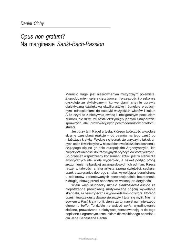 Daniel Cichy Opus non gratum? Na marginesie Sankt-Bach-Passion Mauricio Kagel jest niezrównanym muzycznym polemistą. Z upodobaniem spiera się z twórcami przeszłości i przekornie dyskutuje ze stylistycznymi konwencjami, chętnie uprawia dialektyczną dźwiękową ekwilibrystykę i żongluje erudycyjnymi odniesieniami do estetyki wszystkich wieków i kultur. A że czyni to z niebywałą swadą i inteligentnym poczuciem humoru, nie dziwi, że został okrzyknięty jednym z najbardziej sprawnych, ale i prowokacyjnych postmodernistów przełomu stuleci. Jest przy tym Kagel artystą, którego twórczość wywołuje skrajne częstokroć reakcje – od peanów na jego cześć po miażdżącą krytykę. Wydaje się jednak, że przyczyna tak skrajnych ocen tkwi nie tylko w nieszablonowości działań doskonale czującego się na gruncie europejskim Argentyńczyka, ich nieprzystawalności do tradycyjnych pryncypiów estetycznych. Bo przecież współczesny konsument sztuki jest w stanie dla artystycznych idei wiele wycierpieć, a nawet podjąć próbę zrozumienia najbardziej awangardowych ich odmian. Rzecz raczej w łatwości, z jaką artysta szarga świętości, szokuje, przekracza granice dobrego smaku, wywołując z jednej strony u odbiorców zorientowanych konwencjonalnie bezradność, z drugiej obawę przed obnażeniem własnej pruderyjności. Wielu więc słuchaczy uznało Sankt-Bach-Passion za niepotrzebną prowokację motywowaną chęcią wywołania skandalu, za bezużyteczną wypowiedź kompozytora, którego prześmiewcze gesty dawno się zużyły. I tutaj się mylili. Nie ma bowiem w Pasji krzty ironii, cienia żartu, nawet najmniejszego elementu buffo. To dzieło na wskroś seria, wyrafinowanie złożone, prowadzone z niebywałą konsekwencją, a do tego napisane z ogromnym szacunkiem dla wielbionego podmiotu, dla Jana Sebastiana Bacha. © resfactanova.pl Poznawanie muzyki niemieckiego twórcy następowało u Kagela stopniowo. Zrazu po przyjeździe do Europy zauważył, że kultura muzyczna jest ze wszech miar nasiąknięta dźwiękami lipskiego kantora, zaś motywiczny topos b-a-c-h niezmiennie od trzech stuleci fascynuje twórców każdej rangi, zarówno kompozytorskich geniuszy, jak i muzycznych wyrobników. Bez względu na kontekst historyczny czy wyznawaną doktrynę estetyczną, klasycy i romantycy, piewcy nowej rzeczowości i dodekafoniści, wynalazcy „neo-” i „post-”, jazzmeni i gwiazdy pop, niczym w ekumenicznym geście, do Bachowskiego źródła powracali i – jak można się domyślać – powracać będą. Bach jest wszak – zdaje się mówić Kagel – dla wszystkich bodaj ikoną, która zachwyca swoim pięknem i doskonałością, najpełniejszym odbiciem etosu artysty naznaczonego talentem umożliwiającym odnalezienie nieskazitelnej równowagi między tym, co w sztuce duchowe i ulotne, a tym, co racjonalne i wymierne. Również dla niego muzyka niemieckiego twórcy jest punktem odniesienia – wystarczy wspomnieć liczne do niej nawiązania, jawiąc się nierzadko bardziej jako abstrakcyjna idea, przedmiot kultu, aniżeli dzieło skreślone przez człowieka z krwi i kości, uwikłanego w rzeczywistość, zarabiającego pisaniem dźwięków na chleb. Nieprzypadkowo esej popełniony w trzechsetną rocznicę urodzin Bacha Kagel zatytułował An Gott zweifeln – an Bach glauben („Wątpić w Boga – wierzyć w Bacha”). To wyzywające zdanie dobitnie wskazuje na pełen atencji – przez jednych uznany za bałwochwalczy, przez innych nieco groteskowy – stosunek do spuścizny wielkiego Niemca, owego artystycznego (już niereligijnego) Absolutu. Igrając w Sankt-Bach-Passion z tradycją, dokonując w archetypie gatunku śmiałej zamiany postaci Jezusa Chrystusa na Bacha i uśmiercając tego drugiego na „krzyżu biurokracji”, Kagel jednak nie tyle wyniósł na ołtarz uwielbienia samego kompozytora, co złożył hołd sztuce w ogóle. Podjął przy tym próbę sformułowania muzycznej teologii, stworzenia substytutu rugowanej z życia społecznego zachodniej Europy wiary w Boga. Wpisał się tym samym w modne w XIX i XX wieku koncepcje utożsamienia artystycznej aktywności z religią, wiązania muzyki z katarktycznym misterium. Ale nie tylko. Kagel, zrzucając kostium klauna, wiecznego ironisty oraz prześmiewcy i przywdziewając włosiennicę, przyznaje także pośrednio rację natchnionym romantykom, którzy w kompozytorach widzieli ucieleśnienie jednostek wybitnych, owych geniuszy, nadludzi obdarowanych mistycznymi doznaniami. * Kagel twierdzi, że nie mógłby tak przewrotnej pasji napisać, gdyby nie został wychowany w duchu południowoamerykańskiego katolicyzmu – z jego bogatym zbiorem ludycznych inkrustacji oraz swoistą autentycznością i bezpośredniością religijnego doświadczenia. Być może i prawykonanie nie mogłoby się odbyć w innym kraju niż Niemcy, w tej zsekularyzowanej kolebce protestantyzmu. Bo skoro nawet uchodząca za wykształconą oraz odporną na światopoglądowe wstrząsy niemiecka publiczność nie pozostała wobec propozycji Kagela obojętna, strach pomyśleć, co działoby się podczas, a najpewniej na długo przed polską premierą utworu… 32 © resfactanova.pl