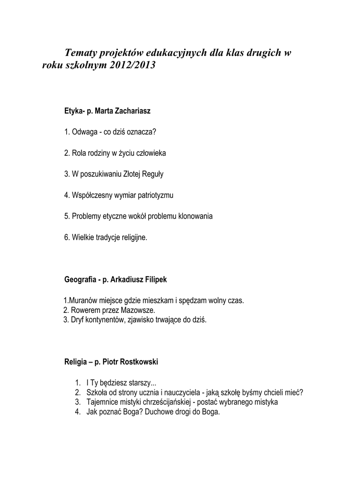 Tematy projektów edukacyjnych dla klas drugich w roku szkolnym 2012/2013 Etyka- p. Marta Zachariasz 1. Odwaga - co dziś oznacza? 2. Rola rodziny w życiu człowieka 3. W poszukiwaniu Złotej Reguły 4. Współczesny wymiar patriotyzmu 5. Problemy etyczne wokół problemu klonowania 6. Wielkie tradycje religijne. Geografia - p. Arkadiusz Filipek 1.Muranów miejsce gdzie mieszkam i spędzam wolny czas. 2. Rowerem przez Mazowsze. 3. Dryf kontynentów, zjawisko trwające do dziś. Religia – p. Piotr Rostkowski 1. 2. 3. 4. I Ty będziesz starszy... Szkoła od strony ucznia i nauczyciela - jaką szkołę byśmy chcieli mieć? Tajemnice mistyki chrześcijańskiej - postać wybranego mistyka Jak poznać Boga? Duchowe drogi do Boga. Wychowanie fizyczne- p. Ewa Materska 1.Organizujemy i przeprowadzamy mistrzostwa Gimnazjum 37 w piłce siatkowej. 2.Warszawscy wielcy sportowcy - olimpijczycy - zdobywcy medali Igrzysk Olimpijskich. 3. Planujemy i organizujemy wycieczkę po ciekawych miejscach związanych ze sportem w Warszawie. Język polski –p. Monika Sukiennik-Załęska 1.Mass media wokół nas ! (Zapoznanie się z działalnością lokalnej prasy, telewizji, poznanie dziennikarzy, nagranie przez uczniów własnego programu na wybrany temat i jego publiczna prezentacja) 2.Jaki spektakl teatralny zainteresowałby współczesnego nastolatka?( Redagowanie utworu dramatycznego i wystawienie go na scenie) 3.Poezja w piosence, czyli o twórczości Agnieszki Osieckiej. 4.Co nam daje wolontariat, dlaczego warto pomagać innym? 1. „ Matma mnie kręci ” – Celem projektu jest promocja nauk ścisłych wśród młodzieży. Matematyka-p. Kinga Karaś 1.Co w matematyce pociąga Cię najbardziej – film 2. Od Stagiry, Syrakuzy po Ateny z matmą wieczne są ”problemy” â projekt naukowy poświęcony trzem starożytnym filozofom: Platonowi, Archimedesowi i Arystotelesowi, prezentacji ich życia, poglądów oraz wpływie na współczesną myśl matematyczną. 3. Magia pewnej dwuwymiarowej, zwartej, rozmaitości - wstęga Möbiusa. 4. Czy Tales się nie boi zmierzyć wysokość sekwoi? â rozważania wokół życia i dokonań naukowych Talesa z Miletu. Język polski- p. Justyna Mokrzyńska 1.Sławni ludzie swoich epok- od starożytności do współczesności. 2.Od scenariusza do spektaklu- jak powstaje przedstawienie teatralne. 3.Tworzymy gazetkę klasową lub szkolną. 4.Kto czyta, nie błądzi- projekt dotyczy fascynacji czytelniczych. 5.Kto szuka, nie błądzi- tworzenie szkolnego słownika terminów literackich i kulturowych z pojęć poznanych na lekcjach. 6.Sztuka przemawiania- projekt dotyczący sztuki oratorskiej. 7.Szukam nauczyciela i mistrza. O autorytetach dla młodego człowieka. Matematyka – p. Dorota Wardacka 1.Świat wielościanów - origami modułowe. 2. Śladami Pitagorasa. 3. Mozaiki i parkietaże. 4. Bryly wokół mnie. 5. Ciekawe liczby. Język polski – p. Małgorzata Madejska 1. Historia jednej ulicy Muranowa. 2. W. Szekspir i jego teatr. 3. Bestiarium A. Sapkowskiego. 4. „Co słonko widziało…” Życie na moim podwórku. 5. Absurdy PRL-u w twórczości S. Mrożka. Język angielski – p. Dominika Zakrzewska 1.Najciekawsze miejsca w Wielkiej Brytanii. 2.Przewodnik po Londynie. 3.Zwyczaje i tradycje w Wielkiej Brytanii. 4.Przysłowia i powiedzenia angielskie. 5.Angielski brytyjski vs amerykański. Matematyka – p. Jolanta Ścibura 1.Historia zera. 2. Ludolfina 3. Symetria w przyrodzie. 4. Złoty podział. Język Niemiecki- p. Anna Burakowska 1. 2. 3. Niemcy w Europie na przestrzeni wieków. Wiedeń – miasto muzyki. Historia i kultura Szwajcarii. 4. Rola Instytutu Goethego w propagowaniu kultury i języka niemieckiego. 5. Bundesliga. Piłka nożna w Niemczech. 6.Współczesna niemiecka muzyka rozrywkowa Historia –p. Urszula Sergiej 1. Bohater walczący o utrzymanie polskości. 2. Kobiety w Powstaniu Warszawskim 3. Warszawa wielu wyznań. 4. Zbrojne wystąpienia w Warszawie w XIX i I pół. XX wieku. 5. Siedmiu wspaniałych. Język Hiszpański – p. Natalia Hukowska/Martyna Połeć 1. Hiszpańskojęzyczni sławni artyści 2. Na tropie zabytków prekolumbijskich cywilizacji 3. W którym hiszpańskim lub latynoamerykańskim mieście chciałbyś zamieszkać? 4. Współczesne problemy społeczne w Ameryce Południowej 5. Stereotypy hiszpańskie 6. Różnice między Światami Bożego Narodzenia w Polsca a Hiszpanii Język angielski- p. Aneta Kornet Nauka i technika: a. b. c. d. Nowoczesne wynalazki, Technologia informatyczna, Rozrywka, Tworzywa, e. f. Komputery i sprzęt elektroniczny, Podawanie instrukcji obsługi. 6. Życie rodzinne i towarzyskie: a. Opis typowego dnia, b. Sposoby spędzania wolnego czasu, c. Rodzina, d. Święta i uroczystości rodzinne, e. Potrawy świąteczne 7. Nauka języków obcych w warszawskich gimnazjach : a. Rodzaje nauczanych języków obcych, b. Tygodniowa liczba godzin, c. Liczba osób uczących się poszczególnych języków, d. Najbardziej/najmniej popularne języki obce nauczane w szkołach, e. Ciekawe metody nauczania i uczenia się języków obcych Języka polski- p. Dorota Pazik-Wójcicka 1. Z wizytą u króla Stasia .... (oświecenie w Polsce) 2. I love Warsaw (filmy i piosenki poświęcone naszej stolicy) 3. Śladami bohaterów "Kamieni na szaniec" A. Kamińskiego. 4. Jak I.Krasicki realizował zasadę "uczyć-bawiąc" ? 5. O czym mówią warszawskie pomniki ? 6. Od herosa do pantoflarza. Portrety mężczyzn w wybranych utworach literatury polskiej. 7. Mój monodram. 8. Ekspansja języków obcych na język polski XXI wieku. Wychowanie fizyczne – p.Jacek Wieczorek 1) Czy każdy z nas może zostać słynnym sportowcem 2) Co zrobić aby poprawić kondycję fizyczną 3) Jedno miasto dwa klubu 4) Pokonywanie słabości- polscy sportowcy na Igrzyskach paraolimpijskich Język angielski – p. Aneta Karasek 1.British vs American English 2. GB - food and drink 3. School magazine 4. English speaking countries Język angielski – p. Agata Cie