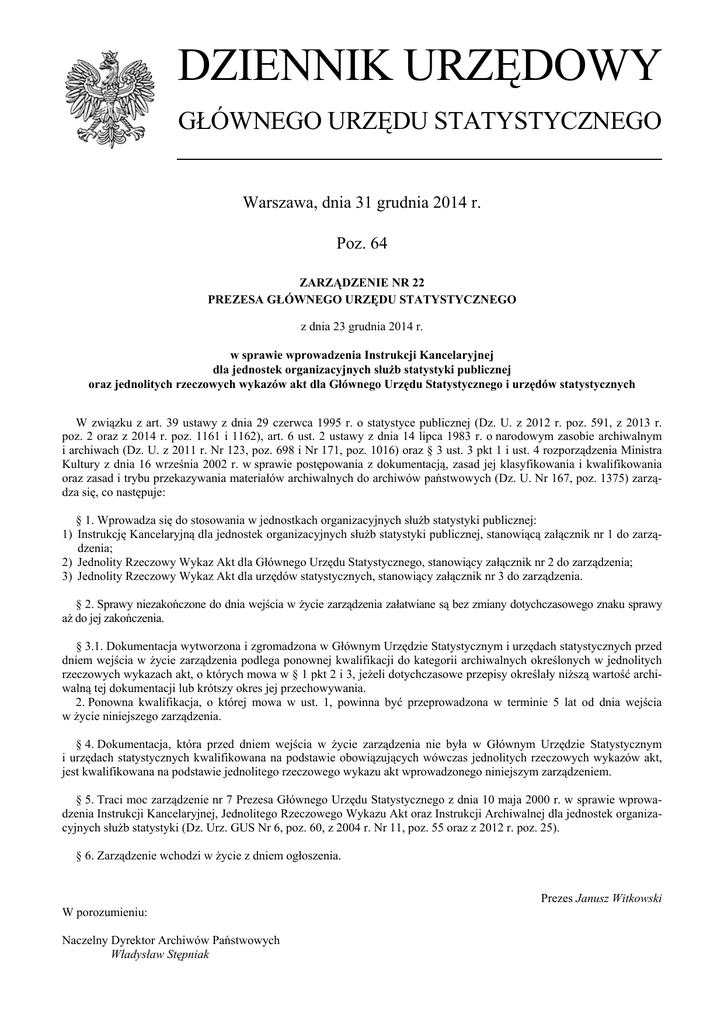 DZIENNIK URZĘDOWY GŁÓWNEGO URZĘDU STATYSTYCZNEGO Warszawa, dnia 31 grudnia 2014 r. Poz. 64 ZARZĄDZENIE NR 22 PREZESA GŁÓWNEGO URZĘDU STATYSTYCZNEGO z dnia 23 grudnia 2014 r. w sprawie wprowadzenia Instrukcji Kancelaryjnej dla jednostek organizacyjnych służb statystyki publicznej oraz jednolitych rzeczowych wykazów akt dla Głównego Urzędu Statystycznego i urzędów statystycznych W związku z art. 39 ustawy z dnia 29 czerwca 1995 r. o statystyce publicznej (Dz. U. z 2012 r. poz. 591, z 2013 r. poz. 2 oraz z 2014 r. poz. 1161 i 1162), art. 6 ust. 2 ustawy z dnia 14 lipca 1983 r. o narodowym zasobie archiwalnym i archiwach (Dz. U. z 2011 r. Nr 123, poz. 698 i Nr 171, poz. 1016) oraz § 3 ust. 3 pkt 1 i ust. 4 rozporządzenia Ministra Kultury z dnia 16 września 2002 r. w sprawie postępowania z dokumentacją, zasad jej klasyfikowania i kwalifikowania oraz zasad i trybu przekazywania materiałów archiwalnych do archiwów państwowych (Dz. U. Nr 167, poz. 1375) zarządza się, co następuje: § 1. Wprowadza się do stosowania w jednostkach organizacyjnych służb statystyki publicznej: 1) Instrukcję Kancelaryjną dla jednostek organizacyjnych służb statystyki publicznej, stanowiącą załącznik nr 1 do zarządzenia; 2) Jednolity Rzeczowy Wykaz Akt dla Głównego Urzędu Statystycznego, stanowiący załącznik nr 2 do zarządzenia; 3) Jednolity Rzeczowy Wykaz Akt dla urzędów statystycznych, stanowiący załącznik nr 3 do zarządzenia. § 2. Sprawy niezakończone do dnia wejścia w życie zarządzenia załatwiane są bez zmiany dotychczasowego znaku sprawy aż do jej zakończenia. § 3.1. Dokumentacja wytworzona i zgromadzona w Głównym Urzędzie Statystycznym i urzędach statystycznych przed dniem wejścia w życie zarządzenia podlega ponownej kwalifikacji do kategorii archiwalnych określonych w jednolitych rzeczowych wykazach akt, o których mowa w § 1 pkt 2 i 3, jeżeli dotychczasowe przepisy określały niższą wartość archiwalną tej dokumentacji lub krótszy okres jej przechowywania. 2. Ponowna kwalifikacja, o której mowa w ust. 1, powinna być przeprowadzona w terminie 5 lat od dnia wejścia w życie niniejszego zarządzenia. § 4. Dokumentacja, która przed dniem wejścia w życie zarządzenia nie była w Głównym Urzędzie Statystycznym i urzędach statystycznych kwalifikowana na podstawie obowiązujących wówczas jednolitych rzeczowych wykazów akt, jest kwalifikowana na podstawie jednolitego rzeczowego wykazu akt wprowadzonego niniejszym zarządzeniem. § 5. Traci moc zarządzenie nr 7 Prezesa Głównego Urzędu Statystycznego z dnia 10 maja 2000 r. w sprawie wprowadzenia Instrukcji Kancelaryjnej, Jednolitego Rzeczowego Wykazu Akt oraz Instrukcji Archiwalnej dla jednostek organizacyjnych służb statystyki (Dz. Urz. GUS Nr 6, poz. 60, z 2004 r. Nr 11, poz. 55 oraz z 2012 r. poz. 25). § 6. Zarządzenie wchodzi w życie z dniem ogłoszenia. Prezes Janusz Witkowski W porozumieniu: Naczelny Dyrektor Archiwów Państwowych Władysław Stępniak Dziennik Urzędowy Głównego Urzędu Statystycznego —2— Poz. 64 Załącznik nr 1 do zarządzenia nr 22 Prezesa GUS z dnia 23 grudnia 2014 r. Instrukcja Kancelaryjna dla jednostek organizacyjnych służb statystyki publicznej ROZDZIAŁ 1 Przepisy ogólne § 1.1. Instrukcja Kancelaryjna, zwana dalej „instrukcją”, określa szczegółowe zasady i tryb wykonywania czynności kancelaryjnych w jednostkach statystyki publicznej oraz reguluje postępowanie w tym zakresie z wszelką dokumentacją, jeżeli przepisy prawa powszechnie obowiązującego nie stanowią inaczej: 1) począwszy od wpływu lub powstania dokumentacji wewnątrz jednostki organizacyjnej statystyki publicznej do momentu jej uznania za część dokumentacji w archiwum zakładowym lub przekazania do zniszczenia oraz 2) niezależnie od techniki jej wytwarzania, postaci fizycznej oraz informacji w niej zawartych. 2. Do bieżącego nadzoru nad prawidłowością wykonywania czynności kancelaryjnych, w szczególności w zakresie doboru klas z wykazu akt do załatwianych spraw, właściwego zakładania spraw i prowadzenia akt spraw, kierownik jednostki statystyki publicznej wyznacza koordynatora czynności kancelaryjnych. § 2.1. Przy użytkowaniu systemów teleinformatycznych dedykowanych do realizacji określonych spraw i dokumentacji o charakterze pomocniczym, napływającej i powstającej w związku z użytkowaniem tych systemów, stosuje się przepisy instrukcji. 2. Dokumentacji, o której mowa w ust. 1, nie ujmuje się w rejestrach przesyłek przychodzących, wychodzących i wewnętrznych, pod warunkiem że w systemach teleinformatycznych możliwa jest analogiczna rejestracja, jaką przewidziano dla tych rejestrów. § 3. Użyte w instrukcji określenia oznaczają: 1) akceptacja — wyrażenie zgody przez osobę uprawnioną dla sposobu załatwienia sprawy lub aprobatę treści pisma; 2) akta sprawy — całą dokumentację, w szczególności: tekstową, fotograficzną, rysunkową, dźwiękową, filmową, multimedialną, zawierającą informacje potrzebne przy rozpatrywaniu danej sprawy oraz odzwierciedlającą przebieg jej załatwiania i rozstrzygania; 3) archiwista — pracownika lub pracowników realizujących zadania archiwum zakładowego; 4) archiwum zakładowe — komórkę w jednostce organizacyjnej statystyki publicznej zajmującą się przejmowaniem dokumentacji niepotrzebnej do bieżących zadań, jej przechowywaniem, ewidencjonowaniem, udostępnianiem, brakowaniem dokumentacji niearchiwalnej oraz przekazywaniem materiałów archiwalnych do archiwum państwowego; 5) bezpieczny podpis elektroniczny — podpis określony w art. 3 pkt 2 ustawy z dnia 18 września 2001 r. o podpisie elektronicznym (Dz. U. z 2013 r. poz. 262). Dane w postaci elektronicznej opatrzone bezpiecznym podpisem elektronicznym weryfikowanym przy pomocy ważnego kwalifikowanego certyfikatu są równoważne pod względem skutków prawnych dokumentom opatrzonym podpisami w