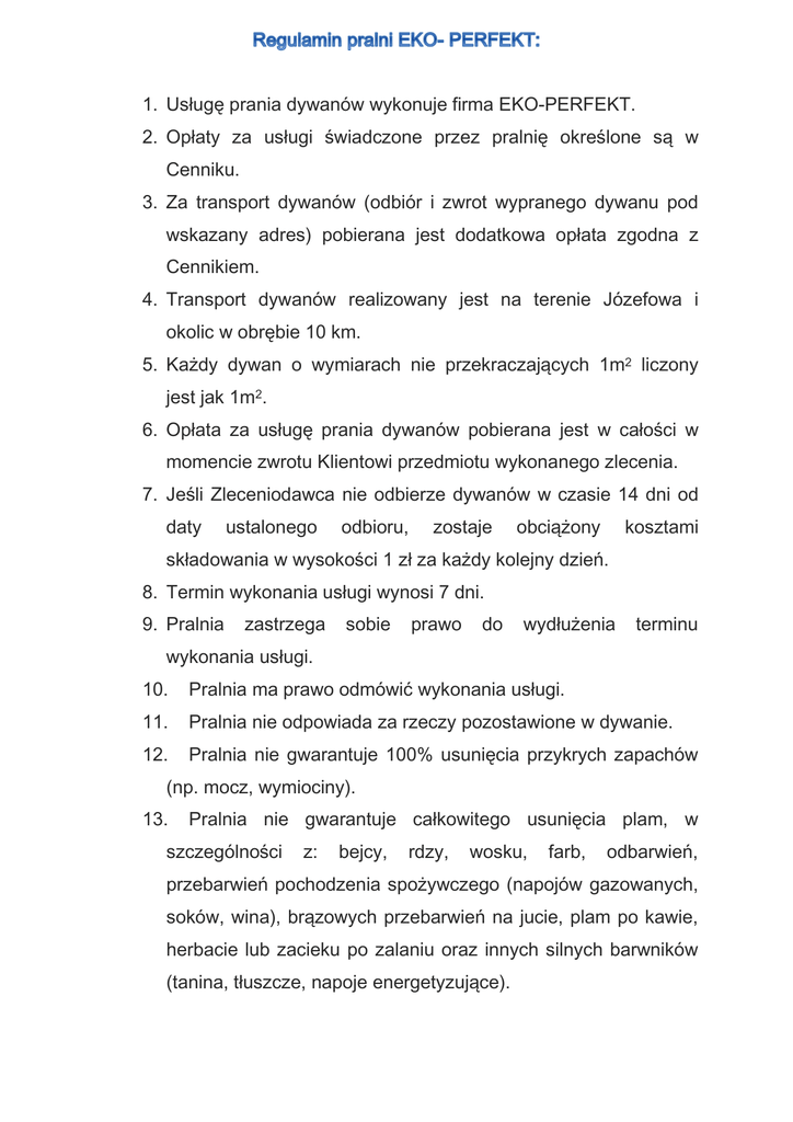 1. Usługę prania dywanów wykonuje firma EKO-PERFEKT. 2. Opłaty za usługi świadczone przez pralnię określone są w Cenniku. 3. Za transport dywanów (odbiór i zwrot wypranego dywanu pod wskazany adres) pobierana jest dodatkowa opłata zgodna z Cennikiem. 4. Transport dywanów realizowany jest na terenie Józefowa i okolic w obrębie 10 km. 5. Każdy dywan o wymiarach nie przekraczających 1m2 liczony jest jak 1m2. 6. Opłata za usługę prania dywanów pobierana jest w całości w momencie zwrotu Klientowi przedmiotu wykonanego zlecenia. 7. Jeśli Zleceniodawca nie odbierze dywanów w czasie 14 dni od daty ustalonego odbioru, zostaje obciążony kosztami składowania w wysokości 1 zł za każdy kolejny dzień. 8. Termin wykonania usługi wynosi 7 dni. 9. Pralnia zastrzega sobie prawo do wydłużenia terminu wykonania usługi. 10. Pralnia ma prawo odmówić wykonania usługi. 11. Pralnia nie odpowiada za rzeczy pozostawione w dywanie. 12. Pralnia nie gwarantuje 100% usunięcia przykrych zapachów (np. mocz, wymiociny). 13. Pralnia nie gwarantuje całkowitego usunięcia plam, w szczególności z: bejcy, rdzy, wosku, farb, odbarwień, przebarwień pochodzenia spożywczego (napojów gazowanych, soków, wina), brązowych przebarwień na jucie, plam po kawie, herbacie lub zacieku po zalaniu oraz innych silnych barwników (tanina, tłuszcze, napoje energetyzujące). 14. Przy oddawaniu dywanu do punktu pośredniczącego lub pralni, klient zobowiązany jest poinformować obsługę o wszelkich nietypowych zabrudzeniach dywanu, takich jak mocz, wymiociny czy pleśń. 15. Klient zobowiązany jest również do poinformowania obsługi punktu o wcześniejszym czyszczeniu dywanu ręcznie (środkami typu Vanish, Dywan Lux, itp.) oraz o ewentualnych uszkodzeniach. 16. Obszary o ciemniejszych odcieniach na chodnikach z włókna polipropylenowego oraz chodnikach typu shaggy są wynikiem uszkodzenia runa w czasie intensywnego użytkowania. Nie jest to jednocześnie błąd powstały w czasie prania dywanów. 17. Wpływ promieni UV powoduje, że dywany blakną tracąc swój oryginalny kolor. Po wypraniu różnice w kolorystyce dywanów mogą się dodatkowo pogłębić. 18. W przypadku zagubienia lub uszkodzenia powstałego z winy pralni EKO-PERFEKT, Klient otrzymuje stosowne odszkodowanie (max. do wysokości 300 zł.) Wyższe roszczenia realizowane są przez ubezpieczyciela. 19. Wszelkie roszczenia dotyczące usługi prania dywanów należy kierować do firmy EKO-PERFEKT lub punktu pośredniczącego. 20. Reklamacje należy kierować max. do 48 godzin od odbioru dywanu przez Klienta. 21. Reklamacje przyjmowane są wyłącznie w formie pisemnej i rozpatrywane są w ciągu 14 dni licząc od daty jej złożenia. 22. Podstawą do rozpatrzenia reklamacji jest posiadanie rachunku za wykonaną usługę. 23. Zgłoszenie reklamacji nie zwalnia z obowiązku zapłaty za usługę.