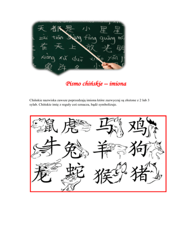 Pismo chińskie – imiona Chińskie nazwiska zawsze poprzedzają imiona które zazwyczaj są złożone z 2 lub 3 sylab. Chińskie imię z reguły coś oznacza, bądź symbolizuje. Imię mleczne To imię nadawane dziecku i używane na początku jego życia, na przykład Mały skarb (小寶/ 小宝). Chociaż rodzice mają miesiąc na rejestrację dziecka, imię mleczne używane jest przez kilka lat. Imię osobiste W języku chińskim każdy znak chińskiego pisma może posłużyć jako składnik imienia, co teoretycznie daje miliony kombinacji. Istnieje jednak kilka zasad, które wybór ograniczają: Niestosowne jest użycie imienia znanej postaci, krewnego lub przodka; w niektórych rodach istnieje jednak tradycja powtarzania imion co kilka pokoleń. Czasami rodzice dbają, aby pewien znak był motywem przewodnim w imionach rodzeństwa, dobrym przykładem są tu słynne siostry Song; niekiedy znaki mogą się ze sobą kojarzyć, np. chłopiec o imieniu Sosna (松), gdyż drzewo to jest symbolem wytrwałości i długowieczności, zaś dziewczynka – Śliwa (梅), ponieważ jest to symbol piękna, Bardzo surowe zasady wyboru imion nakłada na Chińczyków astrologia. Każdemu imieniu można przypisać kombinację pięciu pierwiastków oraz yin i yang, która w zależności od horoskopu jest uważana za pomyślną lub złowróżbną. Tradycja konsultowania imienia u astrologa odżywa obecnie w ChRL, a nadal jest popularna w Hongkongu, na Tajwanie i w Singapurze. Imiona mężczyzn Mają się kojarzyć z siłą, mądrością, pracowitością, odwagą i innymi cechami, które chińska kultura tradycyjnie przypisuje mężczyznom. Czasem są nawiązaniami do dzieł klasycznej literatury. W okresie rewolucji kulturalnej popularne były imiona o rewolucyjnym wydźwięku. Np. Silny Kraj (強国) albo Wschodni Wiatr (東風, 东风). Dziś Chińczycy próbują zmieniać takie imiona, wywołują one bowiem takie skojarzenia, jak w Polsce Adolf. Na Tajwanie istnieje moda, aby w imieniu chłopca występował jeden ze znaków występujących w nazwie Republiki Chińskiej (中華民國). Imiona kobiet Bardzo często są używane nazwy kwiatów. W imionach żeńskich popularna jest również duplikacja znaków, np. Xiuxiu (秀秀) lub Lili (麗麗, 丽丽). Imię wiolonczelisty Yo-Yo Ma (馬友友 Mǎ Yǒuyǒu) jest tu znanym odstępstwem od tej reguły. Zi - imię publiczne Zi (字, wym. dzy) albo biaozi (表字, wym. piao-dzy) to rodzaj imienia używanego wyłącznie w życiu dorosłym, zwykle po ukończeniu 20. roku życia. Było ono wymieniane w miejscu imienia właściwego, zwykle po nazwisku. Miało być wyrazem dojrzałości i prestiżu. Używali go zazwyczaj wyłącznie mężczyźni, choć czasem posługiwały się nim także mężatki. Zi można było otrzymać od ojca i krewnych, lub wymyślić je sobie samemu. Miało oddawać charakter danej osoby. Dziś zi jest praktycznie nieużywane, do czego przyczynił się Ruch 4 Maja. Imię zachodnie Przyjmuje je wielu Chińczyków celem ułatwienia sobie kontaktów z cudzoziemcami. Najczęściej są to imiona anglojęzyczne. Imiona znanych Chińczyków Imion nigdy nie należy tłumaczyć dosłownie, również dlatego, że ze względu na wieloznaczność chińskich znaków są one często grą słów. Niemniej, ich znaczenie ma pewną rolę, gdyż wywołuje określone skojarzenia. Podane niżej tłumaczenia są zatem jedynie przybliżeniami ich chińskich konotacji i nie należy ich traktować jako tłumaczeń, lecz jedynie jako przykłady: Deng Xiaoping – 小平 Mały Pokój (w sensie spokój), Zhang Ziyi – 子怡 Radująca się [z] Syna/synów, Hu Jintao – 锦涛 Brokatowa Fala, Wen Jiabao – 家宝 Rodzinny/Domowy Skarb, Wong Kar-Wai – 家卫 Strażnik Rodziny/Domu, Yao Ming – 明 Jasny. Tradycyjne imiona są zwykle dwusylabowe, choć ostatnio panuje moda na imiona jednosylabowe, np. Yao Ming. Zgodnie z tradycją rodzice często starają się, żeby imiona rodzeństwa miały jeden znak wspólny. Taki układ miały m.in. imiona sióstr Song: Song Meiling, Song Qingling i Song Ailing. Jak zapisać swoje imię za pomocą chińskich znaków czyli tzw. tłumaczenie polskich imion na język chiński. Pierwszą, zasadniczą rzeczą, która należy wyjaśnić jest to, że… nie istnieje coś takiego jak tłumaczenie polskich imion na chińskie. MILENA MAŁGORZATA Sylwia – 茜尔维亚 Katarzyna – 卡塔热娜 Magdalena – 玛格达蕾娜 Monika – 莫妮卡 Kasia – 卡夏 Magda – 玛格达 Ania – 阿尼亚 W Chinach 93 miliony osób … nosi jedno nazwisko Wang, to się nazywa wielka rodzina. http://echiny.pl/e_jezyk_chinski/slownictwo/polskie-imiona/ https://www.google.pl/search?q=pismo+chi%C5%84skie+imiona https://pl.wikipedia.org/wiki/Chi%C5%84skie_nazwiska https://pl.wikipedia.org/wiki/Imiona_chi%C5%84skie http://www.imiona.net/ po-chinsku/ http://po-chinsku.pl/polskie-imiona-po-chinsku/page/4/