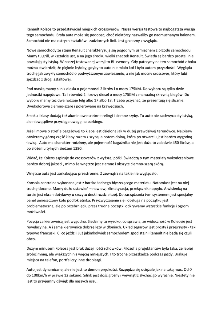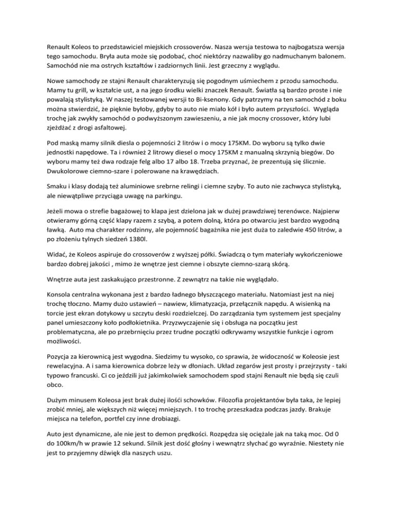 Renault Koleos to przedstawiciel miejskich crossoverów. Nasza wersja testowa to najbogatsza wersja tego samochodu. Bryła auta może się podobać, choć niektórzy nazwaliby go nadmuchanym balonem. Samochód nie ma ostrych kształtów i zadziornych linii. Jest grzeczny z wyglądu. Nowe samochody ze stajni Renault charakteryzują się pogodnym uśmiechem z przodu samochodu. Mamy tu grill, w kształcie ust, a na jego środku wielki znaczek Renault. Światła są bardzo proste i nie powalają stylistyką. W naszej testowanej wersji to Bi-ksenony. Gdy patrzymy na ten samochód z boku można stwierdzić, że pięknie byłoby, gdyby to auto nie miało kół i było autem przyszłości. Wygląda trochę jak zwykły samochód o podwyższonym zawieszeniu, a nie jak mocny crossover, który lubi zjeżdżać z drogi asfaltowej. Pod maską mamy silnik diesla o pojemności 2 litrów i o mocy 175KM. Do wyboru są tylko dwie jednostki napędowe. Ta i również 2 litrowy diesel o mocy 175KM z manualną skrzynią biegów. Do wyboru mamy też dwa rodzaje felg albo 17 albo 18. Trzeba przyznać, że prezentują się ślicznie. Dwukolorowe ciemno-szare i polerowane na krawędziach. Smaku i klasy dodają też aluminiowe srebrne relingi i ciemne szyby. To auto nie zachwyca stylistyką, ale niewątpliwe przyciąga uwagę na parkingu. Jeżeli mowa o strefie bagażowej to klapa jest dzielona jak w dużej prawdziwej terenówce. Najpierw otwieramy górną część klapy razem z szybą, a potem dolną, która po otwarciu jest bardzo wygodną ławką. Auto ma charakter rodzinny, ale pojemność bagażnika nie jest duża to zaledwie 450 litrów, a po złożeniu tylnych siedzeń 1380l. Widać, że Koleos aspiruje do crossoverów z wyższej półki. Świadczą o tym materiały wykończeniowe bardzo dobrej jakości , mimo że wnętrze jest ciemne i obszyte ciemno-szarą skórą. Wnętrze auta jest zaskakująco przestronne. Z zewnątrz na takie nie wyglądało. Konsola centralna wykonana jest z bardzo ładnego błyszczącego materiału. Natomiast jest na niej trochę tłoczno. Mamy dużo ustawień – nawiew, klimatyzacja, przełącznik napędu. A wisienką na torcie jest ekran dotykowy u szczytu deski rozdzielczej. Do zarządzania tym systemem jest specjalny panel umieszczony koło podłokietnika. Przyzwyczajenie się i obsługa na początku jest problematyczna, ale po przebrnięciu przez trudne początki odkrywamy wszystkie funkcje i ogrom możliwości. Pozycja za kierownicą jest wygodna. Siedzimy tu wysoko, co sprawia, że widoczność w Koleosie jest rewelacyjna. A i sama kierownica dobrze leży w dłoniach. Układ zegarów jest prosty i przejrzysty - taki typowo francuski. Ci co jeździli już jakimkolwiek samochodem spod stajni Renault nie będą się czuli obco. Dużym minusem Koleosa jest brak dużej ilośći schowków. Filozofia projektantów była taka, że lepiej zrobić mniej, ale większych niż więcej mniejszych. I to trochę przeszkadza podczas jazdy. Brakuje miejsca na telefon, portfel czy inne drobiazgi. Auto jest dynamiczne, ale nie jest to demon prędkości. Rozpędza się ociężale jak na taką moc. Od 0 do 100km/h w prawie 12 sekund. Silnik jest dość głośny i wewnątrz słychać go wyraźnie. Niestety nie jest to przyjemny dźwięk dla naszych uszu. Mocną strona Koleosa jest zestaw audio sygnowany znaczkiem Bose. Gra znakomicie. Bardzo przyjemny bass idący z bagażnika, ale też dobrze zestrojone są tony wysokie i średnie. System multimedialny to też jego zaleta. Mamy tu wejście AUX, USB i miejsce na kartę SD a nawet możemy odtwarzać filmy z pendriva lub dysku zewnętrznego. Renault Koleos ma bardzo dobrą widoczność w każdą stronę. Obserwowanie tego co dzieje się w około nie jest problemem. Natomiast auto jest mało zwrotne, co poczujemy podczas zawracania i manewrowania na zatłoczonym parkingu. Wielkie brawa dla francuzów za fotele i komfortowe zawieszenie, które dobrze wybiera nierówności i sprawia, że jeździ się przyjemnie i miękko. Renault Koleos to ciekawa propozycja dla tych, którzy szukają miejskiego SUV-a, ale nie po to, aby nim szpanować a po to, aby komfortowo podróżować. Spodoba się tym, którzy cenią dobre wykończenie wnętrza , ale i tym, którzy weekendy spędzają aktywnie i lubią zjechać z twardej asfaltowej drogi. A prawda jest taka, że Koleosa albo pokochamy, albo go znienawidzimy.