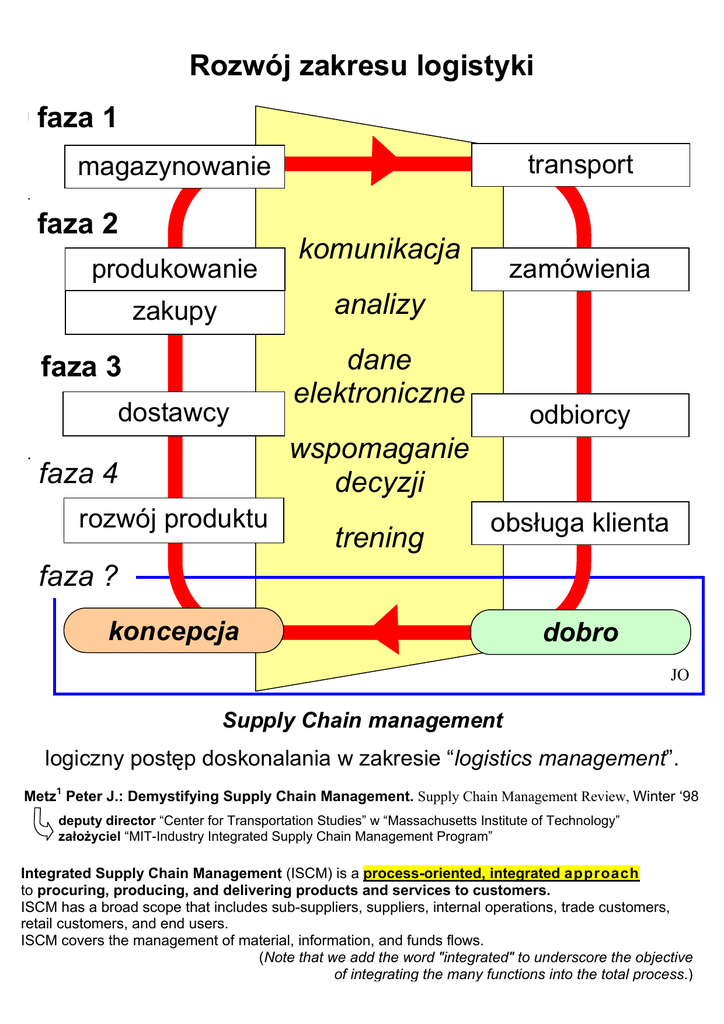 Rozwój zakresu logistyki faza 1 Faza 1. transport magazynowanie . faza 2 produkowanie zamówienia analizy zakupy faza 3 dostawcy . komunikacja dane elektroniczne odbiorcy wspomaganie decyzji faza 4 rozwój produktu trening obsługa klienta faza ? koncepcja dobro JO Supply Chain management logiczny postęp doskonalania w zakresie “logistics management”. Metz1 Peter J.: Demystifying Supply Chain Management. Supply Chain Management Review, Winter ‘98 deputy director “Center for Transportation Studies” w “Massachusetts Institute of Technology” założyciel “MIT-Industry Integrated Supply Chain Management Program” Integrated Supply Chain Management (ISCM) is a process-oriented, integrated approach to procuring, producing, and delivering products and services to customers. ISCM has a broad scope that includes sub-suppliers, suppliers, internal operations, trade customers, retail customers, and end users. ISCM covers the management of material, information, and funds flows. (Note that we add the word "integrated" to underscore the objective of integrating the many functions into the total process.)