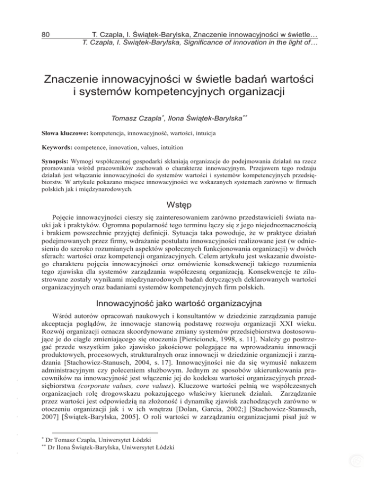 80 T. Czapla, I. Świątek-Barylska, Znaczenie innowacyjności w świetle… T. Czapla, I. Świątek-Barylska, Significance of innovation in the light of… Znaczenie innowacyjności w świetle badań wartości i systemów kompetencyjnych organizacji Tomasz Czapla*, Ilona Świątek-Barylska** Słowa kluczowe: kompetencja, innowacyjność, wartości, intuicja Keywords: competence, innovation, values, intuition Synopsis: Wymogi współczesnej gospodarki skłaniają organizacje do podejmowania działań na rzecz promowania wśród pracowników zachowań o charakterze innowacyjnym. Przejawem tego rodzaju działań jest włączanie innowacyjności do systemów wartości i systemów kompetencyjnych przedsiębiorstw. W artykule pokazano miejsce innowacyjności we wskazanych systemach zarówno w firmach polskich jak i międzynarodowych. Wstęp Pojęcie innowacyjności cieszy się zainteresowaniem zarówno przedstawicieli świata nauki jak i praktyków. Ogromna popularność tego terminu łączy się z jego niejednoznacznością i brakiem powszechnie przyjętej definicji. Sytuacja taka powoduje, że w praktyce działań podejmowanych przez firmy, wdrażanie postulatu innowacyjności realizowane jest (w odniesieniu do szeroko rozumianych aspektów społecznych funkcjonowania organizacji) w dwóch sferach: wartości oraz kompetencji organizacyjnych. Celem artykułu jest wskazanie dwoistego charakteru pojęcia innowacyjności oraz omówienie konsekwencji takiego rozumienia tego zjawiska dla systemów zarządzania współczesną organizacją. Konsekwencje te zilustrowane zostały wynikami międzynarodowych badań dotyczących deklarowanych wartości organizacyjnych oraz badaniami systemów kompetencyjnych firm polskich. Wśród autorów opracowań naukowych i konsultantów w dziedzinie zarządzania panuje akceptacja poglądów, że innowacje stanowią podstawę rozwoju organizacji XXI wieku. Rozwój organizacji oznacza skoordynowane zmiany systemów przedsiębiorstwa dostosowujące je do ciągle zmieniającego się otoczenia [Pierścionek, 1998, s. 11]. Należy go postrzegać przede wszystkim jako zjawisko jakościowe polegające na wprowadzaniu innowacji produktowych, procesowych, strukturalnych oraz innowacji w dziedzinie organizacji i zarządzania [Stachowicz-Stanusch, 2004, s. 17]. Innowacyjności nie da się wymusić nakazem administracyjnym czy poleceniem służbowym. Jednym ze sposobów ukierunkowania pracowników na innowacyjność jest włączenie jej do kodeksu wartości organizacyjnych przedsiębiorstwa (corporate values, core values). Kluczowe wartości pełnią we współczesnych organizacjach rolę drogowskazu pokazującego właściwy kierunek działań. Zarządzanie przez wartości jest odpowiedzią na złożoność i dynamikę zjawisk zachodzących zarówno w otoczeniu organizacji jak i w ich wnętrzu [Dolan, Garcia, 2002;] [Stachowicz-Stanusch, 2007] [Świątek-Barylska, 2005]. O roli wartości w zarządzaniu organizacjami pisał już w - - - - Innowacyjność jako wartość organizacyjna * Dr Tomasz Czapla, Uniwersytet Łódzki Dr Ilona Świątek-Barylska, Uniwersytet Łódzki - ** - - - - - WSPÓŁCZESNE ZARZĄDZANIE 3/2011 CONTEMPORARY MANAGEMENT QUARTERLY 3/2011 81 1939 roku Ch. Barnard, który zauważył, że wspólnie wyznawane wartości okazują się użyteczne w rozwiązywaniu problemu tworzenia i zarządzania złożonymi organizacjami [Barnard 1958]. Popularność tej koncepcji zarządzania związana jest publikacją w 1994 roku wyników badań J. Collins’a i J. Porras’a na temat tzw. wizjonerskich organizacji [Collins, Porras, 1994]. Badania pokazały, ż e wizjonerskie organizacje o wiele częściej od porównywanych z nimi przedsiębiorstw, kierowały się nadrzędnymi wartościami. Na poziomie organizacji wartości stanowią swoiste spoiwo ukierunkowujące i łączące działania członków organizacji. Kluczowe wartości są z definicji stałe i będąc elementem kultury organizacyjnej stanowią podstawę podejmowanych decyzji i działań. Wartości dla pracowników organizacji to wskazówka co jest „moralne lub właściwe, dobre lub złe, pożądane lub zasługujące na pogardę” [Marshall, 2004, s. 416]. Jak wskazuje M. Rybak, poprawnie ukształtowany system wartości oddziałuje na [Rybak, 2004, s.126]: - Sposób podejmowania decyzji; - Styl zarządzania zasobami ludzkimi; - Sposób reagowania na zmiany w otoczeniu; - Wzorce zachowań właściwych dla organizacji; - Proces adaptacji pracowników do panujących w firmie warunków. Kluczowe wartości przenikają całą organizację. Są one podstawą każdej decyzji w przedsiębiorstwie i każdy pracownik musi mieć tego świadomość. [Lencioni, 2003]. Wartości, aby faktycznie oddziaływały na pracowników, powinny być obecne we wszystkich procesach związanych z pracownikami, takich jak: rekrutacja, ocena pracy, kryteria awansów i premii oraz wszystkich pozostałych dziedzinach funkcjonowania przedsiębiorstwa Powinny one wpływać na decyzje i działania podejmowane w organizacji. Wartości wywierają wpływ na ludzi od momentu, w którym jednostka dowiaduje się o istnieniu organizacji, czy to jako kandydat do pracy, klient, akcjonariusz czy członek lokalnej społeczności i stanowią podstawę kształtowania relacji organizacji ze wszystkimi grupami interesariuszy. Warunkiem koniecznym zaistnienia opisanego wpływu jest faktyczne podzielanie deklarowanych wartości przez członków organizacji, czyli doprowadzenie do sytuacji, w której wartości postulowane są de facto wartościami realizowanymi. W przeciwnym przypadku system wartości może stać się źródłem demotywacji i frustracji [Lencioni, 2002]. Wartości na poziomie jednostki są głównym aspektem ludzkiej osobowości. Wartość zawiera w sobie trzy elementy: poznawczy, afektywny i behawioralny. Element poznawczy związany jest z poznaniem i zrozumieniem idei na poziomie intelektualnym. Składnik afektywny wiąże się emocjami, a warto