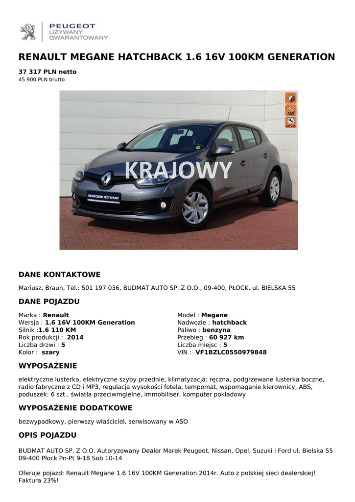 RENAULT MEGANE HATCHBACK 1.6 16V 100KM GENERATION 37 317 PLN netto 45 900 PLN brutto DANE KONTAKTOWE Mariusz, Braun, Tel.: 501 197 036, BUDMAT AUTO SP. Z O.O., 09-400, PŁOCK, ul. BIELSKA 55 DANE POJAZDU Marka : Renault Wersja : 1.6 16V 100KM Generation Silnik :1.6 110 KM Rok produkcji : 2014 Liczba drzwi : 5 Kolor : szary Model : Megane Nadwozie : hatchback Paliwo : benzyna Przebieg : 60 927 km Liczba miejsc : 5 VIN : VF1BZLC0550979848 WYPOSAŻENIE elektryczne lusterka, elektryczne szyby przednie, klimatyzacja: ręczna, podgrzewane lusterka boczne, radio fabryczne z CD i MP3, regulacja wysokości fotela, tempomat, wspomaganie kierownicy, ABS, poduszek: 6 szt., światła przeciwmgielne, immobiliser, komputer pokładowy WYPOSAŻENIE DODATKOWE bezwypadkowy, pierwszy właściciel, serwisowany w ASO OPIS POJAZDU BUDMAT AUTO SP. Z O.O. Autoryzowany Dealer Marek Peugeot, Nissan, Opel, Suzuki i Ford ul. Bielska 55 09-400 Płock Pn-Pt 9-18 Sob 10-14 Oferuje pojazd: Renault Megane 1.6 16V 100KM Generation 2014r. Auto z polskiej sieci dealerskiej! Faktura 23%! KUPUJĄC U NAS MASZ PEWNOŚĆ ŻE: • Każde auto ma gwarantowany przebieg; • Każdy samochód posiada ważną polisę OC oraz aktualne badania techniczne; • Sprawdziliśmy stan techniczny i prawny samochodu; • Nie zaniżamy cen na fakturze zawsze wystawiamy faktury na pełną wartość pojazdu GWARANCJA: Na każdy pojazd z przebiegiem do 150 000 km udzielamy 6-miesięcznej gwarancji programowej (silnik, skrzynia biegów, przekładnia główna) Rozszerzenie warunków gwarancji (układ kierowniczy, hamulcowy, paliwowy, przeniesienie napędu, instalacja elektryczna itp.) - 770PLN Wydłużenie gwarancji do 12 miesięcy - 620PLN Szczegóły oferty dostępne w salonie. WYPOSAŻENIE: Tapicerka materiałowa;Zestaw do naprawy przebitej opony;Uchwyty ISOFIX do instalacji fotelika dziecięcego,tył;Lakier metalik;Światła przeciwmgielne;Tempomat;Tylna kanapa - składana i dzielona;Sygnalizacja niezapiętych pasów bezpieczeństwa kierowcy;Wspomaganie układu kierowniczego - elektryczne;Radio CD/MP3 R-Plug&Radio;Pasy bezpieczeństwa 3 punktowe na przednich i tylnych miejscach;Lusterka boczne regulowane elektrycznie i podgrzewane;Komputer pokładowy;Kolumna kierownicy z mech. regulacją położenia w dwóch płaszczyznach;Immobilizer;Karta Renault;Klimatyzacja manualna;AFU - system wspomagający nagłe hamowanie;Airbag 6 sztuk (czołowe poduszki kierowcy i pasażera, boczne poduszki - przód, kurtyny powietrzne);Fotel kierowcy z manualną regulacją wysokości;Czujnik ciśnienia w oponach;El. podnoszenie szyb, przód;Felgi stalowe 15 z ogumieniem;4/5 zagłówki;ABS Na miejscu oferujemy: FINANSOWANIE : Samochód dostępny w finansowaniu kredytowym i leasingowym. Szczegóły oferty dostępne w salonie. UBEZPIECZENIE Pełne pakiety dealerskie AC/OC/NNW/ASS, likwidacja szkód na częściach oryginalnych. Konkurencyjne ceny! Szczegóły oferty dostępne w salonie. PRZYJMUJEMY SAMOCHÓD UŻYWANY W ROZLICZENIU: Proponujemy pozostawienie samochodu używanego w rozliczeniu. Zapewniamy bezpłatną wycenę w naszym salonie. Zapraszamy do kontaktu z naszym działem handlowym: Michał Michalski 508-090-457 Tomasz Szadkowski 501-197-036 *Powyższa informacja nie stanowi oferty w myśl prawa handlowego (art. 66 § 1 k.c.), więcej informacji możecie Państwo uzyskać kontaktując się z naszym Działem Sprzedaży. *Samochód prezentowany na zdjęciu może różnić się od przedstawionego w opisie. UMÓW SIĘ NA JAZDĘ PRÓBNĄ W NASZYM SALONIE. Do dyspozycji szeroka gama pojazdów używanych różnych marek. Zapraszamy serdecznie! QR CODE DLA OGŁOSZENIA W SERWISIE UZYWANYGWARANTOWANY.PL Powered by TCPDF (www.tcpdf.org)