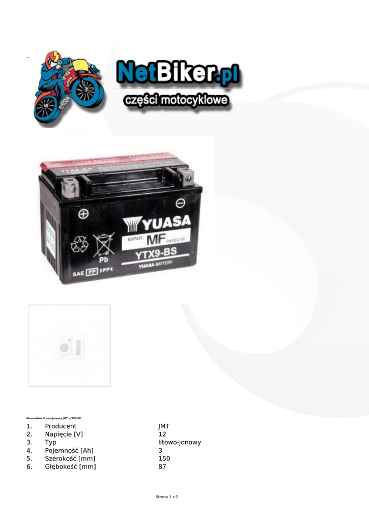 Akumulator litowo-jonowy JMT HJTX9-FP 1. 2. 3. 4. 5. 6. Producent Napięcie [V] Typ Pojemność [Ah] Szerokość [mm] Głębokość [mm] JMT 12 litowo-jonowy 3 150 87 Strona 1 z 2 7. 8. 9. 10. 11. 12. Wysokość [mm] Ilość elektrolitu [l] Elektrolit w zestawie Prąd ładowania [A] Prąd rozruchu [A] Ciężar [kg] 105 – Tak 1,5 180 0,6kg Technologia ogniw litowo-jonowych jest z powodzeniem używana od kilku lat głównie w branży elektronicznej, w branży motoryzacyjnej jest już dostępna tylko u najlepszych światowych producentów akumulatorów. JMT oferuje aż 23 modele akumulatorów litowo-jonowych, które dzięki swej konstrukcji pokrywają blisko 90% zapotrzebowania rynku. Główne cechy to przede wszystkim ich bardzo niewielka waga. Stąd ich szerokie zastosowanie w sporcie motocyklowym z uwagi na dość tanią redukcję masy motocykla. Akumulatory litowo-jonowe mogą mieć na opakowaniu podaną wartość [Wh] jest to wynik iloczynu pojemności [Ah] i napięcia [V] akumulatora. Pozostałe cechy to między innymi: - możliwość zainstalowania akumulatora w dowolnej pozycji, - samorozładowywanie się na poziomie 5% miesięcznie, - zainstalowany w akumulatorze procesor, zarządza prawidłową pracą ogniw i zapobiega m.in. nierównomiernemu obciążaniu poszczególnych z nich, - niezwykle szybki proces ładowania, który w zależności od modelu zabiera od 4-8 min (przy mocnej ładowarce), - wskaźnik naładowania akumulatora, Akumulatory litowo-jonowe JMT są przyporządkowane do motocykli i współpracują z oferowanymi przez nas ładowarkami JMP. UWAGA! Nie jest możliwe używanie tradycyjnych prostowników i prostych ładowarek do akumulatorów tradycyjnych. Jedynie inteligentne ładowarki są w stanie skutecznie naładować ten rodzaj ogniw i nie wpłynąć na skrócenie życia akumulatorów litowo-jonowych. Strona 2 z 2
