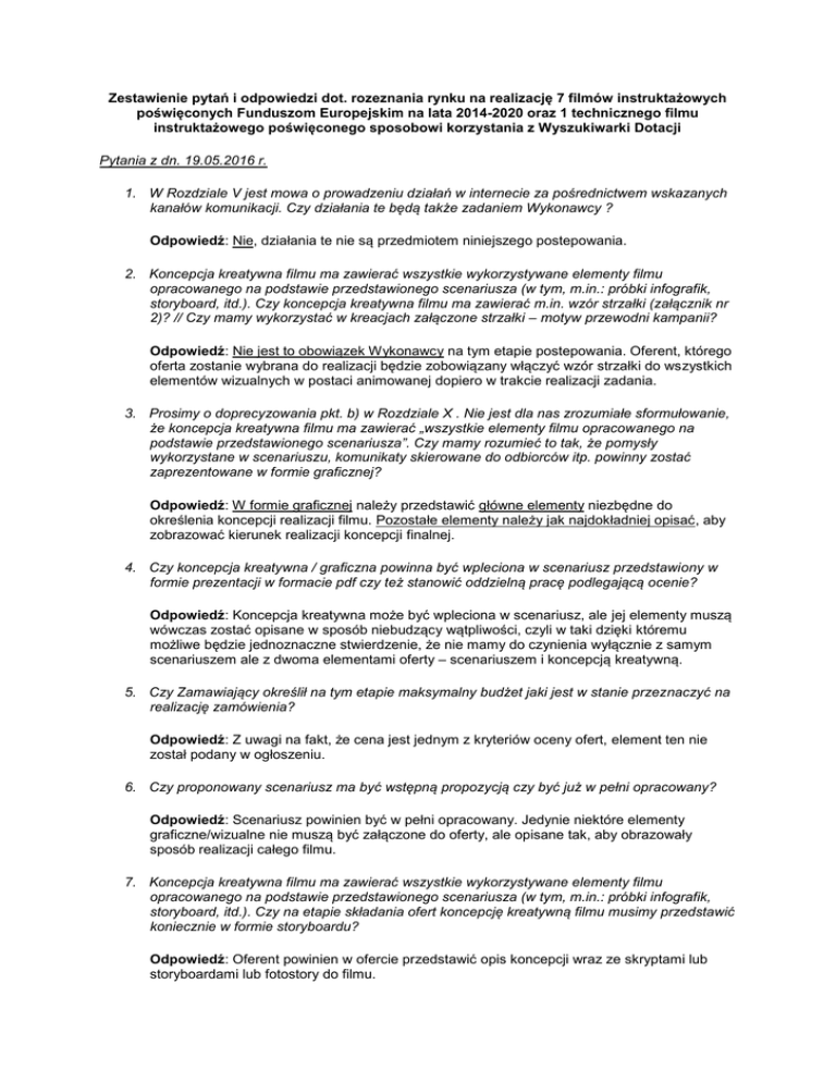 Zestawienie pytań i odpowiedzi dot. rozeznania rynku na realizację 7 filmów instruktażowych poświęconych Funduszom Europejskim na lata 2014-2020 oraz 1 technicznego filmu instruktażowego poświęconego sposobowi korzystania z Wyszukiwarki Dotacji Pytania z dn. 19.05.2016 r. 1. W Rozdziale V jest mowa o prowadzeniu działań w internecie za pośrednictwem wskazanych kanałów komunikacji. Czy działania te będą także zadaniem Wykonawcy ? Odpowiedź: Nie, działania te nie są przedmiotem niniejszego postepowania. 2. Koncepcja kreatywna filmu ma zawierać wszystkie wykorzystywane elementy filmu opracowanego na podstawie przedstawionego scenariusza (w tym, m.in.: próbki infografik, storyboard, itd.). Czy koncepcja kreatywna filmu ma zawierać m.in. wzór strzałki (załącznik nr 2)? // Czy mamy wykorzystać w kreacjach załączone strzałki – motyw przewodni kampanii? Odpowiedź: Nie jest to obowiązek Wykonawcy na tym etapie postepowania. Oferent, którego oferta zostanie wybrana do realizacji będzie zobowiązany włączyć wzór strzałki do wszystkich elementów wizualnych w postaci animowanej dopiero w trakcie realizacji zadania. 3. Prosimy o doprecyzowania pkt. b) w Rozdziale X . Nie jest dla nas zrozumiałe sformułowanie, że koncepcja kreatywna filmu ma zawierać „wszystkie elementy filmu opracowanego na podstawie przedstawionego scenariusza”. Czy mamy rozumieć to tak, że pomysły wykorzystane w scenariuszu, komunikaty skierowane do odbiorców itp. powinny zostać zaprezentowane w formie graficznej? Odpowiedź: W formie graficznej należy przedstawić główne elementy niezbędne do określenia koncepcji realizacji filmu. Pozostałe elementy należy jak najdokładniej opisać, aby zobrazować kierunek realizacji koncepcji finalnej. 4. Czy koncepcja kreatywna / graficzna powinna być wpleciona w scenariusz przedstawiony w formie prezentacji w formacie pdf czy też stanowić oddzielną pracę podlegającą ocenie? Odpowiedź: Koncepcja kreatywna może być wpleciona w scenariusz, ale jej elementy muszą wówczas zostać opisane w sposób niebudzący wątpliwości, czyli w taki dzięki któremu możliwe będzie jednoznaczne stwierdzenie, że nie mamy do czynienia wyłącznie z samym scenariuszem ale z dwoma elementami oferty – scenariuszem i koncepcją kreatywną. 5. Czy Zamawiający określił na tym etapie maksymalny budżet jaki jest w stanie przeznaczyć na realizację zamówienia? Odpowiedź: Z uwagi na fakt, że cena jest jednym z kryteriów oceny ofert, element ten nie został podany w ogłoszeniu. 6. Czy proponowany scenariusz ma być wstępną propozycją czy być już w pełni opracowany? Odpowiedź: Scenariusz powinien być w pełni opracowany. Jedynie niektóre elementy graficzne/wizualne nie muszą być załączone do oferty, ale opisane tak, aby obrazowały sposób realizacji całego filmu. 7. Koncepcja kreatywna filmu ma zawierać wszystkie wykorzystywane elementy filmu opracowanego na podstawie przedstawionego scenariusza (w tym, m.in.: próbki infografik, storyboard, itd.). Czy na etapie składania ofert koncepcję kreatywną filmu musimy przedstawić koniecznie w formie storyboardu? Odpowiedź: Oferent powinien w ofercie przedstawić opis koncepcji wraz ze skryptami lub storyboardami lub fotostory do filmu. 8. Koncepcja kreatywna filmu ma zawierać wszystkie wykorzystywane elementy filmu opracowanego na podstawie przedstawionego scenariusza (w tym, m.in.: próbki infografik, storyboard, itd.). Czy mamy załączać faktycznie wszystkie elementy, które miałyby się znaleźć w docelowym filmie? Odpowiedź: Należy załączyć główne elementy i motywy koncepcji kreatywnej. Pozostałe elementy znaczące filmu należy jak najdokładniej opisać, aby zobrazować kierunek realizacji koncepcji finalnej. 9. Czy portfolio Wykonawcy również będzie oceniane? Odpowiedź: Portfolio Wykonawcy nie będzie podlegało ocenie. Będzie natomiast stanowiło potwierdzenie wymaganego doświadczenia wykonawcy w zakresie realizacji filmów instruktażowych, animacji lub prezentacji multimedialnych zrealizowanych w okresie ostatnich trzech lat przed terminem składania ofert. 10. Harmonogram realizacji zadania – jaką datę startu mamy uwzględnić? Odpowiedź: Za datę wstępną harmonogramu należy podać datę podpisania umowy. Harmonogram można przedstawić bez podawania konkretnych dat z kalendarza np. w formie: „Dzień 1 – data podpisania umowy, Dzień X – dostarczenie …., Dzień Y – wykonanie”, itd. 11. Oferty można nadsyłać do 24.05.2016 r. – do końca dnia? Czy do konkretnej godz? Odpowiedź: Termin został określony w pkt ogłoszenia pt.: „Termin składania ofert”. Zgodnie z tym punktem, oferty można nadsyłać do dnia 24-05-2016 r. do godziny 23-59-59. 12. Czy oferty mogą być składane przez pojedyncze podmioty czy także przez Konsorcjum? Odpowiedź: Oferty mogą składać również konsorcja, pod warunkiem, że co najmniej jeden członek konsorcjum wykaże, że posiada niezbędne uprawnienia do wykonywania opisanej w ogłoszeniu działalności lub czynności. Zgodnie z ogłoszeniem Wykonawca powinien udokumentować doświadczenie w zakresie realizacji filmów instruktażowych, animacji lub prezentacji multimedialnych zrealizowanych w okresie ostatnich trzech lat przed terminem składania ofert.