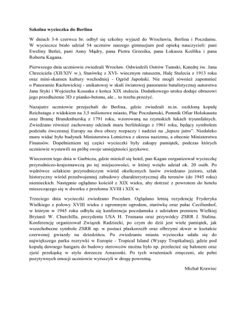 Szkolna wycieczka do Berlina W dniach 3-6 czerwca br. odbył się szkolny wyjazd do Wrocławia, Berlina i Poczdamu. W wycieczce brało udział 54 uczniów naszego gimnazjum pod opieką nauczycieli: pani Eweliny Betlei, pani Anny Mądry, pana Piotra Grzesika, pana Łukasza Koźlika i pana Roberta Kagana. Pierwszego dnia uczniowie zwiedzali Wrocław. Odwiedzili Ostrów Tumski, Katedrę św. Jana Chrzciciela (XII/XIV w.), Starówkę z XVI- wiecznym ratuszem, Halę Stulecia z 1913 roku oraz mini-skansen kultury wschodniej - Ogród Japoński. Nie mogli również zapomnieć o Panoramie Racławickiej - unikatowej w skali światowej panoramie batalistycznej autorstwa Jana Styki i Wojciecha Kossaka z końca XIX stulecia. Dodatkowego uroku dodaje obrazowi jego przedłużenie 3D z pianko-betonu, ale... to trzeba przeżyć. Nazajutrz uczniowie przejechali do Berlina, gdzie zwiedzali m.in. oszkloną kopułę Reichstagu z widokiem na 3,5 milionowe miasto, Plac Poczdamski, Pomnik Ofiar Holokaustu oraz Bramę Brandenburską z 1791 roku, wzorowaną na rzymskich łukach tryumfalnych. Zwiedzano również zachowany odcinek muru berlińskiego z 1961 roku, będący symbolem podziału ówczesnej Europy na dwa obozy rozpaczy i nadziei na „lepsze jutro”. Niedaleko muru widać było budynek Ministerstwa Lotnictwa z okresu nazizmu, a obecnie Ministerstwa Finansów. Dopełnieniem tej części wycieczki były zakupy pamiątek, podczas których uczniowie wystawili na próbę swoje umiejętności językowe. Wieczorem tego dnia w Garbiczu, gdzie mieścił się hotel, pan Kagan zorganizował wycieczkę przyrodniczo-krajoznawczą po tej miejscowości, w której wzięło udział ok. 20 osób. Po wędrówce szlakiem przyrodniczym wśród okolicznych lasów zwiedzano jezioro, szlak historyczny wśród przedwojennej zabudowy charakterystycznej dla terenów (do 1945 roku) niemieckich. Następnie oglądano kościół z XIX wieku, aby dotrzeć z powrotem do hotelu mieszczącego się w dworku z przełomu XVIII i XIX w. Trzeciego dnia wycieczki zwiedzano Poczdam. Oglądano letnią rezydencję Fryderyka Wielkiego z połowy XVIII wieku z ogromnym ogrodem, starówkę oraz pałac Cecilienhof, w którym w 1945 roku odbyła się konferencja poczdamska z udziałem premiera Wielkiej Brytanii W. Churchilla, prezydenta USA H. Trumana oraz przywódcy ZSRR J. Stalina. Konferencję organizował Związek Radziecki, po czym do dziś jest wiele pamiątek, jak wszechobecne symbole ZSRR np. w postaci płaskorzeźb oraz olbrzymi skwer w kształcie czerwonej gwiazdy na dziedzińcu. Po zwiedzaniu miasta wycieczka udała się do największego parku rozrywki w Europie - Tropical Island (Wyspy Tropikalnej), gdzie pod kopułą dawnego hangaru do budowy sterowców można było np. przelecieć się balonem oraz zjeść przekąskę w stylu dorzecza Amazonki. Po tych wrażeniach zmęczeni, ale pełni pozytywnych emocji uczniowie wyruszyli w drogę powrotną. Michał Krawiec