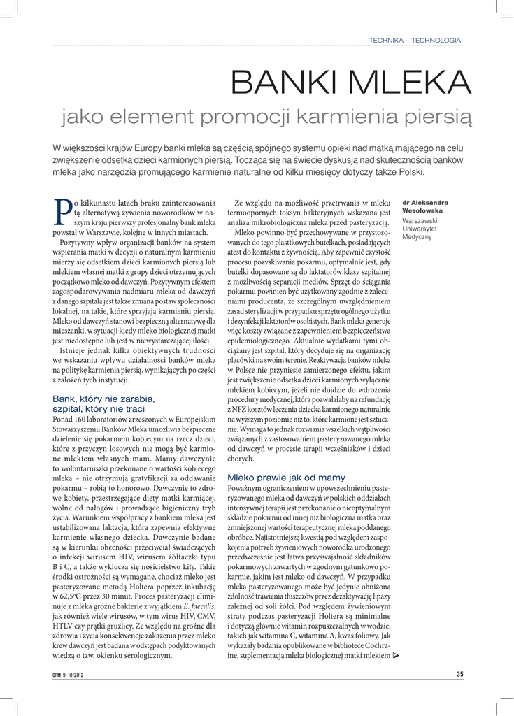 TECHNIKA – TECHNOLOGIA BANKI MLEKA jako element promocji karmienia piersią W większości krajów Europy banki mleka są częścią spójnego systemu opieki nad matką mającego na celu zwiększenie odsetka dzieci karmionych piersią. Tocząca się na świecie dyskusja nad skutecznością banków mleka jako narzędzia promującego karmienie naturalne od kilku miesięcy dotyczy także Polski. P o kilkunastu latach braku zainteresowania tą alternatywą żywienia noworodków w naszym kraju pierwszy profesjonalny bank mleka powstał w Warszawie, kolejne w innych miastach. Pozytywny wpływ organizacji banków na system wspierania matki w decyzji o naturalnym karmieniu mierzy się odsetkiem dzieci karmionych piersią lub mlekiem własnej matki z grupy dzieci otrzymujących początkowo mleko od dawczyń. Pozytywnym efektem zagospodarowywania nadmiaru mleka od dawczyń z danego szpitala jest także zmiana postaw społeczności lokalnej, na takie, które sprzyjają karmieniu piersią. Mleko od dawczyń stanowi bezpieczną alternatywę dla mieszanki, w sytuacji kiedy mleko biologicznej matki jest niedostępne lub jest w niewystarczającej ilości. Istnieje jednak kilka obiektywnych trudności we wskazaniu wpływu działalności banków mleka na politykę karmienia piersią, wynikających po części z założeń tych instytucji. Bank, który nie zarabia, szpital, który nie traci Ponad 160 laboratoriów zrzeszonych w Europejskim Stowarzyszeniu Banków Mleka umożliwia bezpieczne dzielenie się pokarmem kobiecym na rzecz dzieci, które z przyczyn losowych nie mogą być karmione mlekiem własnych mam. Mamy dawczynie to wolontariuszki przekonane o wartości kobiecego mleka – nie otrzymują gratyfikacji za oddawanie pokarmu – robią to honorowo. Dawczynie to zdrowe kobiety, przestrzegające diety matki karmiącej, wolne od nałogów i prowadzące higieniczny tryb życia. Warunkiem współpracy z bankiem mleka jest ustabilizowana laktacja, która zapewnia efektywne karmienie własnego dziecka. Dawczynie badane są w kierunku obecności przeciwciał świadczących o infekcji wirusem HIV, wirusem żółtaczki typu B i C, a także wyklucza się nosicielstwo kiły. Takie środki ostrożności są wymagane, chociaż mleko jest pasteryzowane metodą Holtera poprzez inkubację w 62,5ºC przez 30 minut. Proces pasteryzacji eliminuje z mleka groźne bakterie z wyjątkiem E. faecalis, jak również wiele wirusów, w tym wirus HIV, CMV, HTLV czy prątki gruźlicy. Ze względu na groźne dla zdrowia i życia konsekwencje zakażenia przez mleko krew dawczyń jest badana w odstępach podyktowanych wiedzą o tzw. okienku serologicznym. OPM 9-10/2012 Ze względu na możliwość przetrwania w mleku termoopornych toksyn bakteryjnych wskazana jest analiza mikrobiologiczna mleka przed pasteryzacją. Mleko powinno być przechowywane w przystosowanych do tego plastikowych butelkach, posiadających atest do kontaktu z żywnością. Aby zapewnić czystość procesu pozyskiwania pokarmu, optymalnie jest, gdy butelki dopasowane są do laktatorów klasy szpitalnej z możliwością separacji mediów. Sprzęt do ściągania pokarmu powinien być użytkowany zgodnie z zaleceniami producenta, ze szczególnym uwzględnieniem zasad sterylizacji w przypadku sprzętu ogólnego użytku i dezynfekcji laktatorów osobistych. Bank mleka generuje więc koszty związane z zapewnieniem bezpieczeństwa epidemiologicznego. Aktualnie wydatkami tymi obciążany jest szpital, który decyduje się na organizację placówki na swoim terenie. Reaktywacja banków mleka w Polsce nie przyniesie zamierzonego efektu, jakim jest zwiększenie odsetka dzieci karmionych wyłącznie mlekiem kobiecym, jeżeli nie dojdzie do wdrożenia procedury medycznej, która pozwalałaby na refundację z NFZ kosztów leczenia dziecka karmionego naturalnie na wyższym poziomie niż to, które karmione jest sztucznie. Wymaga to jednak rozwiania wszelkich wątpliwości związanych z zastosowaniem pasteryzowanego mleka od dawczyń w procesie terapii wcześniaków i dzieci chorych. dr Aleksandra Wesołowska Warszawski Uniwersytet Medyczny Mleko prawie jak od mamy Poważnym ograniczeniem w upowszechnieniu pasteryzowanego mleka od dawczyń w polskich oddziałach intensywnej terapii jest przekonanie o nieoptymalnym składzie pokarmu od innej niż biologiczna matka oraz zmniejszonej wartości terapeutycznej mleka poddanego obróbce. Najistotniejszą kwestią pod względem zaspokojenia potrzeb żywieniowych noworodka urodzonego przedwcześnie jest łatwa przyswajalność składników pokarmowych zawartych w zgodnym gatunkowo pokarmie, jakim jest mleko od dawczyń. W przypadku mleka pasteryzowanego może być jedynie obniżona zdolność trawienia tłuszczów przez dezaktywację lipazy zależnej od soli żółci. Pod względem żywieniowym straty podczas pasteryzacji Holtera są minimalne i dotyczą głównie witamin rozpuszczalnych w wodzie, takich jak witamina C, witamina A, kwas foliowy. Jak wykazały badania opublikowane w bibliotece Cochraine, suplementacja mleka biologicznej matki mlekiem 35 TECHNIKA – TECHNOLOGIA z banku mleka, zamiast sztuczną mieszanką, skutkuje wolniejszym przybieraniem na wadze oraz zwolnieniem przyrostu na długość oraz obwodu głowy. Jednocześnie w przypadku 6 na 8 analizowanych badań średnie przyrosty wagi w czasie były optymalne. Pasteryzacja Holtera, stosowana powszechnie w bankach mleka na całym świecie rzeczywiście dezaktywuje część czynników, które wspomagają rozwój niedojrzałego noworodka. W mleku kobiecym zawartych jest jednak tysiące czynników należących do związków o zróżnicowanej budowie pod względem biochemicznym. Destrukcji temperaturami przekraczającymi ciepłotę ciała ulegają z pewnością komórki układu immunologicznego zawarte w mleku kobiecym oraz immunoglobuliny klasy G i M. IgA natomiast pozostają aktywne, co ma szczególne znaczenie w rozwoju tolerancji pokarmowej noworodka. Cytokiny zawart