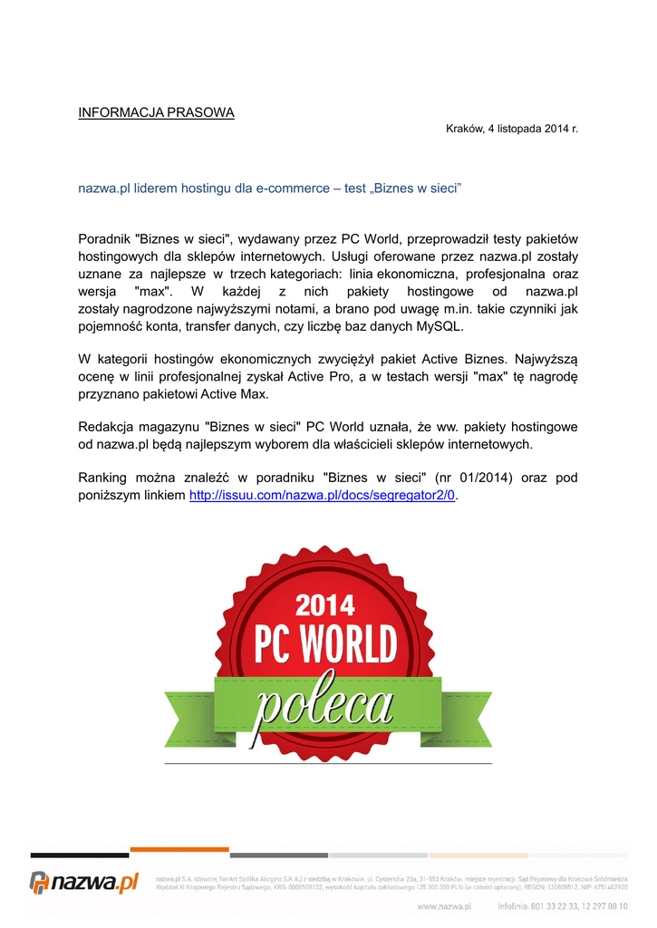 INFORMACJA PRASOWA nazwa.pl liderem hostingu dla e