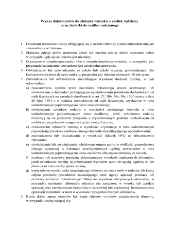 Wykaz dokumentów do złożenia wniosku o zasiłek rodzinny oraz dodatki do zasiłku rodzinnego 1. Dokument tożsamości osoby ubiegającej się o zasiłek rodzinny z potwierdzeniem miejsca zamieszkania w Ustroniu. 2. Skrócone odpisy aktów urodzenia dzieci lub zupełne odpisy aktów urodzenia dzieci w przypadku gdy ojciec dziecka jest nieznany. 3. Orzeczenie o niepełnosprawności albo o stopniu niepełnosprawności, w przypadku gdy przyznanie świadczenia uzależnione jest od niepełnosprawności. 4. Oświadczenie lub zaświadczenie ze szkoły lub szkoły wyższej, potwierdzające fakt kontynuowania przez dziecko nauki, w przypadku gdy dziecko ukończyło 18 rok życia. 5. Zaświadczenia lub oświadczenia stwierdzające wysokość dochodu rodziny, w tym odpowiednio: a) zaświadczenia wydane przez naczelnika właściwego urzędu skarbowego lub oświadczenia o dochodzie podlegającym opodatkowaniu podatkiem dochodowym od osób fizycznych na zasadach określonych w art. 27, 30b, 30c, 30e i 30f ustawy z dnia 26 lipca 1991 r. o podatku dochodowym od osób fizycznych, uzyskanym w roku kalendarzowym poprzedzającym okres świadczeniowy; b) oświadczenia członków rodziny o wysokości uzyskanego dochodu w roku kalendarzowym poprzedzającym okres zasiłkowy, jeżeli członkowie rodziny rozliczają się na podstawie przepisów o zryczałtowanym podatku dochodowym od niektórych przychodów osiąganych przez osoby fizyczne; c) oświadczenia członków rodziny o wysokości uzyskanego w roku kalendarzowym poprzedzającym okres zasiłkowy innego dochodu niepodlegającego opodatkowaniu; d) zaświadczenia lub oświadczenia o wysokości składek (9%) na ubezpieczenie zdrowotne; e) oświadczenie lub zaświadczenie właściwego organu gminy o wielkości gospodarstwa rolnego wyrażonej w hektarach przeliczeniowych ogólnej powierzchni w roku kalendarzowym poprzedzającym okres zasiłkowy albo nakaz płatniczy za ten rok, f) przekazy lub przelewy pieniężne dokumentujące wysokość zapłaconych alimentów, jeżeli członkowie rodziny są zobowiązani wyrokiem sądu lub ugodą sądową do ich płacenia na rzecz osoby spoza rodziny, g) kopię odpisu wyroku sądu zasądzającego alimenty na rzecz osób w rodzinie lub kopię odpisu protokołu posiedzenia zawierającego treść ugody sądowej, przekazy lub przelewy pieniężne dokumentujące faktyczną wysokość otrzymanych alimentów, w przypadku uzyskania alimentów niższych niż zasądzone w wyroku lub ugodzie sądowej, oraz zaświadczenie komornika o całkowitej lub częściowej bezskuteczności egzekucji alimentów, a także o wysokości wyegzekwowanych alimentów. 6. Kopię aktów zgonu rodziców lub kopię odpisów wyroków zasądzających alimenty, w przypadku osoby uczącej się; 7. Kopię odpisu prawomocnego wyroku sądu orzekającego rozwód lub separację oraz wyrok lub protokół zasądzający alimenty albo kopię aktu zgonu małżonka lub rodzica dziecka, w przypadku osoby samotnie wychowującej dziecko; 8. Zaświadczenie pracodawcy o udzieleniu urlopu wychowawczego oraz o okresie, na jaki urlop wychowawczy został udzielony, a także zaświadczenie o co najmniej sześciomiesięcznym okresie pozostawania w zatrudnieniu bezpośrednio przed uzyskaniem prawa do urlopu wychowawczego, w przypadku ubiegania się o dodatek z tego tytułu; 9. Zaświadczenie lekarskie lub wystawione przez położną, potwierdzające pozostawanie kobiety pod opieką medyczną nie później niż od 10 tygodnia ciąży do porodu z uwzględnieniem odbytej wizyty w każdym trymestrze ciąży, w przypadku ubiegania się o jednorazowy dodatek z tytułu urodzenia dziecka. 10. Zaświadczenie organu emerytalno-rentowego stwierdzające, że osoba ubiegająca się o dodatek z tytułu opieki nad dzieckiem w okresie korzystania z urlopu wychowawczego była zgłoszona do ubezpieczeń społecznych. W przypadku, gdy okoliczności sprawy mające wpływ na prawo do świadczeń rodzinnych wymagają potwierdzenia innym dokumentem niż wymienione powyżej, podmiot realizujący świadczenie może domagać się takiego dokumentu.