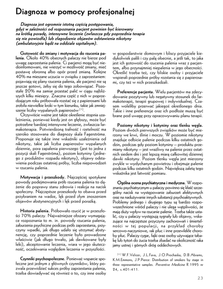 Diagnoza w pomocy profesjonalnej Diagnoza jest ogromnie istotną częścią postępowania, gdyż w zależności od rozpoznania pacjent powinien być kierowany na krótką poradę, intensywne leczenie (zwłaszcza gdy poprzednia terapia się nie powiodła) lub złagodzenie objawów odstawienia nikotyny (ambulatoryjnie bądź na oddziale szpitalnym). Gotowość do zmiany i motywacja do rzucenia palenia. Około 40% obecnych palaczy nie bierze pod uwagę zaprzestania palenia. Ci pacjenci mogą być niedoinformowani, nie wierzyć w możliwość zmiany, mieć postawę obronną albo opór przed zmianą. Kolejne 40% ma mieszane uczucia w związku z zaprzestaniem: pojawiają się plany rzucenia palenia, ale pacjenci nie są jeszcze gotowi, żeby się do tego zobowiązać. Pozostałe 20% ma zamiar przestać palić w ciągu najbliższych kilku miesięcy. Znaczna część z nich w poprzedzającym roku próbowała rozstać się z papierosami lub zrobiła niewielkie kroki w tym kierunku, takie jak zmniejszenie liczby wypalanych papierosów [*]. Oczywiście ważne jest także określenie stopnia uzależnienia, ponieważ kiedy jest on głębszy, może być potrzebne bardziej intensywne leczenie, zwłaszcza farmakoterapia. Potwierdzoną trafność i rzetelność ma szeroko stosowana do diagnozy skala Fagerströma. Proponuje się także inne wskaźniki uzależnienia od nikotyny, takie jak liczba papierosów wypalanych dziennie, pora zapalenia pierwszego (jest to jedna z pozycji skali Fagerströma), poziom kotyniny (jednego z produktów rozpadu nikotyny), objawy odstawienia podczas ostatniej próby, liczba niepowodzeń w rzucaniu palenia. Motywacja i przeszkody. Najczęściej spotykane powody podejmowania prób rzucania palenia to dążenie do poprawy stanu zdrowia i reakcja na nacisk społeczny. Najczęstsze przeszkody to obawa przed przybraniem na wadze, lęk przed złym znoszeniem objawów abstynencyjnych i lęk przed porażką. Historia palenia. Próbowało rzucić je w przeszłości 70% palaczy. Najważniejsze obszary wymagające rozpoznania to m. in. powody rzucania palenia, zaburzenia psychiczne podczas prób zaprzestania, przyczyny wpadki, jak długo udało się utrzymać abstynencję, czy poprzednie leczenie było prowadzone właściwie (jak długo trwało, jak dawkowane były leki), akceptowanie leczenia, wiara w jego skuteczność, oczekiwania względem leczenia w przyszłości. Czynniki psychospołeczne. Ponieważ wsparcie społeczne jest jednym z głównych czynników, który pozwala przewidzieć sukces próby zaprzestania palenia, trzeba dowiadywać się również o to, czy inne osoby w gospodarstwie domowym i bliscy przyjaciele kiedykolwiek palili i czy palą obecnie, a jeśli tak, to jaka jest ich gotowość do rzucenia palenia wraz z pacjentem, albo przynajmniej niepalenia w jego obecności. Określić trzeba też, czy bliskie osoby i przyjaciele wspierali poprzednie próby rozstania się z papierosami, czy też w nich przeszkadzali. Preferencje pacjenta. Wielu pacjentów ma zdecydowanie pozytywny lub negatywny stosunek do farmakoterapii, terapii grupowej i indywidualnej. Czasem woleliby przerwać jakiegoś określonego dnia. Takie i inne preferencje oraz ich podłoże muszą być brane pod uwagę przy opracowywaniu planu terapii. Poziomy nikotyny i kotyniny oraz tlenku węgla. Poziom dwóch pierwszych związków może być mierzony we krwi, ślinie i moczu. W poziomie nikotyny znajduje odbicie palenie podczas kilku ostatnich godzin, podczas gdy poziom kotyniny – produktu przemiany nikotyny – jest wrażliwy na palenie przez ostatnich siedem dni i jest lepszą miarą całkowitej dziennej dawki nikotyny. Poziom tlenku węgla jest mierzony zwykle w wydychanym powietrzu i obejmuje palenie podczas kilku ostatnich godzin. Największą zaletą tego wskaźnika jest łatwość pomiaru. Ogólna ocena psychiatryczna i medyczna. W rozpoznaniu psychiatrycznym u palaczy powinno się kłaść szczególny nacisk na występowanie zaburzeń afektywnych oraz na nadużywanie innych substancji psychoaktywnych. Problemy jednego i drugiego typu są bardzo rozpowszechnione wśród palaczy i nie ulega wątpliwości, że mają duży wpływ na rzucanie palenie. Trzeba także ustalić, czy u palaczy występują sygnały lub objawy, wskazujące na najczęstsze przyczyny zachorowań i śmiertelności w tej populacji, na przykład choroby sercowo-naczyniowe, rak płuc i inne przewlekłe choroby płuc. Palaczy cygar, fajki oraz osoby używające tabakę lub tytoń do żucia trzeba zbadać na okoliczność raka jamy ustnej i górnych dróg oddechowych. [* ] W.F.Velicer, J.L.Fava, J.O.Prochaska, D.B.Abrams, K.M.Emmons, J.P.Pierce: Distribution of smokers by stage in three representative samples. Preventive Medicine R.1995 nr 24, s.401-411. 23