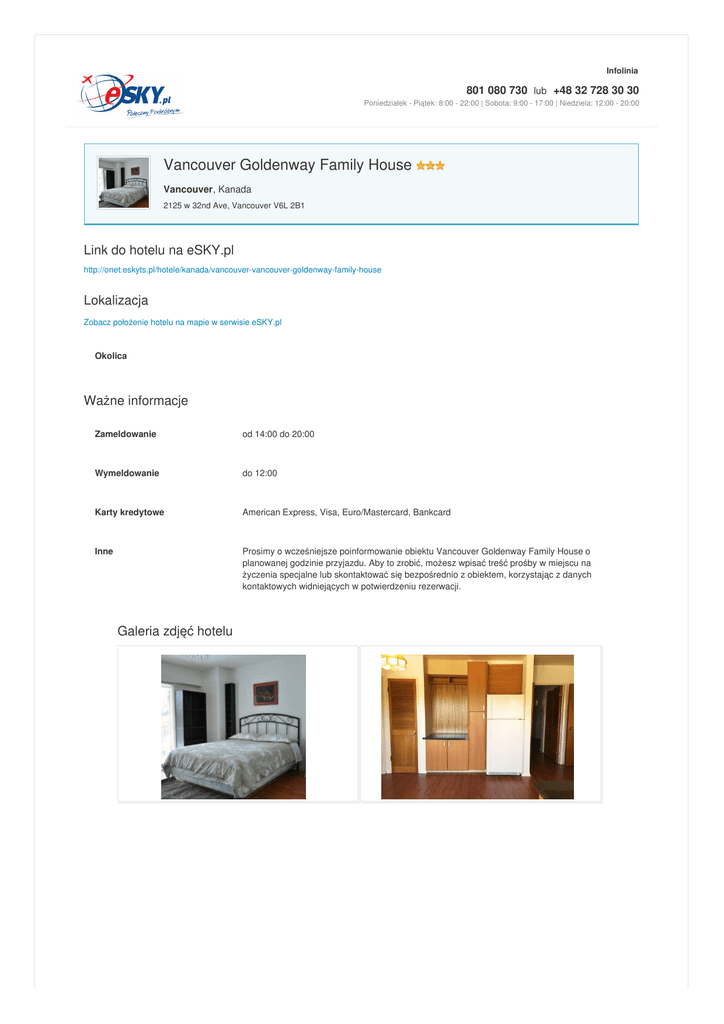 Infolinia 801 080 730 lub +48 32 728 30 30 Poniedziałek - Piątek: 8:00 - 22:00 | Sobota: 9:00 - 17:00 | Niedziela: 12:00 - 20:00 Vancouver Goldenway Family House Vancouver, Kanada 2125 w 32nd Ave, Vancouver V6L 2B1 Link do hotelu na eSKY.pl http://onet.eskyts.pl/hotele/kanada/vancouver-vancouver-goldenway-family-house Lokalizacja Zobacz położenie hotelu na mapie w serwisie eSKY.pl Okolica Ważne informacje Zameldowanie od 14:00 do 20:00 Wymeldowanie do 12:00 Karty kredytowe American Express, Visa, Euro/Mastercard, Bankcard Inne Prosimy o wcześniejsze poinformowanie obiektu Vancouver Goldenway Family House o planowanej godzinie przyjazdu. Aby to zrobić, możesz wpisać treść prośby w miejscu na życzenia specjalne lub skontaktować się bezpośrednio z obiektem, korzystając z danych kontaktowych widniejących w potwierdzeniu rezerwacji. Galeria zdjęć hotelu Hotele – Bilety lotnicze – Tanie linie lotnicze – Ubezpieczenia Podróżne