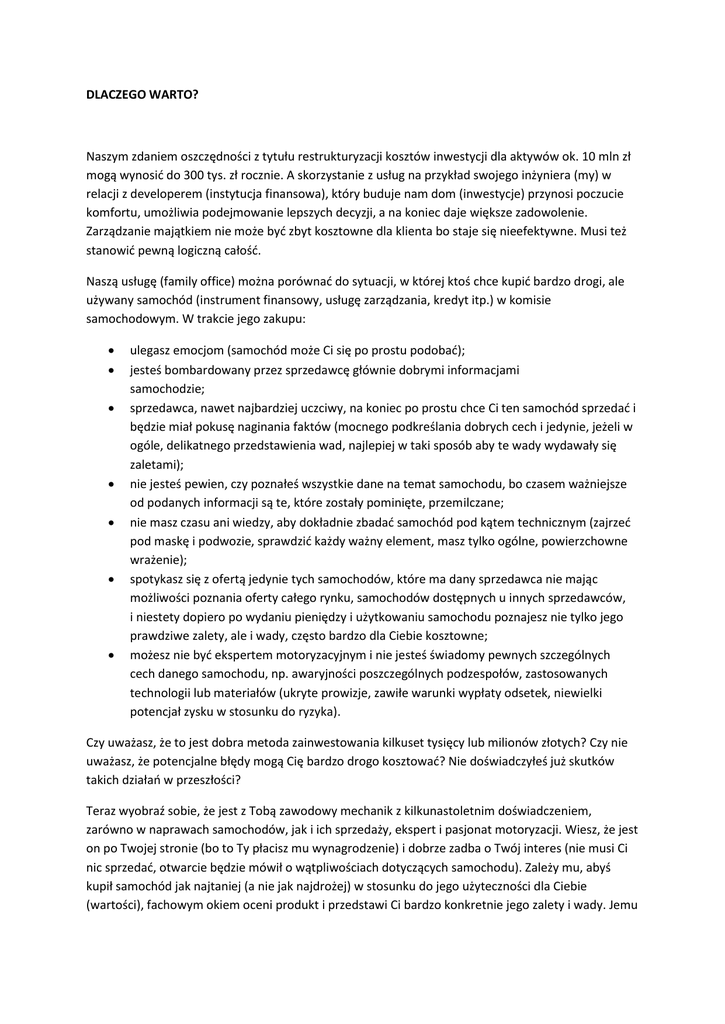 DLACZEGO WARTO? Naszym zdaniem oszczędności z tytułu restrukturyzacji kosztów inwestycji dla aktywów ok. 10 mln zł mogą wynosić do 300 tys. zł rocznie. A skorzystanie z usług na przykład swojego inżyniera (my) w relacji z developerem (instytucja finansowa), który buduje nam dom (inwestycje) przynosi poczucie komfortu, umożliwia podejmowanie lepszych decyzji, a na koniec daje większe zadowolenie. Zarządzanie majątkiem nie może być zbyt kosztowne dla klienta bo staje się nieefektywne. Musi też stanowić pewną logiczną całość. Naszą usługę (family office) można porównać do sytuacji, w której ktoś chce kupić bardzo drogi, ale używany samochód (instrument finansowy, usługę zarządzania, kredyt itp.) w komisie samochodowym. W trakcie jego zakupu: ulegasz emocjom (samochód może Ci się po prostu podobać); jesteś bombardowany przez sprzedawcę głównie dobrymi informacjami samochodzie; sprzedawca, nawet najbardziej uczciwy, na koniec po prostu chce Ci ten samochód sprzedać i będzie miał pokusę naginania faktów (mocnego podkreślania dobrych cech i jedynie, jeżeli w ogóle, delikatnego przedstawienia wad, najlepiej w taki sposób aby te wady wydawały się zaletami); nie jesteś pewien, czy poznałeś wszystkie dane na temat samochodu, bo czasem ważniejsze od podanych informacji są te, które zostały pominięte, przemilczane; nie masz czasu ani wiedzy, aby dokładnie zbadać samochód pod kątem technicznym (zajrzeć pod maskę i podwozie, sprawdzić każdy ważny element, masz tylko ogólne, powierzchowne wrażenie); spotykasz się z ofertą jedynie tych samochodów, które ma dany sprzedawca nie mając możliwości poznania oferty całego rynku, samochodów dostępnych u innych sprzedawców, i niestety dopiero po wydaniu pieniędzy i użytkowaniu samochodu poznajesz nie tylko jego prawdziwe zalety, ale i wady, często bardzo dla Ciebie kosztowne; możesz nie być ekspertem motoryzacyjnym i nie jesteś świadomy pewnych szczególnych cech danego samochodu, np. awaryjności poszczególnych podzespołów, zastosowanych technologii lub materiałów (ukryte prowizje, zawiłe warunki wypłaty odsetek, niewielki potencjał zysku w stosunku do ryzyka). Czy uważasz, że to jest dobra metoda zainwestowania kilkuset tysięcy lub milionów złotych? Czy nie uważasz, że potencjalne błędy mogą Cię bardzo drogo kosztować? Nie doświadczyłeś już skutków takich działań w przeszłości? Teraz wyobraź sobie, że jest z Tobą zawodowy mechanik z kilkunastoletnim doświadczeniem, zarówno w naprawach samochodów, jak i ich sprzedaży, ekspert i pasjonat motoryzacji. Wiesz, że jest on po Twojej stronie (bo to Ty płacisz mu wynagrodzenie) i dobrze zadba o Twój interes (nie musi Ci nic sprzedać, otwarcie będzie mówił o wątpliwościach dotyczących samochodu). Zależy mu, abyś kupił samochód jak najtaniej (a nie jak najdrożej) w stosunku do jego użyteczności dla Ciebie (wartości), fachowym okiem oceni produkt i przedstawi Ci bardzo konkretnie jego zalety i wady. Jemu nie przeszkadzają emocje, on pomoże Ci uniknąć błędów, z których zdałbyś sobie sprawę dopiero po wydaniu swoich pieniędzy i korzystaniu z samochodu. Czy nie warto skorzystać z jego usług? Czy wydane w ten sposób pieniądze nie zwracają się wielokrotnie poprzez to, że Twoja decyzja jest dużo lepsza i rozsądniejsza, że ograniczasz błędy, które popełniasz pod wpływem emocji lub niepełnej wiedzy? Ulegasz wpływowi przekazu marketingowego sprzedawcy, który ma cię skłonić do zakupu? Czy nie warto skorzystać z usług family office w sprawach dotyczących zarządzania swoim majątkiem? Ty się czujesz pewniej i bezpieczniej, wiesz dużo więcej i nie przepłacasz. Wydajesz pieniądze na swojego człowieka, ale wiesz, że są to dobrze wydane pieniądze, bo efekt finalny jest taki, że dużo więcej oszczędzasz niż wydajesz na samą poradę. Nie opłacając mechanika więcej ryzykujesz poprzez to, że kupisz samochód, który będzie się psuł po pewnym czasie, a Ty poniesiesz dodatkowe koszty naprawy. Prawdopodobnie za te same pieniądze mogłeś kupić inny samochód z lepszym wyposażeniem. Musisz wiedzieć, że: Marketing finansowy ma Cię przekonać do produktu, na którym się nie znasz, często opiera się na emocjach, skojarzeniach, modzie – to nie ma wiele wspólnego z efektywnym gospodarowaniem pieniędzmi (należy oczyścić z marketingu wszelkie propozycje finansowe aby prawidłowo ocenić ich przydatność finansową dla Ciebie). Twoja relacja z instytucją finansową jest nierówna, Ty znasz się na innych zagadnieniach niż finanse, a po drugiej stronie masz często świetnie wyszkolonego specjalistę od sprzedaży, który ma za zadanie sprzedać Ci produkt (najlepiej na kilka lat, aby Cię zatrzymać u siebie). Będzie Ci bardzo trudno samodzielnie i rzetelnie ocenić jego wartość, odkryć ewentualne wady. Instytucje finansowe mają tendencję do oferowania produktów o zbyt dużym ryzyku, ponieważ im jest ono wyższe, tym większą uzyskują marżę (zysk). Nie zawsze jednak potrzebujesz rozwiązań obarczonych wysokim ryzykiem. W rezultacie często tracisz zupełnie bezsensownie duże pieniądze. Prowizje i opłaty wszelkiego rodzaju obniżają Twoje potencjalne zyski nawet o 50% (z czego często nawet nie zdajesz sobie sprawy). W efekcie kupujesz produkty, a nie inwestujesz i z reguły znacznie przepłacasz (często w sposób nieuświadomiony). Na koniec jesteś niezadowolony. Dużo rozwiązań i produktów finansowych jest bardzo dobrych i pożytecznych. Ponadto gdzieś i w coś musisz lokować swoje oszczędności. Niemniej jednak jest tendencja do eksponowania tych rozwiązań, które są drogie dla klienta, a nie proste i tanie, a ponadto ich wykorzystanie często jest niewłaściwe i tendencyjne (przykładem sprzed kilku lat są kłopoty związane z opcjami walutowymi, które same w sobie są niezmiernie pożytecznym in