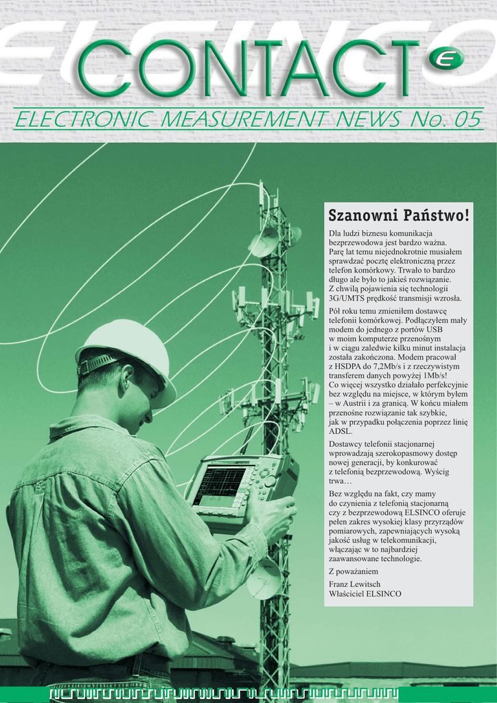 ELECTRONIC MEASUREMENT NEWS No. 05 Szanowni Panstwo! Dla ludzi biznesu komunikacja bezprzewodowa jest bardzo wa¿na. Parê lat temu niejednokrotnie musia³em sprawdzaæ pocztê elektroniczn¹ przez telefon komórkowy. Trwa³o to bardzo d³ugo ale by³o to jakieœ rozwi¹zanie. Z chwil¹ pojawienia siê technologii 3G/UMTS prêdkoœæ transmisji wzros³a. Pó³ roku temu zmieni³em dostawcê telefonii komórkowej. Pod³¹czy³em ma³y modem do jednego z portów USB w moim komputerze przenoœnym i w ci¹gu zaledwie kilku minut instalacja zosta³a zakoñczona. Modem pracowa³ z HSDPA do 7,2Mb/s i z rzeczywistym transferem danych powy¿ej 1Mb/s! Co wiêcej wszystko dzia³a³o perfekcyjnie bez wzglêdu na miejsce, w którym by³em – w Austrii i za granic¹. W koñcu mia³em przenoœne rozwi¹zanie tak szybkie, jak w przypadku po³¹czenia poprzez liniê ADSL. Dostawcy telefonii stacjonarnej wprowadzaj¹ szerokopasmowy dostêp nowej generacji, by konkurowaæ z telefoni¹ bezprzewodow¹. Wyœcig trwa… Bez wzglêdu na fakt, czy mamy do czynienia z telefoni¹ stacjonarn¹ czy z bezprzewodow¹ ELSINCO oferuje pe³en zakres wysokiej klasy przyrz¹dów pomiarowych, zapewniaj¹cych wysok¹ jakoœæ us³ug w telekomunikacji, w³¹czaj¹c w to najbardziej zaawansowane technologie. Z powa¿aniem Franz Lewitsch W³aœciciel ELSINCO Wiadomosci technologiczne Testy infrastruktury mobilnych sieci komórkowych (ci¹g dalszy z nr 4 magazynu Contact) W artykule w numerze 4, podkreœlaliœmy znaczenie ³¹czy RF, testów anten, jak równie¿ weryfikacji dzia³ania nadajnika, czyli g³ównych testów zapewniaj¹cych poprawnoœæ dzia³ania sieci komórkowych. W tym magazynie przedstawimy pozosta³e pomiary niezbêdne do prawid³owego funkcjonowania sieci. 3. Testy zasiêgu Bez wzglêdu na to, jak dok³adnie sieæ by³a planowana przed uruchomieniem stacji bazowych, testy zasiêgu to jedne z wa¿niejszych testów sieci. Zazwyczaj s¹ one przeprowadzane przy u¿yciu oprogramowania typu „drive test” oraz telefonów komórkowych maj¹cych zainstalowane odpowiednie oprogramowanie. W ten sposób mo¿na zmierzyæ nie tylko natê¿enie pola, ale tak¿e zasiêg dzia³ania poszczególnych aplikacji. Predefiniowane skrypty pozwalaj¹ u¿ytkownikowi na ocenê np. prêdkoœci transmisji HSDPA lub ocenê dzia³ania us³ug SMS/MMS. Telefon komórkowy jest w stanie mierzyæ s¹siednie stacje bazowe, zgodnie z list¹ „aktywnych komórek s¹siednich”, podanych przez sieæ. By sprawdziæ rzeczywisty zasiêg, tzn. równie¿ komórki nie znajduj¹ce siê na liœcie „aktywnych komórek s¹siednich”, potrzebujemy niezale¿nego od ustawieñ sieci odbiornika (skanera). Skanery zasiêgu mog¹ byæ u¿ywane zarówno z oprogramowaniem do „drive testów”, jak równie¿ jako samodzielne odbiorniki dedykowane do wykonywania nastêpuj¹cych pomiarów RF: stosunek sygna³u do zak³óceñ (Signal to Interference Ratio SIR), poziom sygna³u w dziedzinie kodu (Received Signal Code Power RSCP) oraz Ec/No w W-CDMA. Telefony pracuj¹ce w technologii UMTS(W-CDMA) korzystaj¹ z tak zwanego odbiornika RAKE. Technologia ta pozwala na wykorzystanie sygna³ów wielodrogowych. Dziêki temu poprawia siê stosunek sygna³u do interferencji SIR, co oznacza, i¿ zasiêg sieci jest lepszy ni¿ wynikaj¹cy z „pokrycia sygna³em bezpoœrednim”. Poniewa¿ skaner musi testowaæ sieæ w tych samych warunkach jakie ma telefon komórkowy, do dok³adnych pomiarów musi równie¿ korzystaæ z odbiornika RAKE. Wielodrogowoœæ w sieciach komórkowych Sygna³ odbity 2 Droga bezpoœrednia 4. Pomiary sta³ej sieci transmisyjnych Odbiornik (np. Telefon komórkowy lub skaner) Sygna³ odbity 1 G³ówn¹ ró¿nic¹ pomiêdzy sieciami 2/2.5G a 3G jest korzystanie z technologii ATM. W sieciach 3G, standardowe linki E1 lub E1-IMA s¹ u¿ywane do po³¹czeñ pomiêdzy RNC (Radio Network Controller) oraz stacj¹ bazow¹, podczas gdy STM-1 s³u¿y do dalszego ³¹czenia RNC. Wa¿nym aspektem jest to, ¿e gdy ³¹cza E1 (wszystkie 4) s¹ prawid³owe transfer komórek ATM bêdzie siê równie¿ wydawa³ prawid³owy. Tradycyjny tester E1 lub tester ATM z E1 nie poka¿e ¿adnego b³êdu. Jedynie testery umo¿liwiaj¹ce pomiar IMA szybko poka¿¹ b³¹d grupy gdy tylko jeden link nie dzia³a. Jako, ¿e 3G pozwala na u¿ycie ³¹czy E1 sieci 2G poprzez E1-IMA, mo¿na pomyœleæ, i¿ tradycyjne testy E1 bêd¹ wystarczaj¹ce. Jednak patrz¹c na poni¿szy przyk³ad dojdziemy do wniosku, ¿e jest to nieprawda. Rozwi¹zania testowe do mobilnych sieci bezprzewodowych ELSINCO oferuje kompletny zestaw przyrz¹dów do pomiarów infrastruktury sieci komórkowych ³¹cznie z rozwi¹zaniami do: Gdy Node B oczekuje czterech ³¹czy E1 (=1 grupa IMA), ale tylko trzy z nich s¹ po³¹czone poprawnie a jeden b³êdnie. Node B bêdzie prawdopodobnie dzia³a³ poprawnie ale nie z oczekiwan¹ przep³ywnoœci¹. Testów zasiêgu sieci Testery zasiêgu (skanery zasiêgu), oprogramowanie drive test W fazie instalacji nie jest to g³ównym problemem, ale gdy chodzi o aplikacje wymagaj¹ce du¿ej przep³ywnoœci, takie jak np. rozmowy video – problem ten musi zostaæ rozwi¹zany. Analizatory transmisji Przenoœne analizatory E1, ATM, SDH, E1-IMA Topologia sieci 3G/UMTS MSC Node B E1 E1-IMA RNC STM-1 lub E1-IMA Node B Publiczna sieæ telefoniczna (PSTN,…) luCS STM-1 lur Sieæ pakietowa (IP,…) STM-1 luPS RNC SGSN Informacje o nowych produktach Przenoœny analizator widma do 20GHz MS2724B “Spectrum Master” MT9083A – Access Master „Nemo” Rozwi¹zanie pomiarowe do optycznych sieci dostêpowych Narzêdzia Drive Test Rodzina MT9083A ACCESS Master™ jest kompaktowym i ekonomicznym rozwi¹zaniem pomiarowym do instalacji i utrzymania sieci optycznych ³¹cznie z testowaniem ostatniej mili. Access Master ³¹czy funkcjonalnoœæ: Reflektometru optycznego (OTDR) Optycznego miernika mocy Optycznego Ÿród³a œwiat³a ród³a œwiat³a widzialnego Tester 10M,100M, 1G Ethernetu MS2724B 