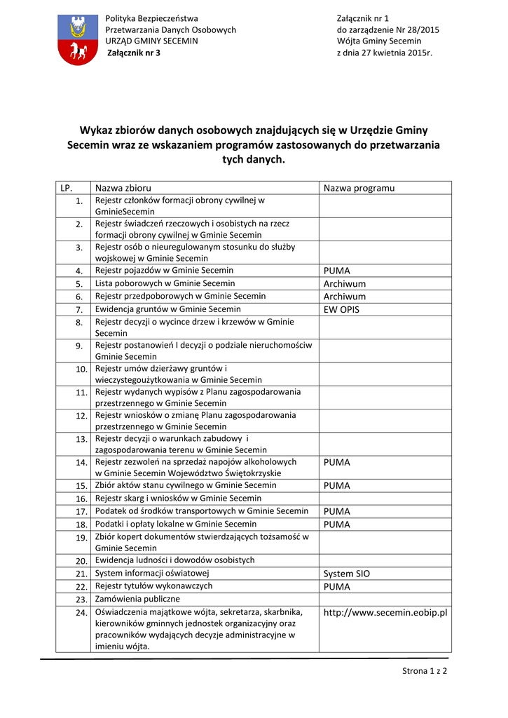 Polityka Bezpieczeństwa Przetwarzania Danych Osobowych URZĄD GMINY SECEMIN Załącznik nr 3 Załącznik nr 1 do zarządzenie Nr 28/2015 Wójta Gminy Secemin z dnia 27 kwietnia 2015r. Wykaz zbiorów danych osobowych znajdujących się w Urzędzie Gminy Secemin wraz ze wskazaniem programów zastosowanych do przetwarzania tych danych. LP. Nazwa zbioru 1. 2. 3. 4. 5. 6. 7. 8. 9. 10. 11. 12. 13. 14. 15. 16. 17. 18. 19. 20. 21. 22. 23. 24. Rejestr członków formacji obrony cywilnej w GminieSecemin Rejestr świadczeń rzeczowych i osobistych na rzecz formacji obrony cywilnej w Gminie Secemin Rejestr osób o nieuregulowanym stosunku do służby wojskowej w Gminie Secemin Rejestr pojazdów w Gminie Secemin Lista poborowych w Gminie Secemin Rejestr przedpoborowych w Gminie Secemin Ewidencja gruntów w Gminie Secemin Rejestr decyzji o wycince drzew i krzewów w Gminie Secemin Rejestr postanowień I decyzji o podziale nieruchomościw Gminie Secemin Rejestr umów dzierżawy gruntów i wieczystegoużytkowania w Gminie Secemin Rejestr wydanych wypisów z Planu zagospodarowania przestrzennego w Gminie Secemin Rejestr wniosków o zmianę Planu zagospodarowania przestrzennego w Gminie Secemin Rejestr decyzji o warunkach zabudowy i zagospodarowania terenu w Gminie Secemin Rejestr zezwoleń na sprzedaż napojów alkoholowych w Gminie Secemin Województwo Świętokrzyskie Zbiór aktów stanu cywilnego w Gminie Secemin Rejestr skarg i wniosków w Gminie Secemin Podatek od środków transportowych w Gminie Secemin Podatki i opłaty lokalne w Gminie Secemin Zbiór kopert dokumentów stwierdzających tożsamość w Gminie Secemin Ewidencja ludności i dowodów osobistych System informacji oświatowej Rejestr tytułów wykonawczych Zamówienia publiczne Oświadczenia majątkowe wójta, sekretarza, skarbnika, kierowników gminnych jednostek organizacyjny oraz pracowników wydających decyzje administracyjne w imieniu wójta. Nazwa programu PUMA Archiwum Archiwum EW OPIS PUMA PUMA PUMA PUMA System SIO PUMA http://www.secemin.eobip.pl Strona 1 z 2 Polityka Bezpieczeństwa Przetwarzania Danych Osobowych URZĄD GMINY SECEMIN Załącznik nr 3 25. 26. 27. 28. 29. 30. 31. 32. 33. 34. 35. 36. 37. 38. 39. 40. 41. 42. 43. 44. 45. 46. 47. 48. 49. 50. 51. 52. 53. 54. Oświadczenia majątkowe radnych Ewidencja miejscowości, ulic i adresów Opłaty śmieciowe Rejestr wniosków o udostępnienie informacji publicznej Ewidencja szamb Komisja alkoholowa (uzależnienia) Ochotnicza Straż Pożarna - ochrona przeciwpożarowa Postępowanie sprawdzające Rozgraniczenia Zakładowy Fundusz Świadczeń Socjalnych Sprzedaż nieruchomości gminnych Decyzje środowiskowe Skazani na prace społeczne Zwrot podatku akcyzowego Utylizacja azbestu Kontrahenci Urzędu Gminy Kadry i płace Płatnik Homenet Rejestr wydanych zaświadczeń Konkursy organizowane przez Urząd Gminy Lista stawiennictwa osób do kwalifikacji wojskowej Rejestr osób objętych rejestracją wojskową Korzystanie z przystanków autobusowych na terenie Gminy Kandydaci do pracy Dziennik korespondencji Rejestr upomnień Ewidencja działalności gospodarczej Portal MG Rejestr działalności regulowanej w zakresie odbierania odpadów komunalnych Zezwolenia na opróżnianie zbiorników bezodpływowych Załącznik nr 1 do zarządzenie Nr 28/2015 Wójta Gminy Secemin z dnia 27 kwietnia 2015r. http://www.secemin.eobip.pl PUMA PUMA PUMA http://www.secemin.eobip.pl PUMA PUMA PUMA Asseco PUMA http://ceidg.gov.pl http://www.secemin.eobip.pl http://www.secemin.eobip.pl Strona 2 z 2