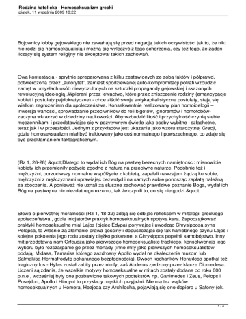 Rodzina katolicka - Homoseksualizm grecki piątek, 11 września 2009 10:22 Bojownicy lobby gejowskiego nie zawahają się przed negacją takich oczywistości jak to, że nikt nie rodzi się homoseksualistą i można się wyleczyć z tego schorzenia, czy też tego, że żaden liczący się system religijny nie akceptował takich zachowań. Owa kontestacja - sprytnie spreparowana z kilku zestawionych ze sobą faktów i półprawd, potwierdzona przez „autorytet”, zamiast spodziewanej auto-kompromitacji potrafi wzbudzić zamęt w umysłach osób niewyczulonych na sztuczki propagandy gejowskiej i skażonych rewolucyjną ideologią .Wpierani przez lewactwo, które przez zniszczenie rodziny (emancypacje kobiet i postulaty pajdokratyczne) - chce ziścić swoje antykapitalistyczne postulaty, stają się wielkim zagrożeniem dla społeczeństwa. Konsekwentnie realizowany plan homoidelogii – inwersja wartości, sprowadzanie przeciwników do roli bigotów, ignorantów i homofobówzaczyna wkraczać w dziedziny naukowości. Aby wzbudzić litość i przychylność czynią siebie męczennikami i przedstawiając się w pozytywnym świetle jako osoby wybitne i szlachetne, teraz jak i w przeszłości. Jednym z przykładów jest ukazanie jako wzoru starożytnej Grecji, gdzie homoseksualizm miał być traktowany jako coś normalnego i powszechnego, co zdaje się być przekłamaniem faktograficznym. (Rz 1, 26-28) "Dlatego to wydał ich Bóg na pastwę bezecnych namiętności: mianowicie kobiety ich przemieniły pożycie zgodne z naturą na przeciwne naturze. Podobnie też i mężczyźni, porzuciwszy normalne współżycie z kobietą, zapałali nawzajem żądzą ku sobie, mężczyźni z mężczyznami uprawiając bezwstyd i na samych sobie ponosząc zapłatę należną za zboczenie. A ponieważ nie uznali za słuszne zachować prawdziwe poznanie Boga, wydał ich Bóg na pastwę na nic niezdatnego rozumu, tak że czynili to, co się nie godzi." Słowa o pierwotnej moralności (Rz 1, 18-32) zdają się odbijać refleksem w mitologii greckiego społeczeństwa , gdzie inicjatorów praktyk homoseksualnych spotyka kara. Zapoczątkować praktyki homoseksualne miał Lajos (ojciec Edypa) porywając i uwodząc Chrysipposa syna Pelopsa, to właśnie za złamanie prawa gościny i dopuszczając się tak haniebnego czynu Lajos i kolejne pokolenia jego rodu zostały ciężko pokarane, a Chrysippos popełnił samobójstwo. Inny mit przedstawia nam Orfeusza jako pierwszego homoseksualistę trackiego, konsekwencją jego wyboru było rozszarpanie go przez menady (inne mity jako pierwszych homoseksualistów podają: Midasa, Tamarisa którego zazdrosny Apollo wydał na okaleczenie muzom lub Salmakisa-Hermafrodytę pokaranego bezpłodnością). Dwóch kochanków Heraklesa spotkał też tragiczny los - Hylas został zabity przez nimfy, zaś Abderos zjedzony przez klacze Diomedesa. Uczeni są zdania, że wszelkie motywy homoseksualne w mitach zostały dodane po roku 600 p.n.e , wcześniej były one pozbawione takowych podtekstów np. Ganimedes i Zeus, Pelops i Posejdon, Apollo i Hiacynt to przykłady męskich przyjaźni. Nie ma tez wątków homoseksualnych u Homera, Hezjoda czy Archilocha, pojawiają się one dopiero u Safony (ok. 1/4 Rodzina katolicka - Homoseksualizm grecki piątek, 11 września 2009 10:22 600 r. p.n.e) i Solona (ok. 590 r. p.n.e). Wkroczenie pederastii do mitów jest jej pewnego rodzaju olimpijską apologią. Doszukiwanie się takich skłonności u Achillesa i Patroklesa jest nadinterpretacja i nie ma potwierdzenia w tekście Iliady czy Odysei , znajdujemy tam zaś wiele informacji o heteroseksualności owych bohaterów. Warto natomiast zwrócić uwagę na słowa Odyseusza skierowane do Achillesa dotyczące branki Bryzeidy, którą miał mu oddać Agamemnon: (XIX; 175) „Niechże ci złoży przysięgę wobec Argiwów, że nigdy w łoże nie wstąpiła z Bryzejdą, aby z nią zaznać miłości tak jak to bywa Z NATURY między kobietą i mężem”. U Homera zatem porządnie zgodne z naturą jest pożądaniem miedzy kobieta a mężczyzną. Dobrym przykładem w mitologii jest Ifis która aby nie pożądać wbrew naturze prosi bogów o pomoc i zostaje przemieniona w mężczyznę. Z praktykami homoseksualnymi możemy się spotkać w starożytnej Grecji na trzech płaszczyznach 1)pederasta 2)prostytucja 3)homoseksualizm właściwy . Pederastia ( od pais dziecko, chłopiec, eran- kochać) była nierozerwanie związane z systemem edukacyjnym. Dorosły mężczyzna - erasthes ( wielbiciel, kochanek) w sposób który urósł do miana ceremoniału, próbował zwrócić uwagę eromenosa (ukochanego, uwielbionego) licznymi podarkami i komplementami, nawet już samo chodzenie za młodzieńcem było formą adoracji. Okazją ku temu były ćwiczenia w gimnazjonie i palestrze, tam bez przeszkód można było podziwiać ciało i zdolności eromenosa. Było to również dogodne miejsce, aby przy okazji różnego rodzaju ćwiczeń doprowadzić do fizycznego kontaktu. Jeśli dochodziło do kontaktów zmysłowych miedzy takową parą, było to akceptowane tylko do czasy pojawienia się owłosienia na brodzie i torsie eromenosa, zatem wiek chłopców wahał się od 12 do20 lat. Akt seksualny był stosunkiem miedzy-udowym, eromenos powinien możliwie biernie obserwować swojego erasthesa i w przeciwieństwie do kobiety nie czerpać przyjemności ze stosunku. Penetracja była wykluczona - przynosiła hańbę, dopuszczano ją tylko wśród niewolników i niższych klas. Stosunki te były pod ścisłą kontrolą i musiały dobiec końca wraz z pełnoletniością ermoenosa. Podstawą takiego zawiasku był aspekt pedagogiczny, podejście czysto hedonistyczne przynosiło niesławę i nie było akceptowane. Po kilku latach eromenos sam stawał się erasthesem, a miedzy nim a jego mentorem związek zmieniał się w hetairia (koleżeństwo). W dobrym tonie było, aby niezbyt szybko ulec swojego erasthesowi, a często nawet w ogóle nie docho