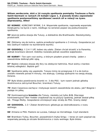 NA ŻYWO: Touluse - Paris Saint-Germain PSGFC.pl - Polskie centrum kibiców Paris Saint-Germain - News Witam serdecznie, dziś o 14 ruszyło spotkanie pomiędzy Toulouse a Paris Saint-Germain w ramach 25 kolejki Ligue 1. Z powodu braku zapowiedzi spotkania postanowiliśmy spróbować swoich sił w relacji na żywo. Zapraszamy, Allez! 93' KONIEC. KOŃCOWY WYNIK, 2:4. Wspaniałe spotkanie, naprawdę wspaniałe. Dziękujemy na bycie z nami, niedługo na serwisie pojawi się podsumowanie spotkania. 93' Jeszcze jedna okazja dla Tuluzy, a dokładnie dla Braithwaite. Niestety/stety, przestrzelił. 91' Zbliżamy się do końca, sędzia przedłużył spotkanie o 3 minuty. Gospodarze już bez żadnych nadziei na wyrównanie wyniku. 89' GOOOOLL !! 2:4 !! Uff, ledwo się udalo. Zlatan chciał strzelić a la Panenka, jednak bramkarz obronił. Dobitka rozwiała jednak wszelkie wątpliwości. 88' KARNY ! Ten sam rzut wolny, o którym pisałem przed chwilą - jeden z zawodników dotknął piłki ręką. 87' Będzie ciekawa okazja dla Ibry na zdobycie hattricka. Rzut wolny z bardzo bliskiej odległości. Będzie gol? 85' Spotkanie jakby się uspokoiło. Tuluza mimo że przegrywa 2:3 a do końca zostało niewiele ponad 4 minuty, nie atakują. Czekają spokojnie na swoją okazję. Dziwne. 77' Było blisko powtórzenia bramki nr. 3 dla PSG - tym razem jednak główkę Ibrahimovica zatrzymał Boucher, bramkarz Tuluzy. 75' Alain Casanova zachęca i motywuje swoich zawodników do ataku. Jak? Biegnie i podaje im piłkę. 72' Kontrowersyjna bramka dla Tuluzy, niestety już tylko 2:3. Dlaczego kontrowersyjna? Ben Yedder znajdował się na pozycji spalonej, jednak dostał piłkę od.. Thiago Motty. Gospodarze zmniejszyli więc stratę do PSG. Gramy dalej! 69' GOOOOOL, 1:3 ! Zlatan Ibrahimovic główkuje po dośrodkowaniu z rzutu wolnego. 66' Zmiana w PSG: Pastore za Lucasa, Cabaye za Verrattiego. Czyli standard. 64' Bramkarz Tulizy, Boucher, pozazdrościł chyba Sirigu - i teraz on sam popisał się wspaniałą paradą po strzale Ibrahimovica z rzutu wolnego. Było blisko. 1/3 NA ŻYWO: Touluse - Paris Saint-Germain PSGFC.pl - Polskie centrum kibiców Paris Saint-Germain - News 61' Wspaniała obrona strzału Auriera przez Sirigu. Dośrodkowanie i groźna główka, na szczęście zatrzymana przez Włocha. Brawo! 55' GOOOOOOOOOOOL ! LAVEZZI ! Strzałem w długi słupek zaskoczył bramkarza Tuluzy. Wszystko dzięki błędzie w przyjęciu Matuidiego, piłkę przejął Argentyńczyk i bez zastanowienia uderzył. 1:2 ! 52' Bardzo dobre włączenie się do ataku Akpy-Akpro. Zabrakło jedynie wykończenia, zaś trzeba pochwalić gracza Tuluzy za odwagę przy tym rajdzie. 48' Motta całkiem zgrabnie udał, że coś mu dolega, kiedy to.. kopnął Chantome. Niezła gra aktorska. 46' zaczynamy drugą odsłonę! 45' Koniec pierwszej połowy. Jesteśmy świadkami świetnego spotkania. Czekamy na drugie 45 minut! 44' GOL! Świeetna akcja Didota, który pociągnął piłkę prawą strona boiska i dośrodkował wprost na nogę Ben Yeddera. Wyrównanie, niestety. 42' Ojojoj! Thiago Silva minął się z piłką, a powinien umieścić ja w siatce! Świetny drybling Ibrahimovica w polu karnym Tuluzy, gdyby nie dekoncentracja Brazylijczyka, byłoby 2:0 38' Groźny strzał Matuidiego, którego zatrzymał... słupek. Otwarta gra z obu stron, przyjemnie się to ogląda. 35' Tuluza rzuciła się do ataku po stracie bramki. Mamy rożny, po wybiciu Verrattiego. 32' GOOOOOL !! Znany scenariusz - @Ibrahimovic wychodzi w pierwszej jedenastce w spotkaniu L1, więc oczywiście strzela bramkę. Jakie to proste.. 31' KARNY !! Podyktowany po faulu na Lavezzim! 29' Teraz Verratti! Jego strzał minimalnie minął bramkę! Główkował w polu karnym po rzucie rożnym, jednak zabrakło centymetrów. 27' Świetna okazja dla Toulouzy! Tylko słupek i brak spokoju Braithwaite ratuje Paryżan przed stratą bramki! Powinno być już 1:0 ! 25' Żółta kartka dla Thiago Motty za domaganie się pokazania kartonika dla jednego z rywali. Sędzia niewzruszony. 21' Groźne dośrodkowanie Ibrahimovica w pole karne, niestety środkowy obrońca 2/3 NA ŻYWO: Touluse - Paris Saint-Germain PSGFC.pl - Polskie centrum kibiców Paris Saint-Germain - News Tuluzy, Yago, wybił futbolówkę głową. 17' Dopiero w 17 minucie zobaczyliśmy ofensywną akcję Maxwella na lewej flance. Pierwszą.. Co pokazuje, że Paryżanie wciąż nie przejęli kontroli nad spotkaniem. 14' Furman zaczął spotkanie na ławce i nic dziwnego, bowiem trio Didot, Chantome, Aguilar bardzo dobrze sobie radzi w tym spotkaniu. Kontrolują przebieg. 8' Gospodarze są stroną przeważającą, znacznie częściej atakują na bramkę rywala. W środku grasuje wypożyczony z Paryża Clement Chantome. Ciekawe czy po sezonie wróci do zespołu.. 5' Tuluza wyszła w systemie 3-5-2, z którym Paryżanie nie mieli jeszcze do czynienia. Widać, że nie wiedzą jeszcze, jak umiejętnie atakować. 1' Pierwszy rzut rożny dla PSG, dośrodkowywał Thiago Motta. Bez zagrożenia. Skład PSG: Sirigu; Van der Wiel, Alex, Thiago Silva, Maxwell; Matuidi, Thiago Motta, Verratti; Lucas, Ibrahimovic, Lavezzi. Skład Tuluzy: Boucher; Veskovac, Yago, Spajic; Aurier, Didot, Aguilar, Chantome, Akpa-Akpro; Braithwaite, Ben Yedder. Autor: kublu 3/3 Powered by TCPDF (www.tcpdf.org)