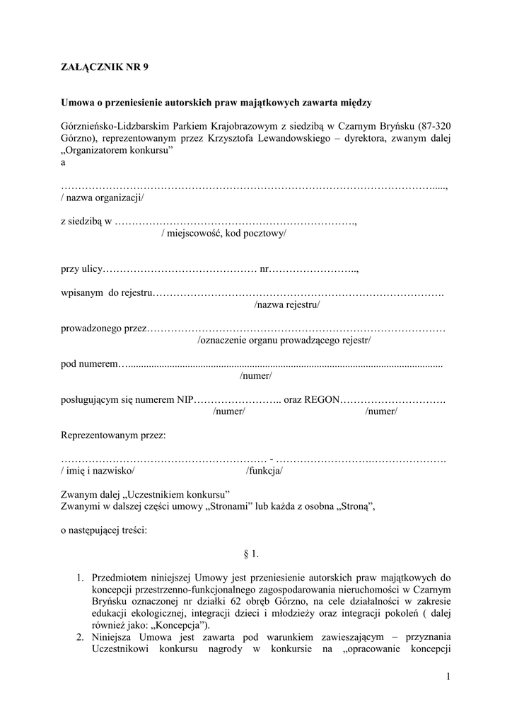 ZAŁĄCZNIK NR 9 Umowa o przeniesienie autorskich praw majątkowych zawarta między Górznieńsko-Lidzbarskim Parkiem Krajobrazowym z siedzibą w Czarnym Bryńsku (87-320 Górzno), reprezentowanym przez Krzysztofa Lewandowskiego – dyrektora, zwanym dalej „Organizatorem konkursu” a ………………………………………………………………………………………………....., / nazwa organizacji/ z siedzibą w ……………………………………………………………., / miejscowość, kod pocztowy/ przy ulicy……………………………………… nr…………………….., wpisanym do rejestru…………………………………………………………………………. /nazwa rejestru/ prowadzonego przez…………………………………………………………………………… /oznaczenie organu prowadzącego rejestr/ pod numerem….......................................................................................................................... /numer/ posługującym się numerem NIP…………………….. oraz REGON…………………………. /numer/ /numer/ Reprezentowanym przez: …………………………………………………… - ……………………….…………………. / imię i nazwisko/ /funkcja/ Zwanym dalej „Uczestnikiem konkursu” Zwanymi w dalszej części umowy „Stronami” lub każda z osobna „Stroną”, o następującej treści: § 1. 1. Przedmiotem niniejszej Umowy jest przeniesienie autorskich praw majątkowych do koncepcji przestrzenno-funkcjonalnego zagospodarowania nieruchomości w Czarnym Bryńsku oznaczonej nr działki 62 obręb Górzno, na cele działalności w zakresie edukacji ekologicznej, integracji dzieci i młodzieży oraz integracji pokoleń ( dalej również jako: „Koncepcja”). 2. Niniejsza Umowa jest zawarta pod warunkiem zawieszającym – przyznania Uczestnikowi konkursu nagrody w konkursie na „opracowanie koncepcji 1 przestrzenno-funkcjonalnego zagospodarowania nieruchomości w Czarnym Bryńsku na cele działalności w zakresie edukacji ekologicznej, integracji dzieci i młodzieży oraz integracji pokoleń”. 3. W celu uniknięcia wątpliwości Strony zgodnie potwierdzają, że warunek uważają za spełniony z dniem publikacji ogłoszenia wyników Konkursu. §2 Uczestnik konkursu oświadcza, że: a) wyłącznie jemu w sposób nieograniczony przysługują wszelkie prawa do koncepcji , o której mowa w § 1 niniejszej umowy, w tym nieograniczone autorskie prawa osobiste i majątkowe, prawa te nie są w żaden sposób ograniczone lub obciążone prawami osób trzecich oraz, że Koncepcja nie narusza praw osób trzecich. b) Koncepcja została stworzona bez udziału osób trzecich oraz bez zaciągania do dnia dzisiejszego jakichkolwiek zobowiązań, które ograniczają lub wyłączają prawo Uczestnika konkursu do przeniesienia przysługujących mu praw na Organizatora. c) Koncepcja stanowi w całości utwór oryginalny, nie narusza praw autorskich osób trzecich, jest wolna od jakichkolwiek zapożyczeń oraz nie mają miejsca żadne inne okoliczności, które mogłyby narazić Organizatora konkursu na odpowiedzialność wobec osób trzecich z tytułu korzystania lub rozpowszechniania dzieła. d) Nie udzielił żadnej osobie licencji uprawniającej do korzystania Koncepcji. e) Posiada wyłączne prawo do udzielania zezwoleń na rozporządzenie i korzystanie z Koncepcji. f) Prawa i zezwolenia, o których mowa w niniejszych postanowieniach, obejmują całość praw i zezwoleń, niezbędnych do eksploatacji Koncepcji w zakresie określonym w niniejszej umowie. g) Przenosi na Organizatora konkursu wszelkie prawa do Koncepcji na warunkach wynikających z niniejszej umowy. §3 1. Strony oświadczają, że Organizator konkursu z chwilą ogłoszenia wyników konkursu nabywa autorskie prawa majątkowe do koncepcji przestrzenno-funkcjonalnego zagospodarowania nieruchomości w Czarnym Bryńsku na cele działalności w zakresie edukacji ekologicznej, integracji dzieci i młodzieży oraz integracji pokoleń, stanowiącej utwór w rozumieniu przepisów ustawy z dnia 4 lutego 1994r. o prawie autorskim i prawach pokrewnych ( tekst jedn.: Dz.U. z 2006r. Nr 90, poz. 631 z późn. zm.) na wszelkich znanych w chwili obowiązywania rozporządzenia polach eksploatacji, w tym wszystkich polach eksploatacji wymienionych w art. 50 ustawy o prawie autorskimi prawach pokrewnych, a w szczególności na następujących polach eksploatacji: a) utrwalanie i zwielokrotnianie w wersji elektronicznej i zapisu magnetycznego, b) wprowadzanie do pamięci komputera, c) wytwarzanie dowolną techniką egzemplarzy utworu, d) rozpowszechnianie, publikowanie, wielokrotne wyświetlanie utworu zgodnie z przeznaczeniem pod adresami domenowymi Organizatora konkursu, e) publikowanie poszczególnych elementów graficznych składających się na utwór w jakiejkolwiek formie publikacji, f) w zakresie obrotu oryginałem albo egzemplarzami, na których utwór utrwalonowprowadzanie do obrotu, użyczenie lub najem oryginału albo egzemplarzy utworu, 2 g) prawo do dalszego przetwarzania i wykorzystywania elementów dzieła, prawo dop wykorzystania każdej odrębnej części, jak i całości opracowań wchodzących w przedmiot Umowy dla potrzeb wszelkich dalszych opracowań wykonywanych na zlecenie Organizatora. 2. Uczestnik konkursu zezwala Organizatorowi z chwilą ogłoszenia wyników konkursu na dokonanie, rozporządzanie i korzystanie z opracowania Koncepcji, oraz z chwilą ogłoszenia wyników konkursu przenosi na Organizatora konkursu uprawnienie do udzielania zezwoleń na rozporządzenie i korzystanie z „opracowania koncepcji przestrzenno-funkcjonalnego zagospodarowania nieruchomości w Czarnym Bryńsku na cele działalności w zakresie edukacji ekologicznej, integracji dzieci i młodzieży oraz integracji pokoleń”. Rozporządzenie prawami z niniejszej umowy nie jest ograniczone czasow