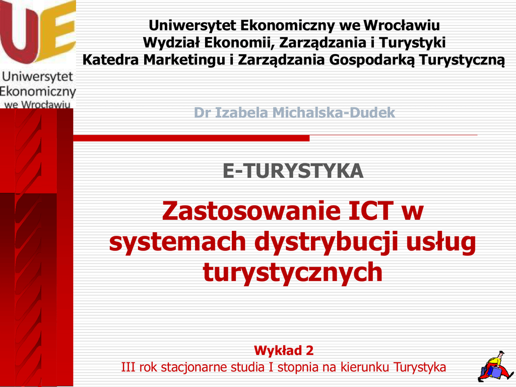 Uniwersytet Ekonomiczny we Wrocławiu Wydział Ekonomii, Zarządzania i Turystyki Katedra Marketingu i Zarządzania Gospodarką Turystyczną Dr Izabela Michalska-Dudek E-TURYSTYKA Zastosowanie ICT w systemach dystrybucji usług turystycznych Wykład 2 III rok stacjonarne studia I stopnia na kierunku Turystyka WPROWADZENIE Począwszy od przełomu lat 2008/2009 w Polsce można mówić o tzw. trzeciej fali marketingu, która związana jest z PROCESAMI WIRTUALIZACJI RYNKÓW [Królewski, Sala, 2014, s. 12-14]. WPROWADZENIE Umownie wskazać można w niej kilka przełomowych punktów, tzw. kamieni milowych: -usprawnienie klientami i kontaktów z kontrahentami dzięki rozwojowi poczty elektronicznej; stopniowe zastępowanie katalogów, folderów, ulotek przez zawartość stron www, a także realny głos konsumentów dzielących się swoimi opiniami na blogach czy tematycznych forach internetowych; WPROWADZENIE - zmiany w sferze handlu – powstawanie sklepów internetowych oraz porównywarek cen. Z kolei następstwem gwałtownego wzrostu znaczenia Internetu jako miejsca poszukiwania informacji, istotne stało się pozycjonowanie w wyszukiwarkach; -początek ery mediów społecznościowych, których znaczenia rośnie tak w życiu konsumentów, jak i na tle Internetu; -wyłaniający się dopiero krok to era videocastów, wideoblogów (vlogów), wideo e-maili i wideo MMSów oraz marketing mobilny [por. Królewski, Sala, 2014, s. 12-14]. Wśród trendów, które zdaniem ekspertów wpływać będą na działania z zakresu marketingu w kolejnych latach wskazuje się: marketing mobilny, format wideo, personalizację narzędzi marketingowych, dostosowanie ich do potrzeb indywidualnego odbiorcy, gromadzenie danych w realiach nowych mediów, automatyzację marketingu [Dyrcz, 2014, s. 6-9]. Przemiany te wyposażają zarówno przedsiębiorstwa, jak i klientów w bogactwo środków oraz możliwości w pełnieniu swoich rynkowych ról, dostarczając impulsów do ciągłego dostosowywania rozwiązań organizacyjnych do potencjału jaki daje technologia informacyjna. Głównym tworzywem tych przemian jest wiedza, a celem doskonałość w generowaniu i dostarczaniu wartości dla klienta. ADAPTACJA NARZĘDZI MARKETINGOWYCH DO NOWYCH MEDIÓW Analizując współczesne podręczniki marketingu, czytelnik może odczuwać dysonans poznawczy;) z jednej strony książki poświęcone marketingowi internetowemu niemal zupełnie nie odwołują się do wcześniejszych koncepcji marketingowych; z drugiej strony klasyczne podręczniki marketingowe poświęcają Internetowi niewiele miejsca. W dzisiejszych czasach uwaga powinna być skupiona na możliwości adaptacji sprawdzonych koncepcji marketingowych do warunków panujących na rynkach wirtualnych co pozwoli zbudować POMOST ŁĄCZĄCY MARKETING STARYCH I NOWYCH MEDIÓW. Odnosząc się do klasycznych koncepcji marketingowych technologie internetowe stanowią: wzbogacenie dwóch z czterech elementów marketingu-mix (promocji i dystrybucji) o nowe kanały dotarcia do potencjalnych nabywców; poszerzenie możliwości narzędzi relacji (dzięki mediom marketingu społecznościowym, mailingowi czy narzędziom mobile marketingu). MARKETING 3.0 Współczesne firmy zrozumiały, że muszą dotrzeć do świadomych i wykorzystujących zdobycze technologiczne klientów. Ph. Kotler określa to ostateczne zerwanie z wcześniejszymi modelami biznesowymi przejściem do Marketingu 3.0. Wyjście poza obszar, w którym skupiano się na produkcie (Marketing 1.0) i ten, w którym koncentrowano się na konsumencie (Marketing 2.0), oznacza holistyczne podejście do klienta jako wielowymiarowego, wyznającego wartości człowieka, który może stać się współpracującym z nami partnerem. To jest właśnie Marketing 3.0. MARKETING 3.0 W koncepcji marketingu 3.0 autorzy zauważają, że marketing masowy (1.0) i zindywidualizowany (2.0) zaczynają ustępować koncepcji komunikowania się wszystkich ze wszystkimi (3.0). Nigdy dotąd świat nie dysponował możliwościami sprawiającymi, że nie tylko firmy sprzedają firmom (B2B) i firmy konsumentom (B2C), ale również konsumenci konsumentom (C2C - Allegro) czy konsumenci firmom (C2B - product placement w znanych video blogach). STRATEGIE MARKETNGOWE 3.0. W kontekście tworzenia marketingowych 3.0 warto odwołać klasycznej teorii Harrego Igora Ansoff’a. strategii się do STRATEGIE MARKETNGOWE 3.0. Oprócz 4 klasycznych strategii mamy do czynienia z 5 strategiami w warunkach wirtualizacji produktów i rynków. Strategia wirtualizacji rynku – dotarcie z ofertą do nowych grup klientów przez wykorzystanie wirtualnych kanałów dystrybucji (e-commerce). Strategia wirtualizacji produktu – zaoferowanie obecnym klientom dodatkowej wartości w postaci nowych wirtualnych produktów lub częściej usług np. dodatkowych funkcjonalności z wykorzystaniem stron www (wirtualne konfiguratory produktów) czy też e-mailingu (alerty cenowe). Strategia dywersyfikacji wirtualnej rynku – skierowanie nowej oferty (nowego asortymentu produktów i usług) także do nabywców na rynkach wirtualnych. Strategia dywersyfikacji wirtualnej produktu – sytuacja, gdy nowym klientom firma oferuje dodatkowe usługi lub produkty wirtualne (przewodniki po danej destynacji w postaci e-booków dla każdego nowego klienta biur podróży). Strategia dywersyfikacji contentu (treści) – najbardziej zaawansowana i złożona ze strategii, w której firma decyduje się na dotarcie z nowym produktem wirtualnym do zupełnie nowej grupy klientów. SEGMENTACJA KLIENTÓW W EPOCE NOWYCH MEDIÓW Koncepcje marketingu na poziomie taktycznym w największym stopniu odzwierciedlają takie narzędzia jak STP (segmentacja – targeting – pozycjonowanie) oraz strategie konkurencji (według Michael Portera). Na szczególną zasługuje idea segmentacji klientów w epoce nowych mediów zaproponowana przez Andrzeja Garapicha. NOWA SEGMENTACJI KLIENTÓW Z kolei Michael Porter zwraca uwagę, iż