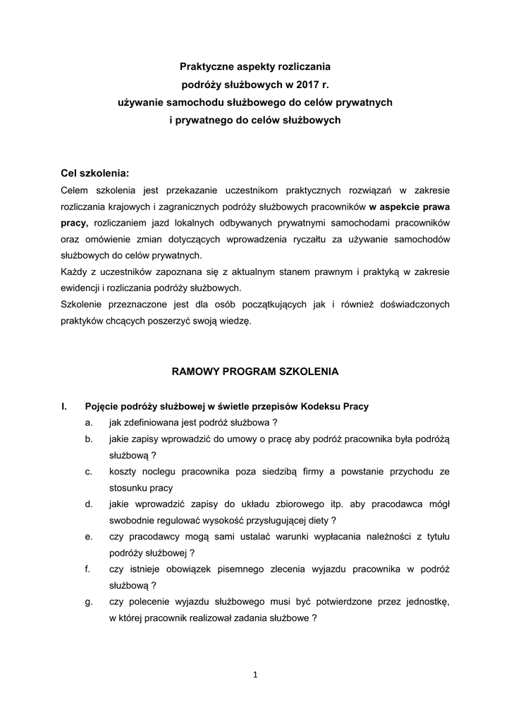 Praktyczne aspekty rozliczania podróży służbowych w 2017 r. używanie samochodu służbowego do celów prywatnych i prywatnego do celów służbowych Cel szkolenia: Celem szkolenia jest przekazanie uczestnikom praktycznych rozwiązań w zakresie rozliczania krajowych i zagranicznych podróży służbowych pracowników w aspekcie prawa pracy, rozliczaniem jazd lokalnych odbywanych prywatnymi samochodami pracowników oraz omówienie zmian dotyczących wprowadzenia ryczałtu za używanie samochodów służbowych do celów prywatnych. Każdy z uczestników zapoznana się z aktualnym stanem prawnym i praktyką w zakresie ewidencji i rozliczania podróży służbowych. Szkolenie przeznaczone jest dla osób początkujących jak i również doświadczonych praktyków chcących poszerzyć swoją wiedzę. RAMOWY PROGRAM SZKOLENIA I. Pojęcie podróży służbowej w świetle przepisów Kodeksu Pracy a. jak zdefiniowana jest podróż służbowa ? b. jakie zapisy wprowadzić do umowy o pracę aby podróż pracownika była podróżą służbową ? c. koszty noclegu pracownika poza siedzibą firmy a powstanie przychodu ze stosunku pracy d. jakie wprowadzić zapisy do układu zbiorowego itp. aby pracodawca mógł swobodnie regulować wysokość przysługującej diety ? e. czy pracodawcy mogą sami ustalać warunki wypłacania należności z tytułu podróży służbowej ? f. czy istnieje obowiązek pisemnego zlecenia wyjazdu pracownika w podróż służbową ? g. czy polecenie wyjazdu służbowego musi być potwierdzone przez jednostkę, w której pracownik realizował zadania służbowe ? 1 II. Rozliczanie podróży służbowych 1. Wspólne przepisy dotyczące krajowych i zagranicznych podróży służbowych a. jakie należności przysługują pracownikowi z tyt. podróży służbowej ? b. czy pracownikowi należy się zwrot za wyżywienie ? c. czy samowolna zmiana środka transportu w podróży jest podstawą do zwrotu poniesionych kosztów ? d. jakie należy spełnić warunki aby pracownik mógł odbyć podróż prywatnym samochodem ? e. jakie powstaną konsekwencje w przypadku zwrotu pracownikowi kosztów benzyny zamiast tzw. kilometrówki ? f. czy pracodawca ma prawo obniżyć wysokość tzw. kilometrówki ? g. czy pracownikowi przysługuje zwrot poniesionych kosztów w przypadku utraty np. biletu na przejazd PKP ? h. czy pracodawca ma obowiązek zwrócić pracownikowi wydatki za przejazd płatną autostradą lub za płatny parking ? i. czy pracodawca ma prawo odmówić zwrotu poniesionych wydatków jeżeli pracownik rozliczył się po terminie ? 2. Podróż krajowa Dieta: a. jaka wysokość diety przysługuje pracownikowi, który powrócił z podróży w tej samej dobie ? b. jaka wysokość diety przysługuje pracownikowi, który przebywał w podróży kilka dni ? c. jakie sytuacje powodują, że dieta pracownikowi nie przysługuje ? d. o ile należy pomniejszyć wysokość diety, w przypadku gdy w hotelu zapewniono pracownikowi śniadanie ? e. czy obiad z kontrahentem ma wpływ na wysokość przysługującej diety ? f. czy zwrot pracownikowi kosztów wyżywienia wygeneruje u niego przychód ? g. czy rozpoczęcie podróży służbowej w dniu wolnym daje pracownikowi prawo do diety ? Koszt noclegu: a. w jakich sytuacjach pracownikowi przysługuje zwrot kosztów noclegu a kiedy ryczałt ? b. czy kierowcy należy wypłacić ryczałt za nocleg w przypadku kiedy pracodawca wyposażył samochód w miejsce do spania ? c. czy powstanie u pracownika przychód w przypadku zwrotu kosztu noclegu powyżej określonego limitu ? 2 d. w jakich sytuacjach pracodawca może odmówić wypłaty ryczałtu ? Koszty dojazdów: a. w jakich sytuacjach pracownikowi przysługuje zwrot kosztów dojazdu a kiedy ryczałt ? b. 3. w jakich sytuacjach pracodawca może odmówić wypłaty ryczałtu ? Podróż zagraniczna a. jak liczyć czas podróży zagranicznej w zależności od środka transportu ? b. jak liczyć czas łącznej podróży służbowej połączonej z odbyciem podróży krajowej ? c. jak udokumentować moment przekroczenia granicy poszczególnych państw ? Dieta: a. na jaki cel przeznaczona jest dieta ? b. czy istnieje możliwość wypłaty diety niższej niż z rozporządzenia ? c. czy zapewnione śniadanie w cenie noclegu ma wpływ na wysokość diety ? d. jakie sytuacje zwalniają z obowiązku wypłaty diety ? Koszty przejazdów i dojazdów: a. jaka wysokość ryczałtu przysługuje pracownikowi, któremu zapewniono dojazd do hotelu z lotniska ? b. czy pracownikowi można zwrócić faktyczne koszty poniesione w związku z dojazdem środkami komunikacji miejscowej ? c. w jakich sytuacjach ryczałt nie przysługuje ? Koszty noclegu: a. jaka wysokość zwrotu przysługuje pracownikowi za nocleg ? b. czy zwrot wyższych kosztów niż ustalony limit wygeneruje u pracownika przychód ? III. Zaliczki pieniężne a. czy pracodawca ma obowiązek wypłacić zaliczkę w przypadku podróży krajowej lub zagranicznej ? b. czy w przypadku zaliczki na podróż zagraniczną wypłacamy ją w walucie obcej czy polskiej ? 3 IV. Rozliczanie czasu pracy w podróży służbowej a. jak rozliczyć czas pracy w podróży służbowej ? b. czy dojazd i powrót z podróży przypadającej poza godzinami pracy należy wliczyć do czasu pracy ? c. ile godzin odpoczynku należy zapewnić pracownikowi po zakończonej podróży służbowej ? d. V. kiedy powstaną nadgodziny w podróży służbowej i jak je zrekompensować ? Używanie samochodu służbowego do celów prywatnych a. jak ustalić wartość pieniężną nieodpłatnego świadczenia dla pracownika ? b. jak ustalić wartość pieniężną nieodpłatnego świadczenia zleceniobiorcy ? c. jak pomniejszyć ryczałt za dni nieobecności pracownika w pracy ? d. czy zakupione paliwo przez pracodawcę wchodzi do wysokości miesięcznego limitu ? e. jak ustalić przychód w przypadku wypłaty wynagrodzenia w następnym miesiącu ? VI. Ryczałt na jazdy lokalne a. podstawy prawne wypłaty rycza