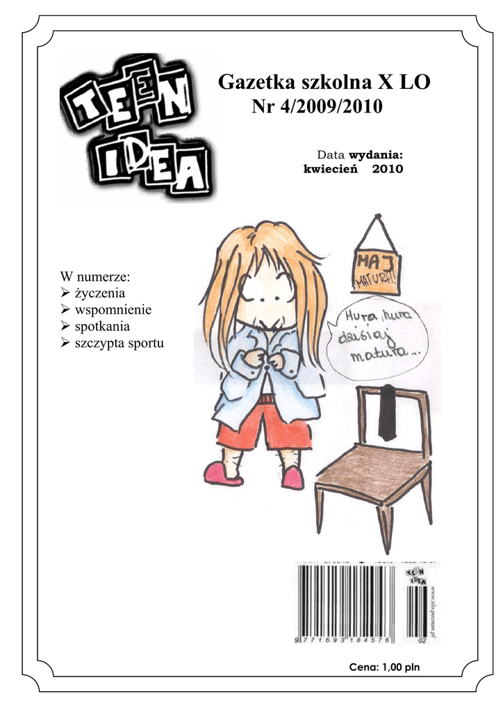 Gazetka szkolna X LO Nr 4/2009/2010 Data wydania: kwiecień 2010 W numerze: życzenia wspomnienie spotkania szczypta sportu Cena: 1,00 pln Kochani Maturzyści! To już! Lada moment zakończą się Wasze trzy lata nauki w X LO. Te gorzkie, męczące chwile, kiedy siedziało się nad książkami, by zdobyć jak najlepsze oceny na świadectwo, a może przede wszystkim, doskonale zdać maturę... To już! Skończyły się te wszystkie szczęśliwe chwile, radosne, wywołujące miłe wspomnienia, ryki śmiechu...To już! To już... Czego warto życzyć Wam na kolejne dni, miesiące, lata – już nie te szkolne? Z pewnością pamięci idealnej, na ponoć najważniejszy w Waszym życiu egzamin (albo raczej sztafetę egzaminów...). Tego, by stres pozwolił się wyspać; by każda i każdy z Was dostał podnoszący na duchu uśmiech nim usiądziecie przy arkuszach; by pogoda nie była w tych doniosłych dniach paskudna... i by nie była zbyt piękna... bo myśli się rozpraszają ;) Oczywiście, nie może zabraknąć życzeń: dostania się na ukochane studia, czasu, cierpliwości, pomyślności, szczęścia, wiary i pewności siebie! :) Kochani „Dziesiątkowicze”, życzę również, abyście, przechodząc obok naszej Szkoły, pomyśleli o niej z sentymentem; by, jeśli na nią spojrzycie, przypominał Wam się czas i owocnej pracy, i niezapomnianych momentów, klasowych wycieczek, Wigilii, uroczystości... zwykłych niezwykłych dni – bo spędziliście je w murach tego liceum, wśród osób, które pozostały w Waszej pamięci. Na koniec – życzę tej jednej, jedynej chwili zadumy nad wczoraj, dzisiaj i jutro. O czym pomyśleliście? W imieniu redakcji „Teen Idea” Natalia Matuszewska IG TRAGEDIA W SMOLEŃSKU W sobotę 10 kwietnia br. całą Polskę i świat obiegła wiadomość o rozbiciu się rządowego samolotu z prezydentem RP na pokładzie. Niemal od samego początku było wiadomo, że nikt z dziewięćdziesięciu sześciu pasażerów nie przeżył katastrofy. Zapewne trudno nam było uwierzyć w to, co się stało, ale słuchając coraz to nowszych wieści spod Katynia, powoli uświadamialiśmy sobie, że ta tragedia naprawdę się wydarzyła. Do Polski zaczęły napływać kondolencje i wyrazy współczucia z wielu krajów. Pod Pałacem Prezydenckim zebrały się tłumy ludzi, zostawiając kwiaty i zapalając znicze, w kościołach modlono się za zmarłych. W ten dzień Polska utraciła bardzo wiele. Zginęli nie tylko posłowie, senatorowie, wojskowi i funkcjonariusze BORu. Musimy pamiętać, że zginęli ludzie tacy jak my, poza pracą mający rodziny – dzieci, żony, mężów. My, po zdjęciu flag z kirem, zapomnimy o nich, jedni z nas szybciej, drudzy później, ale w końcu zapomnimy. Są jednak osoby, którym wspomnienia zmarłych nie będą dawały spokoju przez jeszcze długi czas. Puste miejsca przy stole, na ławie poselskiej, w kancelariach - wszystko to będzie kojarzyć się z tym, że tych ludzi już nie ma. Wciąż zadajemy sobie pytania, na które być może nigdy nie otrzymamy odpowiedzi. Dlaczego doszło to tej tragedii? Czy można było jej zapobiec? Kto jest winny? Nadal nie znamy dokładnej przyczyny katastrofy, wiadomo jednak że nie był to zamach terrorystyczny, choć i tak niektórzy snują teorie spiskowe na ten temat. Na szczęście znaleziono czarne skrzynki, które pomogą ustalić wszystkie okoliczności i odtworzyć jak mogły wyglądać ostatnie chwile pasażerów rządowego Tupolewa. Katyń stał się dla nas symbolem śmierci kolejnych Polaków. Niektórzy skłaniają się ku stwierdzeniu, że ta ziemia woła o polską krew. W 1940 roku Rosjanie wymordowali naszych oficerów, inżynierów, uczonych i profesorów z obawy przed nimi, dla zabicia polskości. Teraz do tej daty dołączy rok 2010. Pytamy się jaki był sens tej katastrofy? Jeśliby wierzyć w to, że śmierć tylu ludzi może mieć w ogóle jakikolwiek sens, można by skłonić się ku stwierdzeniu, iż pomogło to w ukazaniu całemu światu prawdy o zbrodni katyńskiej. W niektórych krajach nie zdawano sobie sprawy, że coś tak okropnego miało miejsce, po 10 kwietnia nagle się to zmieniło. W Rosji, na kanale ogólnego dostępu w godzinach największej oglądalności, wyemitowano nawet film Andrzeja Wajdy „Katyń”. Lidia Jóźwiak IG Spotkanie z przedstawicielką Rzeczypospolitej do Parlamentu Europejskiego – poseł Sidonią Jędrzejewską O Parlamencie Europejskim, pracy i życiu posła, a także o sprawie najbliższej licealistom – efektywnym studiowaniu za granicą – rozmawialiśmy z poseł Sidonią Jędrzejewską, podczas spotkania 17 lutego br. w jej biurze poselskim. Na Stary Rynek, wraz z kilkunastoma innymi zainteresowanymi uczniami z naszej szkoły, a także z prof. Bożeną Michalską, docieram przed czasem. Zostajemy zaproszeni do jednego z przestrzennych gabinetów, w którym przygotowany jest ekran i rzutnik. Pani Poseł pojawia się szybko. Wita nas serdecznie, proponuje ciastka i coś do picia, prosi, by się rozgościć. Jest również jej doradca merytoryczny, mgr Mikołaj Tomaszyk, pracownik UAM, absolwent naszego liceum. Rzutnik zaczyna szumieć. Na ścianie pojawia się napis „Parlament Europejski”. Jesteśmy tutaj, żeby dowiedzieć się w sposób – nie można temu zaprzeczyć – o wiele ciekawszy niż na zwyczajnych lekcjach czegoś więcej o Parlamencie Europejskim, jego funkcjach i strukturach. Oficjalna siedziba Parlamentu znajduje się w Strasburgu, położonym na granicy francusko-niemieckiej. Poseł Sidonia Jędrzejewska jest posłem do PE i członkiem Europejskiej Partii Ludowej. Ukończyła poznański Uniwersytet im. Adama Mickiewicza. Studiowała również za granicą, rok w Bielefeld (Niemcy) i rok w Sztokholmie (Szwecja). Ponadto napisała „Dekalog Stypendysty”, czyli 10 zaleceń, które dotyczą studiowania w każdym kraju. Oto one: 1. Uwierz, że studiowanie za granicą jest także dla Ciebie. 2. Nie daj się przestra