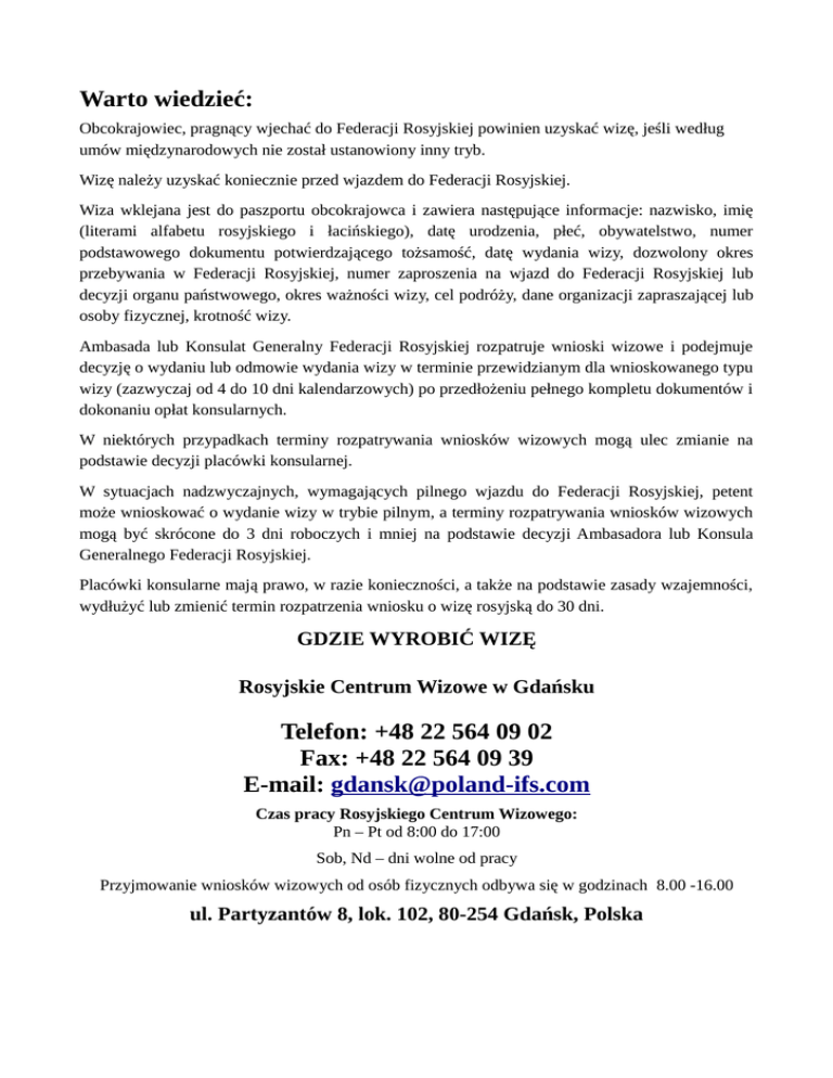 Warto wiedzieć: Obcokrajowiec, pragnący wjechać do Federacji Rosyjskiej powinien uzyskać wizę, jeśli według umów międzynarodowych nie został ustanowiony inny tryb. Wizę należy uzyskać koniecznie przed wjazdem do Federacji Rosyjskiej. Wiza wklejana jest do paszportu obcokrajowca i zawiera następujące informacje: nazwisko, imię (literami alfabetu rosyjskiego i łacińskiego), datę urodzenia, płeć, obywatelstwo, numer podstawowego dokumentu potwierdzającego tożsamość, datę wydania wizy, dozwolony okres przebywania w Federacji Rosyjskiej, numer zaproszenia na wjazd do Federacji Rosyjskiej lub decyzji organu państwowego, okres ważności wizy, cel podróży, dane organizacji zapraszającej lub osoby fizycznej, krotność wizy. Ambasada lub Konsulat Generalny Federacji Rosyjskiej rozpatruje wnioski wizowe i podejmuje decyzję o wydaniu lub odmowie wydania wizy w terminie przewidzianym dla wnioskowanego typu wizy (zazwyczaj od 4 do 10 dni kalendarzowych) po przedłożeniu pełnego kompletu dokumentów i dokonaniu opłat konsularnych. W niektórych przypadkach terminy rozpatrywania wniosków wizowych mogą ulec zmianie na podstawie decyzji placówki konsularnej. W sytuacjach nadzwyczajnych, wymagających pilnego wjazdu do Federacji Rosyjskiej, petent może wnioskować o wydanie wizy w trybie pilnym, a terminy rozpatrywania wniosków wizowych mogą być skrócone do 3 dni roboczych i mniej na podstawie decyzji Ambasadora lub Konsula Generalnego Federacji Rosyjskiej. Placówki konsularne mają prawo, w razie konieczności, a także na podstawie zasady wzajemności, wydłużyć lub zmienić termin rozpatrzenia wniosku o wizę rosyjską do 30 dni. GDZIE WYROBIĆ WIZĘ Rosyjskie Centrum Wizowe w Gdańsku Telefon: +48 22 564 09 02 Fax: +48 22 564 09 39 E-mail: [email protected] Czas pracy Rosyjskiego Centrum Wizowego: Pn – Pt od 8:00 do 17:00 Sob, Nd – dni wolne od pracy Przyjmowanie wniosków wizowych od osób fizycznych odbywa się w godzinach 8.00 -16.00 ul. Partyzantów 8, lok. 102, 80-254 Gdańsk, Polska WIZA MAŁY RUCH GRANICZNY Zezwolenie w ramach Małego ruchu granicznego (dalej MRG) może być wydane obywatelom Rzeczypospolitej Polskiej, obywatelom państw trzecich i bezpaństwowcom stale zamieszkującym w strefie przygranicznej przez okres nie krótszy niż 3 lata, którzy umotywują istnienie powodów do wielokrotnego przekraczania polsko-rosyjskiej granicy państwowej, w szczególności w celu podtrzymywania więzi rodzinnych, społecznych, kulturalnych, a także kontaktów ekonomicznych i innych, które według przepisów Państw Stron nie są uznawane za zatrudnienie lub działalność zarobkową. Zezwolenie uprawnia mieszkańca strefy przygranicznej Państwa jednej Strony do wjazdu i pobytu w strefie przygranicznej Państwa drugiej Strony każdorazowo do 30 (trzydziestu) dni, licząc od dnia wjazdu, jednakże łączny okres pobytu nie może przekraczać 90 (dziewięćdziesięciu) dni w okresie każdych 6 miesięcy liczonych od dnia pierwszego wjazdu. Pierwsze zezwolenie wydawane jest mieszkańcowi strefy przygranicznej na okres 2 lat, lecz nie dłuższy niż okres ważności paszportu. Kolejne zezwolenie wydawane jest na okres 5 lat, lecz nie dłuższy niż okres ważności paszportu, pod warunkiem, że osoba wnioskująca korzystała z poprzedniego zezwolenia zgodnie z Umową o zasadach Małego ruchu granicznego oraz przepisami dotyczącymi wjazdu i pobytu na terytorium Federacji Rosyjskiej. Uwaga! Zgodnie z Umową o Мałym ruchu granicznym zawartą między Rzeczpospolitą Polską a Federacją Rosyjską, posiadając wszystkie niezbędne dokumenty, o MRG mogą ubiegać się wyłącznie mieszkańcy niżej wymienioncyh powiatów: -województwa pomorskiego: powiat pucki, m. Gdynia, m. Sopot, m. Gdańsk, powiat gdański, powiat nowodworski, powiat malborski; -województwa warmińsko-mazurskiego: m. Elbląg, powiat elbląski, powiat braniewski, powiat lidzbarski, powiat bartoszycki, m. Olsztyn, powiat olsztyński, powiat kętrzyński, powiat mrągowski, powiat węgorzewski, powiat giżycki, powiat gołdapski, powiat olecki. W celu uzyskania zezwolenia na Mały ruch graniczny należy przedstawić: 1. Umotywowane podanie w dowolnej pisemnej formie o wydanie zezwolenia na MRG; 2. Ważny paszport; 3. Wypełniony wniosek, podpisany przez wnioskodawcę osobiście; (znajduje się w załączniku lub na stronie http://www.poland-ifs.com) 4. Kolorową fotografię 3,5 x 4,5 cm na jasnym tle, wyraźnie pokazującą twarz na wprost, bez okularów z przyciemnionymi szkłami i bez nakrycia głowy (oprócz obywateli, którzy na podstawie przynależności narodowościowej lub religijnej przedstawieni są na fotografii w paszporcie w nakryciu głowy); 5. Dowód osobisty z kserokopią (w przypadku, jeśli dowód osobisty był wymieniany w ciągu ostatnich 3 lat, dodatkowo oryginał zaświadczenia, potwierdzającego stałe zameldowanie na terenie przygranicznym w ciągu ostatnich trzech lat i dłużej). Dodatkowe dokumenty: - dla osób niepełnosprawnych - zaświadczenie o całkowitej niezdolności do pracy; - dla osób, które nie ukończyły 18 roku życia – dokument potwierdzający fakt zamieszkania jednego z rodziców w strefie przygranicznej przez okres nie krótszy niż 3 lata; dokument potwierdzający fakt zamieszkania dziecka wraz z rodzicem w strefie przygranicznej; kopia aktu urodzenia dziecka; pisemna zgoda obojga rodziców; kopia dowodu osobistego jednego z rodziców. Uwaga! Placówka konsularna ma prawo zażądać dodatkowych dokumentów, niezbędnych do uzyskania zezwolenia, zaprosić na rozmowę lub wydłużyć okres wyrabiania zezwolenia. Opłata konsularna i serwisowa może być dokonana bezpośrednio w Centrum Wizowym. Uwaga! Zgodnie z umową między Rządem Rzeczypospolitej Polskiej, a Rządem Federacji Rosyjskiej o zasadach Małego ruchu granicznego upoważnionymi do przyjmowania wniosków o wydanie zezwolenia oraz do ich wydawania są tylko Wydział Konsularny