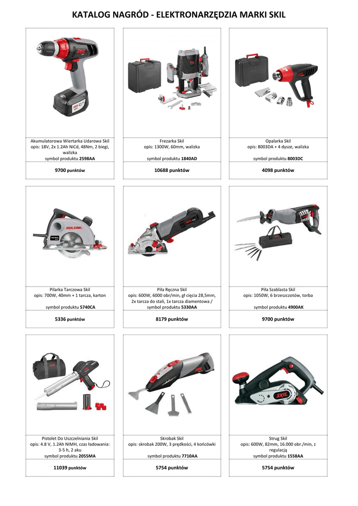 KATALOG NAGRÓD - ELEKTRONARZĘDZIA MARKI SKIL Akumulatorowa Wiertarka Udarowa Skil opis: 18V, 2x 1.2Ah NiCd, 48Nm, 2 biegi, walizka symbol produktu 2598AA Frezarka Skil opis: 1300W, 60mm, walizka Opalarka Skil opis: 8003DA + 4 dysze, walizka symbol produktu 1840AD symbol produktu 8003DC 9700 punktów 10688 punktów 4098 punktów Pilarka Tarczowa Skil opis: 700W, 40mm + 1 tarcza, karton Piła Szablasta Skil opis: 1050W, 6 brzeszczotów, torba symbol produktu 5740CA Piła Ręczna Skil opis: 600W, 6000 obr/min, gł cięcia 28,5mm, 2x tarcza do stali, 1x tarcza diamentowa / symbol produktu 5330AA 5336 punktów 8179 punktów 9700 punktów Pistolet Do Uszczelniania Skil opis: 4.8 V, 1.2Ah NIMH, czas ładowania: 3-5 h, 2 aku symbol produktu 2055MA Skrobak Skil opis: skrobak 200W, 3 prędkości, 4 końcówki symbol produktu 7710AA Strug Skil opis: 600W, 82mm, 16.000 obr./min, z regulacją symbol produktu 1558AA 11039 punktów 5754 punktów 5754 punktów symbol produktu 4900AK Szlifierka Delta Skil opis: 240W, elektronika Szlifierka Kątowa Skil opis: 600W, 115mm, bez tarczy, nowy design symbol produktu 7110AA symbol produktu 9030AA Szlifierka Mimośrodowa Skil opis: 280W, 125mm, worek na pył, waga 1.2kg, karton symbol produktu 7420AA 4098 punktów 3697 punktów 3680 punktów Szlifierka Oscylacyjna Skil opis: 200W, 3 papiery, worek na pył, karton symbol produktu 7348AA Szlifierka Taśmowa Skil opis: 650W, taśma 76x457 mm, dustbag symbol produktu 1210AA Szlifierka Wielofunkcyjna Skil opis: Skil OCTO, 100W, 3 papiery szlifierskie, karton symbol produktu 7207AA 3697 punktów 6573 punktów 3279 punktów Wiertarka Udarowa Skil opis: 550W, 16 el. osprzęt, walizka, nowy design symbol produktu 6280CK Wiertarko-Wkrętarka Skil opis: 12V, 1 aku 1.2Ah NiCD, uch. 10mm, 26Nm, 13 el. osp. symbol produktu 2395AC Wyrzynarka Skil opis: 400W, maks. gł, cięcia 65mm, 3 brzeszczoty, walizka symbol produktu 4281AD 4516 punktów 4098 punktów 4917 punktów