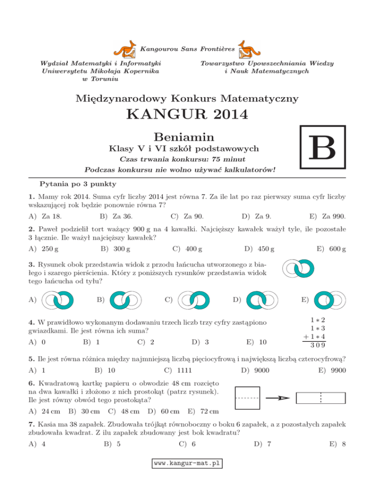 Kangourou Sans Frontières Wydział Matematyki i Informatyki Uniwersytetu Mikołaja Kopernika w Toruniu Towarzystwo Upowszechniania Wiedzy i Nauk Matematycznych Międzynarodowy Konkurs Matematyczny KANGUR 2014 Beniamin Klasy V i VI szkół podstawowych Czas trwania konkursu: 75 minut B Podczas konkursu nie wolno używać kalkulatorów! Pytania po 3 punkty 1. Mamy rok 2014. Suma cyfr liczby 2014 jest równa 7. Za ile lat po raz pierwszy suma cyfr liczby wskazującej rok będzie ponownie równa 7? A) Za 18. B) Za 36. C) Za 90. D) Za 9. E) Za 990. 2. Paweł podzielił tort ważący 900 g na 4 kawałki. Najcięższy kawałek ważył tyle, ile pozostałe 3 łącznie. Ile ważył najcięższy kawałek? A) 250 g B) 300 g C) 400 g D) 450 g E) 600 g 3. Rysunek obok przedstawia widok z przodu łańcucha utworzonego z białego i szarego pierścienia. Który z poniższych rysunków przedstawia widok tego łańcucha od tyłu? A) B) C) D) E) 4. W prawidłowo wykonanym dodawaniu trzech liczb trzy cyfry zastąpiono gwiazdkami. Ile jest równa ich suma? A) 0 B) 1 C) 2 D) 3 E) 10 1∗2 1∗3 +1∗4 309 5. Ile jest równa różnica między najmniejszą liczbą pięciocyfrową i największą liczbą czterocyfrową? A) 1 B) 10 C) 1111 D) 9000 E) 9900 6. Kwadratową kartkę papieru o obwodzie 48 cm rozcięto na dwa kawałki i złożono z nich prostokąt (patrz rysunek). Ile jest równy obwód tego prostokąta? A) 24 cm B) 30 cm C) 48 cm D) 60 cm E) 72 cm 7. Kasia ma 38 zapałek. Zbudowała trójkąt równoboczny o boku 6 zapałek, a z pozostałych zapałek zbudowała kwadrat. Z ilu zapałek zbudowany jest bok kwadratu? A) 4 B) 5 C) 6 www.kangur-mat.pl D) 7 E) 8 www.kangur-mat.pl 1 1 8. Ala miała 60 złotych. Za tej kwoty kupiła książkę, a za reszty kupiła kwiaty. Ile pieniędzy 4 3 ma Ala po tych zakupach? A) 15 zł B) 20 zł C) 25 zł D) 30 zł E) 35 zł 9. Witek brał udział w wyścigu kolarskim. Wyścig rozpoczął się dokładnie o 09:55 i składał się z 5 okrążeń toru. Pierwsze okrążenie Witek zakończył dokładnie o 10:26, drugie – dokładnie o 10:54, trzecie – dokładnie o 11:28, czwarte – dokładnie o 12:03 i ostatnie – dokładnie o 12:34. Które okrążenie Witek pokonał w najkrótszym czasie? A) Pierwsze. B) Drugie. C) Trzecie. D) Czwarte. E) Piąte. 10. Na talerzyku leżały cukierki. Najpierw Tomek zjadł połowę z nich i jeszcze 2 cukierki, a następnie Magda zjadła połowę reszty. Na talerzyku zostały 3 cukierki. Ile cukierków leżało na talerzyku na początku? A) 22 B) 20 C) 18 D) 16 E) 14 Pytania po 4 punkty 11. Którym z poniższych kwadracików można uzupełnić do kwadratu figurę pokazaną na rysunku, tak aby suma pól wszystkich części białych była równa sumie pól wszystkich części szarych? A) B) C) D) E) 12. Henryk i Jan wyruszyli z tego samego miejsca w Toruniu na przejażdżkę rowerową. Henryk pojechał 1 km na północ, następnie 2 km na zachód, potem 4 km na południe i na koniec 1 km na zachód. Jan natomiast pojechał 1 km na wschód, następnie 4 km na południe i na koniec 4 km na zachód. Które z poniższych zdań określa położenie miejsca, w którym zatrzymał się Henryk względem miejsca, w którym zatrzymał się Jan? A) 1 km na północny zachód. B) 1 km na północ. C) 1 km na zachód. D) 1 km na południe. E) Obaj zatrzymali się w tym samym miejscu. 13. Na letnim obozie 7 dzieci je lody codziennie, 9 dzieci je lody co drugi dzień, a reszta uczestników nie je lodów w ogóle. Wczoraj lody jadło 13 dzieci. Ile dzieci będzie jeść lody dzisiaj? A) 7 B) 8 C) 9 D) 10 E) Nie można tego ustalić. 14. Kangurki A, B, C, D i E siedzą wokół okrągłego stołu zgodnie z ruchem wskazówek zegara w takiej kolejności, w jakiej zostały wymienione. W momencie gdy zadzwonił dzwonek, każdy z kangurków oprócz jednego zamienił się miejscem z sąsiadem. Teraz kangurki siedzą zgodnie z ruchem wskazówek zegara w kolejności: A, E, B, D, C. Który z kangurków nie zmienił miejsca przy stole? A) A B) B C) C D) D E) E 15. W kawiarni znajduje się 16 stolików. Wśród nich są tylko stoliki 3-osobowe, 4-osobowe i 6-osobowe. Łącznie przy wszystkich stolikach mogą usiąść 72 osoby. Wiadomo, że przy stolikach 3-osobowych i 4-osobowych może usiąść łącznie 36 osób. Ile stolików 3-osobowych znajduje się w tej sali? A) 8 B) 7 C) 6 D) 5 E) 4 www.kangur-mat.pl 16. W pewnej liczbie trzycyfrowej iloczyn cyfr jest równy 135. Ile jest równa suma cyfr tej liczby? A) 14 B) 15 C) 16 D) 17 E) 18 17. Rysunek przedstawia sznur korali złożony z białych i czarnych koralików. Julia ma ściągnąć z niego 5 czarnych koralików, tak aby przy tym ściągnąć jak najmniej białych koralików. Julia może ściągać ze sznura tylko po jednym koraliku, przy czym za każdym razem może wybrać koniec sznura, z którego ściągnie koralik. Jaka jest najmniejsza liczba białych koralików, które musi ściągnąć? A) 2 B) 3 C) 4 18. Z czterech spośród pięciu pokazanych obok kartoników można ułożyć kwadrat. Który kartonik nie zostanie wykorzystany? A) A B) B A D) 5 C B C) C E) 6 E D D) D E) E 19. Punkty A, B, C, D, E i F leżą na prostej w takiej właśnie kolejności. Wiadomo, że |AF | = 35, |AC| = 12, |BD| = 11, |CE| = 12 i |DF | = 16. Ile jest równa długość odcinka BE? A) 13 B) 14 C) 15 D) 16 E) 17 20. Magda dzieli na grupy zebrane kasztany. Gdy dzieliła je na grupy po 3 kasztany, to zostały jej 2. Gdy dzieliła je na grupy po 5 kasztanów, to także pozostały jej 2. Ile co najmniej kasztanów musi dołożyć do swego zbioru, aby mogła je wszystkie rozłożyć zarówno na grupy po 3, jak i na grupy po 5 sztuk? A) 3 B) 1 C) 4 D) 10 E) 13 Pytania po 5 punktów 21. Piosenka A trwa 3 minuty, piosenka B – 2 minuty, piosenka C – 2 minuty, piosenka D – 1 minutę i 30 sekund i piosenka E – 4 minuty. Te 5 piosenek w kolejności: A, B, C, D, E nagrano na płytę bez przerw, przy czym płyta automatycznie ponownie się 