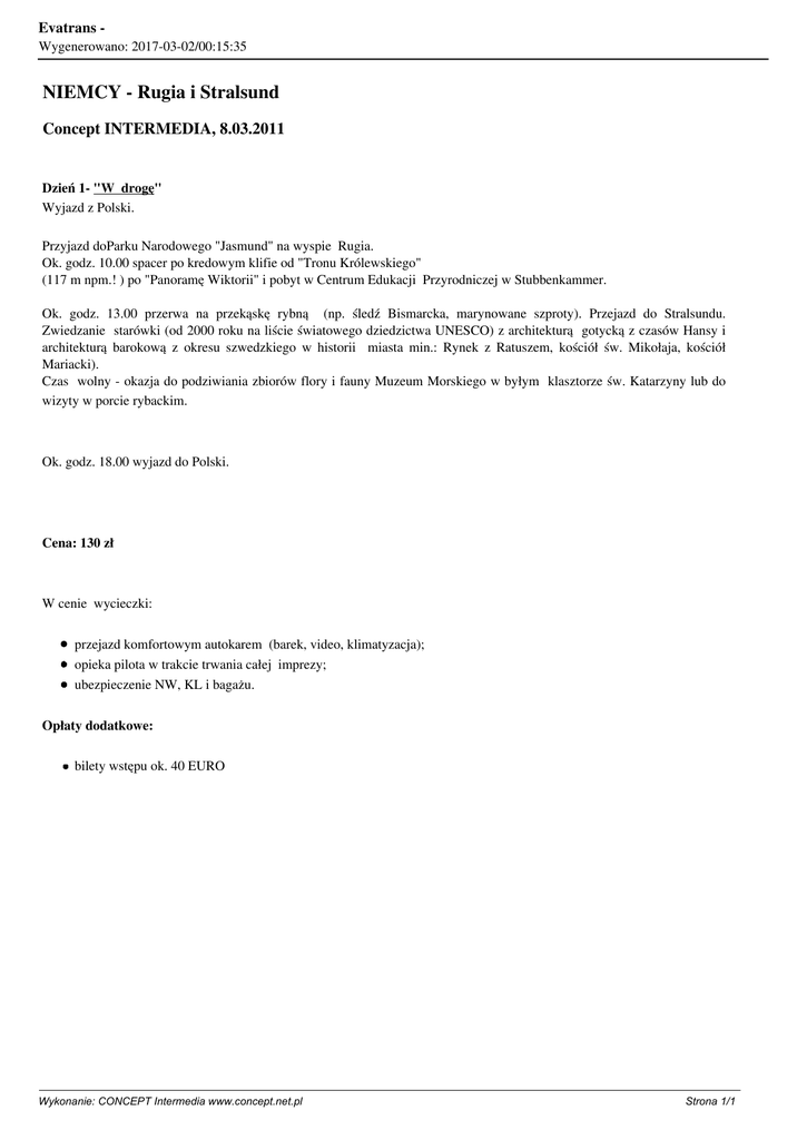 Evatrans Wygenerowano: 2017-03-02/00:15:35 NIEMCY - Rugia i Stralsund Concept INTERMEDIA, 8.03.2011 Dzień 1- "W drogę" Wyjazd z Polski. Przyjazd doParku Narodowego "Jasmund" na wyspie Rugia. Ok. godz. 10.00 spacer po kredowym klifie od "Tronu Królewskiego" (117 m npm.! ) po "Panoramę Wiktorii" i pobyt w Centrum Edukacji Przyrodniczej w Stubbenkammer. Ok. godz. 13.00 przerwa na przekąskę rybną (np. śledź Bismarcka, marynowane szproty). Przejazd do Stralsundu. Zwiedzanie starówki (od 2000 roku na liście światowego dziedzictwa UNESCO) z architekturą gotycką z czasów Hansy i architekturą barokową z okresu szwedzkiego w historii miasta min.: Rynek z Ratuszem, kościół św. Mikołaja, kościół Mariacki). Czas wolny - okazja do podziwiania zbiorów flory i fauny Muzeum Morskiego w byłym klasztorze św. Katarzyny lub do wizyty w porcie rybackim. Ok. godz. 18.00 wyjazd do Polski. Cena: 130 zł W cenie wycieczki: przejazd komfortowym autokarem (barek, video, klimatyzacja); opieka pilota w trakcie trwania całej imprezy; ubezpieczenie NW, KL i bagażu. Opłaty dodatkowe: bilety wstępu ok. 40 EURO Wykonanie: CONCEPT Intermedia www.concept.net.pl Strona 1/1