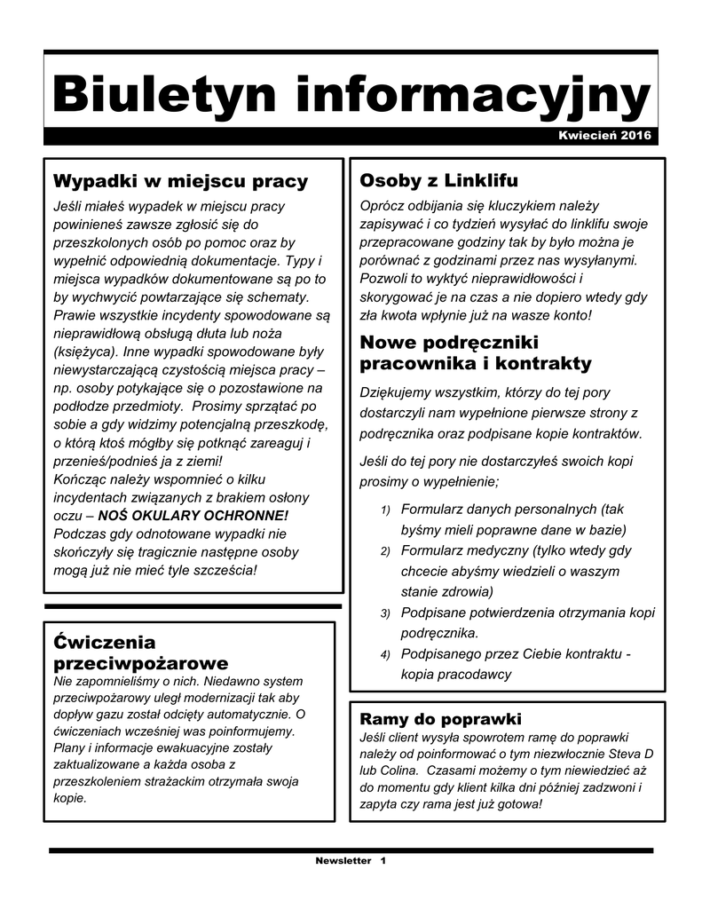 Biuletyn informacyjny Kwiecień 2016 Wypadki w miejscu pracy Osoby z Linklifu Jeśli miałeś wypadek w miejscu pracy powinieneś zawsze zgłosić się do przeszkolonych osób po pomoc oraz by wypełnić odpowiednią dokumentacje. Typy i miejsca wypadków dokumentowane są po to by wychwycić powtarzające się schematy. Prawie wszystkie incydenty spowodowane są nieprawidłową obsługą dłuta lub noża (księżyca). Inne wypadki spowodowane były niewystarczającą czystością miejsca pracy – np. osoby potykające się o pozostawione na podłodze przedmioty. Prosimy sprzątać po sobie a gdy widzimy potencjalną przeszkodę, o którą ktoś mógłby się potknąć zareaguj i przenieś/podnieś ja z ziemi! Kończąc należy wspomnieć o kilku incydentach związanych z brakiem osłony oczu – NOŚ OKULARY OCHRONNE! Podczas gdy odnotowane wypadki nie skończyły się tragicznie następne osoby mogą już nie mieć tyle szcześcia! Oprócz odbijania się kluczykiem należy zapisywać i co tydzień wysyłać do linklifu swoje przepracowane godziny tak by było można je porównać z godzinami przez nas wysyłanymi. Pozwoli to wyktyć nieprawidłowości i skorygować je na czas a nie dopiero wtedy gdy zła kwota wpłynie już na wasze konto! Ćwiczenia przeciwpożarowe Nie zapomnieliśmy o nich. Niedawno system przeciwpożarowy uległ modernizacji tak aby dopływ gazu został odcięty automatycznie. O ćwiczeniach wcześniej was poinformujemy. Plany i informacje ewakuacyjne zostały zaktualizowane a każda osoba z przeszkoleniem strażackim otrzymała swoja kopie. Nowe podręczniki pracownika i kontrakty Dziękujemy wszystkim, którzy do tej pory dostarczyli nam wypełnione pierwsze strony z podręcznika oraz podpisane kopie kontraktów. Jeśli do tej pory nie dostarczyłeś swoich kopi prosimy o wypełnienie; Formularz danych personalnych (tak byśmy mieli poprawne dane w bazie) 2) Formularz medyczny (tylko wtedy gdy chcecie abyśmy wiedzieli o waszym 1) stanie zdrowia) 3) Podpisane potwierdzenia otrzymania kopi podręcznika. 4) Podpisanego przez Ciebie kontraktu kopia pracodawcy Ramy do poprawki Jeśli client wysyła spowrotem ramę do poprawki należy od poinformować o tym niezwłocznie Steva D lub Colina. Czasami możemy o tym niewiedzieć aż do momentu gdy klient kilka dni później zadzwoni i zapyta czy rama jest już gotowa! Newsletter 1 Osobiste wyposażenie ochronne Nidopałki papierosów Wyposażenie to jest przyznawane każdemu z pracowników. Dodatkowe wyposażenie trzymane jest w magazynie, jeśli czegoś potrzebujesz poproś magazyniera Harrego. Zatyczki do uszu (Przy każdym wejściu do fabryki) pojedyncze lub w parach na pasku. Prosimy przestać rzucać je na ziemie! Używajcie popielniczek. Dni wolne od pracy 2016 Poniedziałek 2 maja – 1-szy majowy długi weekend Poniedziałek 30 maja – 2-gi majowy długi weekend Słuchawki ochronne (zapytaj o nie swojego kierownika działu jeśli chciałbyś zacząć ich używać lub potrzebujesz wymiany uszkodzonej pary) Poniedziałek 29 sierpnia – sierpniowy długi weekend Okulary ochronne – dostępne również jako personalne okulary ochronne z korekcją wzroku. Jeśli potrzebujesz takowych prosimy o dostarczenie nam swojej recepty. Narodzenia Poniedziałek 26 grudnia – 2-gi dzień świat Bożego Wtorek 27 grudnia – zastępstwo w ramach Bożego Narodzenia wypadającego w weekend Maseczki przeciwpyłowe Zamknięcie fabryki na święta 2016 Krem ochronny Zamknięcie fabryk to piątek 23 grudnia 2016 a powrót do pracy to wtorek 3 stycznia 2017. Obuwie ochronne Rękawice ochronne Trzy dni urlopu z roku 2016 oraz jeden dzień z roku 2017 będą zarezerwowane na zamknięcie fabryki w okresie świąt Bożego Narodzenia. Prosimy o sprawdzanie wyposażenia ochronnego Dane kontaktowe Kamizelki/kurtki odblaskowe i o jego wymianę w przypadku uszkodzenia. Główny numer firmy 01296 668899 Osoby pierwszej pomocy Steve Dennaford 07967 578241 Są dwie nowe osoby mogące udzielać pierwszej pomocy. Upewnij się, że znasz wszystkie osoby pierwszej pomocy bo pewnego dnia może będziesz szukać pomocy. Colin Nappin 07980 971758 Darren Hackett 07795 374469 Gerry Hill 07967 578242 W razie wypadku osoby przeszkolene udzielą Ci pierwszej pomocy oraz wypełnią odpowiednie formularze wziązane z dokumentację wypadku. Alex Woodfine Pawel Pietrzyk Krzysztof Kesik Kamil Wardega Dariusz Rybicki Arkadiusz Cicharski Mandy Tyas Michal Wnuk Głowny email [email protected] Strefa informacyjna pracowników Garrard Windows Na stronie www.garrardwindows.co.uk mamy strefe informacyjna dla pracowników – hasło to windows123. Znajdziecie tam kopie podręcznika pracownika oraz wszystkie użyteczne daty. Jeśli uważasz że powinny znaleźć się tam inne użyteczne informacje poinformuj o tym Natashe. Dzięki. Garry Collard ocuments Natasha or Angie [email protected] Newsletter 2 When you start work you are given the staff handbook Twoje zdanie w sprawie Prosimy użyć tej strony, aby poinformować nas o np.: Zepsutych lub uszkodzonych maszynach Potrzebnym osobistym wyposażeniu ochronnym Jakichkolwiek zagrożeniach, których nie jesteśmy świadomi Newsletter 3