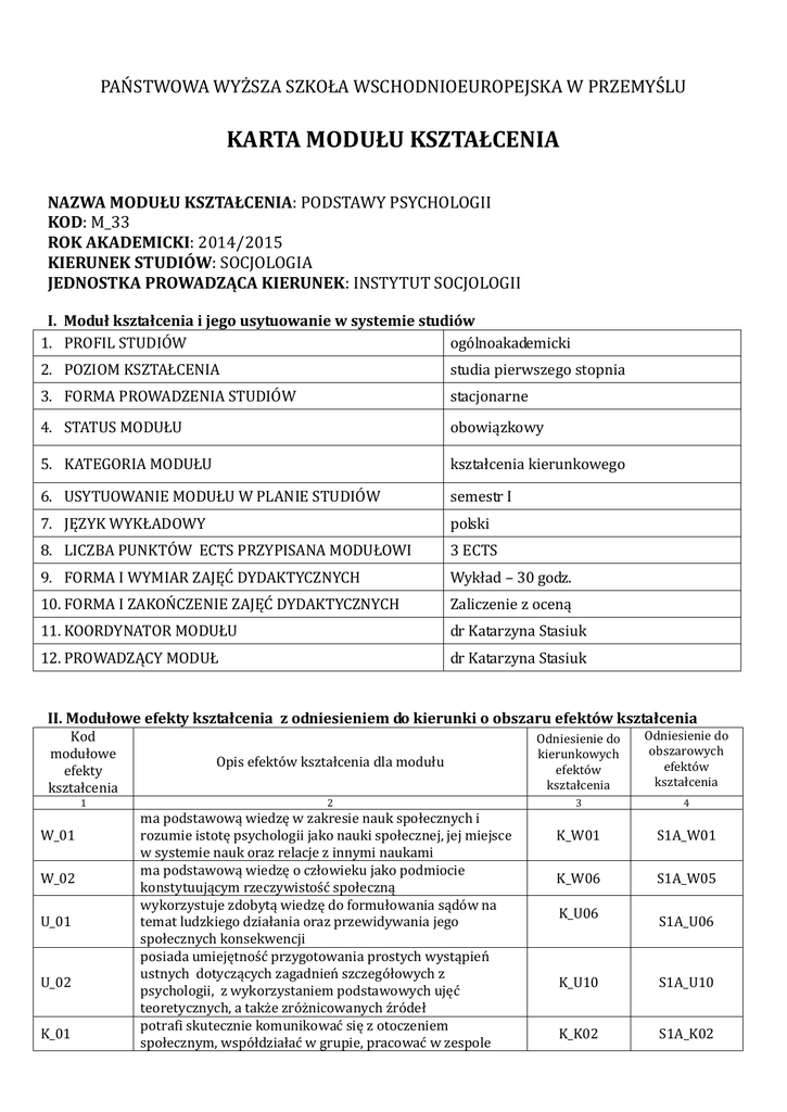 PAŃSTWOWA WYŻSZA SZKOŁA WSCHODNIOEUROPEJSKA W PRZEMYŚLU KARTA MODUŁU KSZTAŁCENIA NAZWA MODUŁU KSZTAŁCENIA: PODSTAWY PSYCHOLOGII KOD: M_33 ROK AKADEMICKI: 2014/2015 KIERUNEK STUDIÓW: SOCJOLOGIA JEDNOSTKA PROWADZĄCA KIERUNEK: INSTYTUT SOCJOLOGII I. Moduł kształcenia i jego usytuowanie w systemie studiów 1. PROFIL STUDIÓW ogólnoakademicki 2. POZIOM KSZTAŁCENIA studia pierwszego stopnia 3. FORMA PROWADZENIA STUDIÓW stacjonarne 4. STATUS MODUŁU obowiązkowy 5. KATEGORIA MODUŁU kształcenia kierunkowego 6. USYTUOWANIE MODUŁU W PLANIE STUDIÓW semestr I 7. JĘZYK WYKŁADOWY polski 8. LICZBA PUNKTÓW ECTS PRZYPISANA MODUŁOWI 3 ECTS 9. FORMA I WYMIAR ZAJĘĆ DYDAKTYCZNYCH Wykład – 30 godz. 10. FORMA I ZAKOŃCZENIE ZAJĘĆ DYDAKTYCZNYCH Zaliczenie z oceną 11. KOORDYNATOR MODUŁU dr Katarzyna Stasiuk 12. PROWADZĄCY MODUŁ dr Katarzyna Stasiuk II. Modułowe efekty kształcenia z odniesieniem do kierunki o obszaru efektów kształcenia Kod modułowe efekty kształcenia 1 W_01 W_02 U_01 U_02 K_01 Opis efektów kształcenia dla modułu Odniesienie do kierunkowych efektów kształcenia Odniesienie do obszarowych efektów kształcenia 2 3 4 K_W01 S1A_W01 K_W06 S1A_W05 ma podstawową wiedzę w zakresie nauk społecznych i rozumie istotę psychologii jako nauki społecznej, jej miejsce w systemie nauk oraz relacje z innymi naukami ma podstawową wiedzę o człowieku jako podmiocie konstytuującym rzeczywistość społeczną wykorzystuje zdobytą wiedzę do formułowania sądów na temat ludzkiego działania oraz przewidywania jego społecznych konsekwencji posiada umiejętność przygotowania prostych wystąpień ustnych dotyczących zagadnień szczegółowych z psychologii, z wykorzystaniem podstawowych ujęć teoretycznych, a także zróżnicowanych źródeł potrafi skutecznie komunikować się z otoczeniem społecznym, współdziałać w grupie, pracować w zespole K_U06 S1A_U06 K_U10 S1A_U10 K_K02 S1A_K02 zadaniowym przyjmując w nich różne role, III. Treści kształcenia – oddzielnie dla każdej formy zajęć dydaktycznych (W – wykład; C - ćwiczenia; K – konwersatorium; L - laboratorium; PR – projekt, PKZ - praktyka zawodowa; WT – Warsztat) Kod form zajęć dydaktyczny ch 1 W1 W1 W2 W4 W5 W6 W7 W8 Szczegółowy opis treści realizowanych w ramach zajęć wg form zajęć dydaktycznych Liczba godzin 2 3 konwersatorium Czym zajmuje się psychologia? - cele psychologii - historia psychologii - miejsca pracy psychologów Kierunki w psychologii - psychoanaliza - behawioryzm - psychologia humanistyczna Spostrzeganie - etapy spostrzegania - uwaga - złudzenia w spostrzeganiu Pamięć - magazyny pamięci - zaburzenia pamięci - jak poprawić pamięć - mnemotechniki Uczenie się - warunkowanie klasyczne - warunkowanie instrumentalne - modelowanie - wiedza obiektywna – wiedza subiektywna - kalibracja wiedzy Motywacja - perspektywy teoretyczne - piramida potrzeb Maslowa - motywacje o podłożu społecznym - motywacje o podłożu poznawczym - motywacje a obraz JA - nieświadomość motywów własnego działania Emocje i stres - biologiczne podstawy emocji - teorie emocji - emocje podstawowe - wpływ emocji na funkcjonowanie człowieka - czym jest stres i jak sobie z nim radzić Psychopatologia - zaburzenia psychiczne a norma - zaburzenia osobowości - zaburzenia lękowe - zaburzenia dysocjacyjne - zaburzenia emocjonalne - schizofrenia 2 2 4 4 4 4 4 4 Kolokwium zaliczeniowe Razem 2 30 IV. Literatura obowiązująca do zaliczenia modułu 1. Mietzel G. (1999). Wprowadzenie do psychologii. Gdańsk: Gdańskie Wydawnictwo Psychologiczne 2. Zimbardo, Ph., Ruch, F. (1994). Psychologia i życie. Warszawa: Wydawnictwo Naukowe PWN. 3. Eysenck, H., Eysenck, M. (2003) Podpatrywanie umysłu. Gdańsk: Gdańskie Wydawnictwo Psychologiczne. 4. Kofta M., Szustrowa T. (1991) Złudzenia, które pozwalają żyć. Szkice z psychologii społecznej. Warszawa PWN. 5. Hock, R.R. (2002/2003). 40 prac badawczych, które zmieniły oblicze psychologii. Gdańsk: Gdańskie Wydawnictwo Psychologiczne.