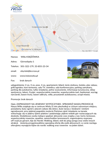 Nazwa: Willa KSIĘŻÓWKA Adres: Górnośląska 1 Telefon: 501-322-179, 33-855-23-34 email: [email protected] www: www.ksiezowka.pl Fax: brak danych udogodnienia: 2-os, 3-os, pow. 4-os, apartament, bilard, tenis stołowy, boisko, plac zabaw, grill/ognisko, kort tenisowy, sala TV, świetlica, sala konferencyjna, parking zamykany, parking dla autokarów, tylko śniadania, pełne wyżywienie, informacja turystyczna, sklep spożywczy, lekarz, fryzjer, wypożyczalnia rowerów, wypożyczalnia nart, bankomat, wyciąg narciarski, basen kryty, basen odkryty, willa, przystanek autobusowy, urząd miasta. Promocje: brak danych Opis: ZAPRASZAMY NA JESIENNY WYPOCZYNEK- SPRAWDŹ NASZĄ PROMOCJĘ Nasza Willa znajduje się w centrum Wisły (5 min piechotką) w cichym ustronnym miejscu, posiadamy duży ogród z placem zabaw dla dzieci, duże tarasy z leżakami i stołami ogrodowymi, przy pięknej pogodzie możecie Państwo zjeść śniadanie na tarasie wsłuchując się w piękny śpiew ptaków i podziwiając piękne widoki gór roztaczających się dookoła. Dodatkowo osoby lubiące spędzać aktywnie czas znajdą u nas: korty tenisowe, wypożyczalnię rowerów, quadów, samochodów terenowych, organizujemy wyprawy off-road po górach, kije do Nordic Walking, bilard, stół do ping-ponga oraz wiele innych atrakcji. Jesienią przygotowaliśmy specjalną ofertę dla osób aktywnych: w cenie noclegu oferujemy wynajęcie kijów do nordic walking oraz rowerów na jeden dzień. Obniżamy również ceny noclegów, koszt noclegu ze sniadaniem wynosi 50 zł/os (przy pobytach powyżej dwóch nocy) Zadzwoń już dziś i dowiedź się więcej. Willa „Księżówka-Wiślanka” jest kameralnym Domem Gościnnym dla osób poszukujących odpoczynkiu w niezwykłym klimacie przedwojennych wnętrz. Dysponujemy pokojami 2, 3, 4 osobowymi oraz apartamentami dwu i trzypokojowymi do sześciu osób. Wszystkie pokoje są z łazienkami a większość z balkonami z widokiem na ogród i zagajnik. Oferujemy również pyszne wyżywienie z domowej kuchni. Obiekt zbudowany w 1934 roku, położony nad rzeką, na zboczu Partecznika w ŚCISŁYM CENTRUM Wisły. Ogromna przestrzeń leśnego ogrodu wokół willi, piękne widoki oraz unikalne usytuowanie w centrum miejscowości jest dużym atutem naszego ośrodka. Do dyspozycji gości są: pokoje 2, 3, 4-osobowe oraz apartamenty dwuosobowe, wyżywienie, całodzienny dostęp do bufetu z kawą i herbatą w cenie noclegów, dostęp do internetu, stół do ping-ponga, bilard, duży salon, plac zabaw, boisko do piłki nożnej i siatkówki, stoliki, krzesła ogrodowe, bezpłatny parking, przestrzeń ogrodowa wokół willi, wypożyczalnia sprzętu narciarskiego i snowboardowego, wypożyczalnia rowerów, możliwość umówienia lekcji z instruktorem narciarskim. Atuty położenia willi to: - bliskość wyciagu "Partecznik" (300m) - bezpieczny plac zabaw dla dzieci z piaskownicą i zabawkami - bliskość rynku i amfiteatru (200m) - sąsiadujemy bezpośrednio z basenami (otwartymi i krytym) w ośrodku Start - jseteśmy świetną bazą wypadową na wycieczki górskie i autokarowe - blisko do "Hotelu Gołębiewski", w którym udostępniony jest zespół basenów, zjeżdżalni, saun, jacuuzi z wodami leczniczymi itd. (7 minut pieszo, cena: 35zł za 1,5hz, do dyspozycji ręcznik) - graniczymy z brzegiem rzeki Wisły, po zejściu schodkami wzdłuż ogrodzenia posesji można przejść bezpośrednio do centrum miasta - w okolicy ciekawe ścieżki spacerowe i szlaki górskie - u nas możesz pić wodę prosto z kranu- jest pyszna i zdrowa Zapraszamy również grupy z pełnym wyżywieniem. W budynku obowiązuje całkowity zakaz palenia. Nie ma możliwości korzystania z kuchni(lodówki).