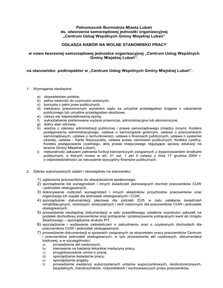 Pełnomocnik Burmistrza Miasta Lubań ds. utworzenia samorządowej jednostki organizacyjnej „Centrum Usług Wspólnych Gminy Miejskiej Lubań” OGŁASZA NABÓR NA WOLNE STANOWISKO PRACY w nowo tworzonej samorządowej jednostce organizacyjnej „Centrum Usług Wspólnych Gminy Miejskiej Lubań”. na stanowisko: podinspektor w „Centrum Usług Wspólnych Gminy Miejskiej Lubań”. 1. Wymagania niezbędne: a) b) c) d) obywatelstwo polskie, pełna zdolność do czynności prawnych, korzysta z pełni praw publicznych, niekarany prawomocnym wyrokiem sądu za umyślne przestępstwo ścigane z oskarżenia publicznego lub umyślne przestępstwo skarbowe, e) cieszy się nieposzlakowaną opinią, f) wykształcenie preferowane wyższe prawnicze, administracyjne lub ekonomiczne, g) dobry stan zdrowia, h) wiedza z zakresu administracji publicznej i prawa samorządowego (między innymi: Kodeks postępowania administracyjnego, ustawa o samorządzie gminnym, ustawa o pracownikach samorządowych, ustawa o rachunkowości, ustawa o finansach publicznych, ustawa o systemie oświaty, ustawa - Karta Nauczyciela, ustawa prawo zamówień publicznych, Kodeks cywilny, Kodeks postępowania cywilnego, akty prawa miejscowego regulujące sprawy edukacji na terenie Gminy Miejskiej Lubań), i) niekaralność zakazem pełnienia funkcji kierowniczych związanych z dysponowaniem środkami publicznymi, o których mowa w art. 31 ust. 1 pkt 4 ustawy z dnia 17 grudnia 2004 r. o odpowiedzialności za naruszenie dyscypliny finansów publicznych. 2. Zakres wykonywanych zadań i obowiązków na stanowisku: 1) zgłaszanie pracowników do ubezpieczenia społecznego, 2) sporządzanie list wynagrodzeń i innych świadczeń stanowiących dochód pracowników CUW i jednostek obsługiwanych, 3) dokonywanie rozliczeń wynagrodzeń i innych składników przychodów pracowników oraz organizacja ich wypłat dla jednostek obsługiwanych i CUW, 4) sporządzanie dokumentacji płacowej dla potrzeb ZUS w celu ustalania świadczeń rehabilitacyjnych, rentowych, emerytalnych i rent rodzinnych dla pracowników CUW i jednostek obsługiwanych, 5) prowadzenie niezbędnej dokumentacji w celu prawidłowego ustalenia wysokości zaliczek na podatek dochodowy pracowników oraz potrącanie i przekazywanie potrącanych kwot do Urzędu Skarbowego – sporządzanie druków PIT, 6) sporządzanie i wydawanie zaświadczeń o zatrudnieniu oraz o uzyskanych dochodach dla pracowników CUW i jednostek obsługiwanych, 7) prowadzenie dokumentacji w sprawach związanych ze stosunkiem pracy pracowników Centrum i pracowników jednostek obsługiwanych, w tym prowadzenie akt osobowych, dokumentacji kadrowej, a w szczególności: a) prowadzenie akt osobowych, b) kierowanie na badania lekarskie medycyny pracy, c) przygotowywanie umów o pracę, d) sporządzanie świadectw pracy, e) sporządzanie angaży, f) prowadzenie ewidencji wykorzystanych urlopów wypoczynkowych, okolicznościowych, bezpłatnych, macierzyńskich, rodzicielskich i wychowawczych przez pracowników, przygotowywanie stosownych dokumentów w sprawie nagród, w tym nagród jubileuszowych, h) prowadzenie spraw dotyczących rent i emerytur pracowników, świadczeń rehabilitacyjnych oraz urlopów dla poratowanie zdrowia, i) wystawianie i ewidencjonowanie delegacji służbowych pracowników, j) przestrzeganie terminów i kierowanie pracowników na szkolenia w zakresie bezpieczeństwa i higieny pracy oraz p.poż., 8) prowadzenie kancelarii Centrum Usług Wspólnych Gminy Miejskiej Lubań, w tym obsługa poczty przychodzącej i wychodzącej, 9) Obsługa strony internetowej BIP CUW, 10) koordynowanie spraw prawno-organizacyjnych, w szczególności w powiązaniu z arkuszami organizacyjnymi jednostek obsługiwanych 11) opracowywanie rocznych i wieloletnich planów rzeczowo finansowych w zakresie inwestycji, remontów i modernizacji oraz zakupu środków trwałych, 12) prowadzenie ewidencji i rozliczanie druków ścisłego zarachowania, 13) prowadzenie ksiąg inwentarzowych wyposażenia CUW ujętego w ewidencji ilościowej, a w szczególności: a) prowadzenie ewidencji, nanoszenie odpowiedniej numeracji inwentarzowej na wyposażeniu, b) prowadzenie kartotek osobistych pracowników przekazanego sprzętu, narzędzi i wyposażenia, c) przygotowywanie protokołów zdawczo-odbiorczych w przypadku zatrudnienia nowego pracownika i przekazania mu sprzętu, narzędzi i wyposażenia oraz w przypadku zwolnienia lub przeniesienia pracownika w celu rozliczenia z posiadanego przez pracownika sprzętu, narzędzi i wyposażenia, 14) zaopatrywanie w środki materiałowo-techniczne na cele administracyjne CUW, 15) prowadzenie spraw dot. zamawiania, ewidencji i likwidacji pieczęci urzędowych, 16) prowadzenie rejestrów: pełnomocnictw, upoważnień, umów cywilno-prawnych oraz legitymacji służbowych, 17) przygotowanie danych oraz prowadzenie spraw związanych z ubezpieczeniem majątkowym CUW oraz jednostek obsługiwanych, 18) organizowanie wspólnych dostaw usług poprzez przygotowywanie i przeprowadzenie postępowań w sprawie udzielenia zamówienia publicznego po przeprowadzonym postępowaniu, możliwość zawierania umów ramowych, w tym w szczególności dotyczących zakupu paliwa, energii, gazu, ubezpieczeń i napraw oraz innych związanych z bieżącą działalnością CUW i jednostek obsługiwanych, 19) przygotowywanie i przeprowadzanie postępowań o udzielenie zamówień publicznych w zakresie działania CUW, 20) realizacja zadań wynikających z ustawy Prawo zamówień publicznych, w tym przede wszystkim prowadzenie procedur przetargowych oraz prowadzenie rejestru zamówień publicznych, 21) przygotowywanie wniosków do Ministerstwa Edukacji Narodowej dotyczących pozyskania środków finansowych dla jednostek obsługiwanych. 22) czynny udział w prowadzonej w CUW samoocenie kontroli zarządczej, identyfikacji czynników ryzyka na zajmowanym stanowisku pracy, 23) wykonywanie innych zadań należących do właściwośc