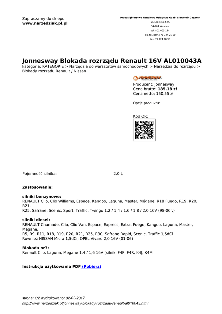 Zapraszamy do sklepu www.narzedziak.pl.pl Przedsiębiorstwo Handlowo Usługowe Gaabi Sławomir Gagatek ul. Legnicka 52A 54-204 Wrocław tel. 801 003 154 dla tel. kom.: 71 724 25 00 fax: 71 724 20 96 Jonnesway Blokada rozrządu Renault 16V AL010043A kategoria: KATEGORIE > Narzędzia do warsztatów samochodowych > Narzędzia do rozrządu > Blokady rozrządu Renault / Nissan Producent: Jonnesway Cena brutto: 185,18 zł Cena netto: 150,55 zł Opcje produktu: Kod QR: Pojemność silnika: 2.0 L Zastosowanie: silniki benzynowe: RENAULT Clio, Clio Williams, Espace, Kangoo, Laguna, Master, Mégane, R18 Fuego, R19, R20, R21, R25, Safrane, Scenic, Sport, Traffic, Twingo 1,2 / 1,4 / 1,6 / 1,8 / 2,0 16V (98-06r.) silniki diesel: RENAULT Chamade, Clio, Clio Van, Espace, Express, Extra, Fuego, Kangoo, Laguna, Master, Mégane, R5, R9, R11, R18, R19, R20, R21, R25, R30, Safrane Rapid, Scenic, Traffic 1,5dCi Również NISSAN Micra 1,5dCi; OPEL Vivaro 2,0 16V (01-06) Blokada nr3: Renault Clio, Laguna, Megane 1,4 / 1,6 16V (silniki F4P, F4R, K4J, K4M Instrukcja użytkowania PDF (Pobierz) strona: 1/2 wydrukowano: 02-03-2017 http://www.narzedziak.pl/jonnesway-blokady-rozrzadu-renault-al010043.html