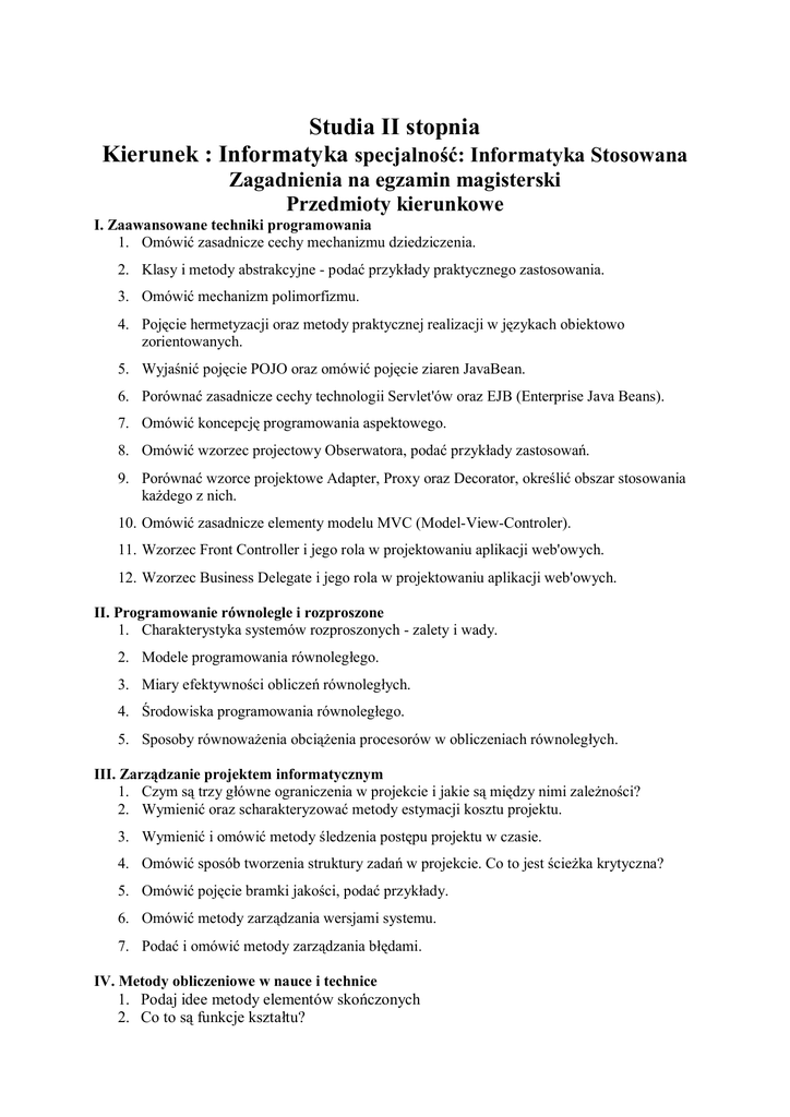 Studia II stopnia Kierunek : Informatyka specjalność: Informatyka Stosowana Zagadnienia na egzamin magisterski Przedmioty kierunkowe I. Zaawansowane techniki programowania 1. Omówić zasadnicze cechy mechanizmu dziedziczenia. 2. Klasy i metody abstrakcyjne - podać przykłady praktycznego zastosowania. 3. Omówić mechanizm polimorfizmu. 4. Pojęcie hermetyzacji oraz metody praktycznej realizacji w językach obiektowo zorientowanych. 5. Wyjaśnić pojęcie POJO oraz omówić pojęcie ziaren JavaBean. 6. Porównać zasadnicze cechy technologii Servlet'ów oraz EJB (Enterprise Java Beans). 7. Omówić koncepcję programowania aspektowego. 8. Omówić wzorzec projectowy Obserwatora, podać przykłady zastosowań. 9. Porównać wzorce projektowe Adapter, Proxy oraz Decorator, określić obszar stosowania każdego z nich. 10. Omówić zasadnicze elementy modelu MVC (Model-View-Controler). 11. Wzorzec Front Controller i jego rola w projektowaniu aplikacji web'owych. 12. Wzorzec Business Delegate i jego rola w projektowaniu aplikacji web'owych. II. Programowanie równolegle i rozproszone 1. Charakterystyka systemów rozproszonych - zalety i wady. 2. Modele programowania równoległego. 3. Miary efektywności obliczeń równoległych. 4. Środowiska programowania równoległego. 5. Sposoby równoważenia obciążenia procesorów w obliczeniach równoległych. III. Zarządzanie projektem informatycznym 1. Czym są trzy główne ograniczenia w projekcie i jakie są między nimi zależności? 2. Wymienić oraz scharakteryzować metody estymacji kosztu projektu. 3. Wymienić i omówić metody śledzenia postępu projektu w czasie. 4. Omówić sposób tworzenia struktury zadań w projekcie. Co to jest ścieżka krytyczna? 5. Omówić pojęcie bramki jakości, podać przykłady. 6. Omówić metody zarządzania wersjami systemu. 7. Podać i omówić metody zarządzania błędami. IV. Metody obliczeniowe w nauce i technice 1. Podaj idee metody elementów skończonych 2. Co to są funkcje kształtu? 3. Co to jest sformułowanie wariancyjne? 4. Co to jest macierz sztywności? V. Modelowanie przestrzenne 1. Omówić reprezentacje brył trójwymiarowych. Które z nich można zaliczyć do reprezentacji z podziałem przestrzennym? 2. Omówić struktury danych w reprezentacjach siatek wielokątowych. Jakie warunki muszą spełniać siatki wielokątowe by reprezentowały bryły? 3. Omówić różnice pomiędzy reprezentacjami krzywych Hermitte’a i Bezier’a. Jak tworzone są krzywe b-sklejane z wielu pojedynczych segmentów Bezier’a? 4. Przedstawić zagadnienie ciągłości geometrycznej krzywych i powierzchni. 5. Przedstawić znaczenie współrzędnych jednorodnych w przekształceniach trójwymiarowych. VI. Modelowanie zagadnień technicznych 1. Na czym polega blokowa metoda Choleskiego rozwiązywania układów równań liniowych algebraicznych z macierzą gęstą symetryczną? Wskutek czego udaje się osiągnąć istotne podniesienie wydajności w stosunku do klasycznej metody Choleskiego? 2. Po co jest wykonane uporządkowanie równań liniowych algebraicznych z macierzą rzadką? Jakie podstawowe metody uporządkowania istnieją? Na czym polega twierdzenie D. J. Rose, które służy podstawą dla faktoryzacji symbolicznej? 3. Na czym polega metoda wielofrontalna algebraiczna, jakie są jej podstawy? Jak traktuje się drzewo eliminacji? Czym jest drzewo superwęzłowe? Na jakiej podstawie i po co łączymy równania w grupy? 4. Od czego zależy zbieżność metod iteracyjnych rozwiązywania układów równań liniowych algebraicznych z macierzami rzadkimi? Czym jest i do czego służy uwarunkowanie wstępne? Proszę o podanie znanych typów uwarunkowania wstępnego. 5. Jakie techniki podniesienia wydajności są stosowane w algorytmie mnożenia macierzy przez macierz dla macierzy gęstych ? VII. Sieci komputerowe 1. 2. 3. 4. 5. 6. 7. Omów działanie protokołu RIP Omów architekturę modelu ECNM (architektura, komponenty, własności) Omów zasady projektowania sieci LAN opartych na protokole Ethernet Omów działanie protokołu dynamicznego routingu opartego na metryce odległości Przedstaw zasada działania następujących elementów ( hub, switch , router) Omów metryki, które są stosowane w protokołach dynamicznego routingu Wymień technologie i podaj ich własności, które służą do budowy sieci WAN w oparciu o technikę 8. Komutacji obwodów. b)Komutacji komórek ,c) Komutacji pakietów 9. Omów hierarchiczny model sieci komputerowej (architektura, warstwy, własności) 10. Omów działanie protokołu OSPF 11. Omów działania protokołu opartego na stanie łącza Przedmioty specjalizujące I. Zaawansowane technologie baz danych 1. Rozproszone bazy danych – budowa, wady, zalety, cechy rozproszonych baz danych. 2. Architektura logiczna i fizyczna bazy danych ORACLE 3. Czym są i do czego służą wyzwalacze? Omów parametry wyzwalaczy. 4. Metody przetwarzania zapytań rozproszonych 5. Sposoby implementacji protokołu zatwierdzania dwufazowego? 6. Omówić sposób realizacji transakcji rozproszonej. 7. Omówić architekturę wzorcową rozproszonego systemu zarządzania bazą danych. II. Technologie aplikacji internetowych 1. Wymienić i opisać podstawowe architektury aplikacji internetowych. 2. Omówić protokół SOAP przesyłania komunikatów pomiędzy Web serwisami. 3. Opisać technologie dynamicznych stron WWW. 4. Scharakteryzować języki warstwy prezentacji dokumentu XML: XSL, CSS. 5. Omówić sposoby definiowania typu dokumentu XML: DTD, XML Schema. III. Technologie ochrony systemów komputerowych 1. Szkodliwe programy komputerowe – podział i charakterystyka poszczególnych rodzajów 2. Atak słownikowy na system haseł – na czym polega, metody ochrony przed atakiem 3. Metody wykrywania intruzów w systemie komputerowym 4. Protokół o zerowej wiedzy – pojęcie i przykłady 5. Metody uwierzytelnienia użytkownika systemu IV. Systemy OLAP 1. 2. 3. 4. 5. 6. Co to są system