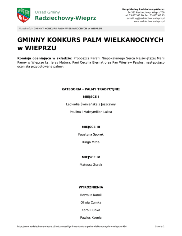 Urząd Gminy Radziechowy-Wieprz 34-381 Radziechowy, Wieprz 700 tel. 33 867 66 10, fax. 33 867 66 13 e-mail: [email protected] www.radziechowy-wieprz.pl Aktualności › GMINNY KONKURS PALM WIELKANOCNYCH w WIEPRZU GMINNY KONKURS PALM WIELKANOCNYCH w WIEPRZU Komisja oceniająca w składzie: Proboszcz Parafii Niepokalanego Serca Najświętszej Marii Panny w Wieprzu ks. Jerzy Matura, Pani Cecylia Biernat oraz Pan Wiesław Pawlus, następująco oceniała przygotowane palmy: KATEGORIA - PALMY TRADYCYJNE: MIEJSCE I Leokadia Świniańska z Juszczyny Paulina i Maksymilian Laksa MIEJSCE III Faustyna Sporek Kinga Mizia MIEJSCE IV Mateusz Żurek WYRÓZNIENIA Rozmus Kamil Oliwia Cumka Karol Hubka Pawlus Ksenia http://www.radziechowy-wieprz.pl/aktualnosci/gminny-konkurs-palm-wielkanocnych-w-wieprzu,984 Strona 1 Urząd Gminy Radziechowy-Wieprz 34-381 Radziechowy, Wieprz 700 tel. 33 867 66 10, fax. 33 867 66 13 e-mail: [email protected] www.radziechowy-wieprz.pl Aktualności › GMINNY KONKURS PALM WIELKANOCNYCH w WIEPRZU Bartek Pawlus Emilia Dudziak Oliwia Kosibor KATEGORIA - PALMY DZIECIĘCE MIEJSCE I Oliwia Kosibor Aleksandra Biegun WYRÓŻNIENIA Oliwia Sufa Aleksandra Dudziak Magdalena Rogak Nikiel Matylda Lizak Agnieszka Natalia Mika z Radziechów KATEGORIA - PALMY ZIELONE WYRÓZNIENIA Aleksandra Caputa Antonina Wawrowska Julia i Anna Misiarz Julita Figura Seweryn Bąk http://www.radziechowy-wieprz.pl/aktualnosci/gminny-konkurs-palm-wielkanocnych-w-wieprzu,984 Strona 2 Urząd Gminy Radziechowy-Wieprz 34-381 Radziechowy, Wieprz 700 tel. 33 867 66 10, fax. 33 867 66 13 e-mail: [email protected] www.radziechowy-wieprz.pl Aktualności › GMINNY KONKURS PALM WIELKANOCNYCH w WIEPRZU KATEGORIA - NAJWYŻSZA PALMA MIEJSCE I Rafał Graboń (7,10 metrów) MIEJSCE II Wiktoria Sufa (4 metry) MIEJSCE III Anna Stolarczyk MIEJSCE IV Kacper Murański Sylwia Figura MIEJSCE V JULITA FIGURA MIEJSCE VI Anna Kazubek Wśród wysokich palm warta uwagi była także kilkumetrowa palma zdobiąca kościół parafialny w Wieprzu, która nie stanęła do współzawodnictwa w konkursie. Serdecznie gratulujemy także i jej twórcom Paniom katechetkom Marii Biegun-Lizak oraz Monice Duraj, a także Pani Joannie Sufie i Magdalenie Duraj za piękne kwiaty, którymi została ozdobiona palma! Nagrody laureatom wręczali: Wójt Gminy Radziechowy-Wieprz Pan Maciej Mika, Przewodniczący http://www.radziechowy-wieprz.pl/aktualnosci/gminny-konkurs-palm-wielkanocnych-w-wieprzu,984 Strona 3 Urząd Gminy Radziechowy-Wieprz 34-381 Radziechowy, Wieprz 700 tel. 33 867 66 10, fax. 33 867 66 13 e-mail: [email protected] www.radziechowy-wieprz.pl Aktualności › GMINNY KONKURS PALM WIELKANOCNYCH w WIEPRZU Rady Gminy Pan Piotr Piela oraz Pani Irena Rodak Przewodnicząca Komisji Oświaty, Kultury, Sportu i Spraw Socjalnych Pani Irena Rodak. Dziękujemy za przybycie wszystkim gościom, w tym: Radnym, Dyrektorom placówek oświatowych, Przedstawicielkom Kół Gospodyń Wiejskich, Sołtysom – w tym w szczególności Pani Sołtys Marii Hulak z Wieprza, która obecna była aż do samego końca konkursu. Za pomoc w przeprowadzaniu konkursu dziękujemy członkom komisji oceniającej, a także Pani Marii Biegun-Lizak oraz Pani Dorocie Ryżce. Organizatorami konkursu byli Parafia Niepokalanego Serca Najświętszej Maryi Panny w Wieprzu oraz Gminne Centrum Kultury, Promocji, Turystyki Radziechowy-Wieprz. Konkurs odbywał się pod Honorowym Patronatem Wójta Gminy Radziechowy-Wieprz. Serdecznie gratulujemy wszystkim zwycięzcom i wyróżnionym! M.H. Fot. Maria biegun-Lizak http://www.radziechowy-wieprz.pl/aktualnosci/gminny-konkurs-palm-wielkanocnych-w-wieprzu,984 Strona 4