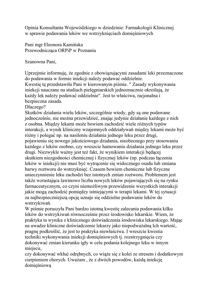 Opinia Konsultanta Wojewódzkiego w dziedzinie: Farmakologii Klinicznej w sprawie podawania leków we wstrzyknięciach domięśniowych Pani mgr Eleonora Kamińska Przewodnicząca ORPiP w Poznaniu Szanowna Pani, Uprzejmie informuję, Ŝe zgodnie z obowiązującymi zasadami leki przeznaczone do podawania w formie iniekcji naleŜy podawać oddzielnie. Kwestię tę przedstawiła Pani w kierowanym piśmie. " Zasady wykonywania iniekcji nauczane na studiach pielęgniarskich jednoznacznie określają, Ŝe kaŜdy lek naleŜy podawać oddzielnie". Jest to właściwa, racjonalna i bezpieczna zasada. Dlaczego? Skutków działania wielu leków, szczególnie wtedy, gdy są one podawane jednocześnie, nie moŜna przewidzieć, znając jedynie działanie kaŜdego z nich z osobna. Między lekami moŜe bowiem zachodzić wiele róŜnych typów interakcji, a wynik kliniczny wzajemnych oddziaływań między lekami moŜe być róŜny i polegać np. na nasileniu działania jednego leku przez drugi, pojawieniu się nowego jakościowego działania, nieobecnego przy stosowaniu kaŜdego z leków osobno, czy wreszcie hamowaniu działania jednego leku przez drugi. Niezwykle waŜny jest teŜ fakt, Ŝe wynikiem interakcji będącej skutkiem niezgodności chemicznej i fizycznej leków (np. podczas łączenia leków w iniekcji) nie musi być wytrącenie się widocznego osadu lub zmiana barwy roztworu do wstrzyknięć. Czasem bowiem chemiczne lub fizyczne unieczynnienie leku zachodzi bez istotnych zmian roztworu. Problemem jest takŜe wzrastająca lawinowo liczba nowych leków pojawiających się na rynku farmaceutycznym, co czyni niemoŜliwym przewidzenie wszystkich interakcji jakie mogą zachodzić pomiędzy istniejącymi w terapii lekami. W tej sytuacji za najbezpieczniejszą opcję uznaje się oddzielne podawanie leków do wstrzykiwań. W piśmie poruszyła Pani bardzo istotną kwestię zalecania podawania kilku leków do wstrzykiwań równocześnie przez środowisko lekarskie. Wiem, Ŝe praktyka ta wynika z klinicznego doświadczenia środowiska lekarskiego. Mając na uwadze kliniczne doświadczenie lekarzy jako niepodwaŜalną Ich wartość, pragnę podkreślić, Ŝe jest to praktyka niewłaściwa. I wreszcie kwestia techniki wykonywania iniekcji domięśniowych tj. rozstrzygnięcia czy dokonywać zmian kierunku igły w celu podania kolejnego leku w innym miejscu, czy dokonywać wkłuć odrębnych, co wiąŜe się z kolei ze stresem i dodatkowym cierpieniem chorych. UwaŜam , Ŝe z dwóch powodów, kaŜdą iniekcję domięśniową naleŜy podawać oddzielnie. Po pierwsze, jak zaznaczyła Pani, zmiana kierunku igły powoduje zmianę kąta wkłucia, czyli łamie zasadę kąta prostego, po drugie nie daje pewności, czy nie dokona się bezpośredni kontakt ( " zmieszanie " ) leków podawanych w ten sposób. Dla zminimalizowania cierpienia wynikającego z dokonywania odrębnych iniekcji domięśniowych zalecam podawać je z zachowaniem odpowiednich przedziałów czasowych (niejednoczasowo), co jak sądzę moŜe stanowić pewną uciąŜliwość ( przede wszystkim dla pacjentów ambulatoryjnych). Z wyrazami szacunku i powaŜania Dr hab. Med., mgr farm. Anna Jabłecka Konsultant Wojewódzki w dziedzinie: Farmakologii Klinicznej