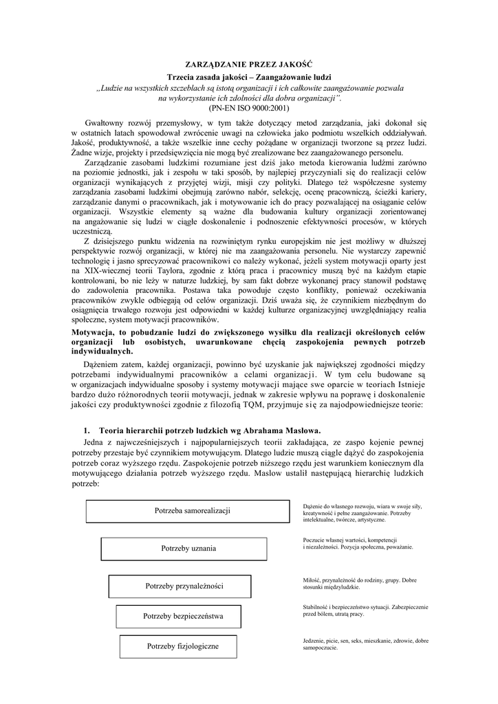 ZARZĄDZANIE PRZEZ JAKOŚĆ Trzecia zasada jakości – Zaangażowanie ludzi „Ludzie na wszystkich szczeblach są istotą organizacji i ich całkowite zaangażowanie pozwala na wykorzystanie ich zdolności dla dobra organizacji”. (PN-EN ISO 9000:2001) Gwałtowny rozwój przemysłowy, w tym także dotyczący metod zarządzania, jaki dokonał się w ostatnich latach spowodował zwrócenie uwagi na człowieka jako podmiotu wszelkich oddziaływań. Jakość, produktywność, a także wszelkie inne cechy pożądane w organizacji tworzone są przez ludzi. Żadne wizje, projekty i przedsięwzięcia nie mogą być zrealizowane bez zaangażowanego personelu. Zarządzanie zasobami ludzkimi rozumiane jest dziś jako metoda kierowania ludźmi zarówno na poziomie jednostki, jak i zespołu w taki sposób, by najlepiej przyczyniali się do realizacji celów organizacji wynikających z przyjętej wizji, misji czy polityki. Dlatego też współczesne systemy zarządzania zasobami ludzkimi obejmują zarówno nabór, selekcję, ocenę pracowniczą, ścieżki kariery, zarządzanie danymi o pracownikach, jak i motywowanie ich do pracy pozwalającej na osiąganie celów organizacji. Wszystkie elementy są ważne dla budowania kultury organizacji zorientowanej na angażowanie się ludzi w ciągłe doskonalenie i podnoszenie efektywności procesów, w których uczestniczą. Z dzisiejszego punktu widzenia na rozwiniętym rynku europejskim nie jest możliwy w dłuższej perspektywie rozwój organizacji, w której nie ma zaangażowania personelu. Nie wystarczy zapewnić technologię i jasno sprecyzować pracownikowi co należy wykonać, jeżeli system motywacji oparty jest na XIX-wiecznej teorii Taylora, zgodnie z którą praca i pracownicy muszą być na każdym etapie kontrolowani, bo nie leży w naturze ludzkiej, by sam fakt dobrze wykonanej pracy stanowił podstawę do zadowolenia pracownika. Postawa taka powoduje często konflikty, ponieważ oczekiwania pracowników zwykle odbiegają od celów organizacji. Dziś uważa się, że czynnikiem niezbędnym do osiągnięcia trwałego rozwoju jest odpowiedni w każdej kulturze organizacyjnej uwzględniający realia społeczne, system motywacji pracowników. Motywacja, to pobudzanie ludzi do zwiększonego wysiłku dla realizacji określonych celów organizacji lub osobistych, uwarunkowane chęcią zaspokojenia pewnych potrzeb indywidualnych. Dążeniem zatem, każdej organizacji, powinno być uzyskanie jak największej zgodności między potrzebami indywidualnymi pracowników a celami organizacj i. W tym celu budowane są w organizacjach indywidualne sposoby i systemy motywacji mające swe oparcie w teoriach Istnieje bardzo dużo różnorodnych teorii motywacji, jednak w zakresie wpływu na poprawę i doskonalenie jakości czy produktywności zgodnie z filozofią TQM, przyjmuje się za najodpowiedniejsze teorie: 1. Teoria hierarchii potrzeb ludzkich wg Abrahama Masłowa. Jedna z najwcześniejszych i najpopularniejszych teorii zakładająca, ze zaspo kojenie pewnej potrzeby przestaje być czynnikiem motywującym. Dlatego ludzie muszą ciągle dążyć do zaspokojenia potrzeb coraz wyższego rzędu. Zaspokojenie potrzeb niższego rzędu jest warunkiem koniecznym dla motywującego działania potrzeb wyższego rzędu. Maslow ustalił następującą hierarchię ludzkich potrzeb: Potrzeba samorealizacji Potrzeby uznania Potrzeby przynależności Potrzeby bezpieczeństwa Potrzeby fizjologiczne Dążenie do własnego rozwoju, wiara w swoje siły, kreatywność i pełne zaangażowanie. Potrzeby intelektualne, twórcze, artystyczne. Poczucie własnej wartości, kompetencji i niezależności. Pozycja społeczna, poważanie. Miłość, przynależność do rodziny, grupy. Dobre stosunki międzyludzkie. Stabilność i bezpieczeństwo sytuacji. Zabezpieczenie przed bólem, utratą pracy. Jedzenie, picie, sen, seks, mieszkanie, zdrowie, dobre samopoczucie. 2. Teorie X i Y (McGregora), oraz Z (W.Ouchiego) Teorie te, opisują zjawiska i sposoby oceny pracowników przez zarządzających w organizacjach. Zgodnie z teorią „X" zarządzający sądzą, że pracownicy: • Nie lubią pracować (pracują, bo muszą). • Są mało ambitni i należy ich kontrolować dla wymuszenia pracy. • Unikają odpowiedzialności i wolą być kontrolowani niż sami kierować. • Są przeciwni wszelkim zmianom i najbardziej cenią sobie bezpieczeństwo swego bytu. Zgodnie z teorią „Y" zarządzający sądzą, że pracownicy: • Pracę traktują jako naturalną cześć swego życia, dlatego lubią i chcą pracować. • Chętnie akceptują odpowiedzialność, a nawet jej poszukują i dotyczy to nawet najniższych stanowisk pracy. • Są zdolni do samodzielnego sterowania zadaniami, które im przydzielono, podejmując samokontrolę. • Posiadają takie cechy jak wyobraźnia, pomysłowość, kreatywność, umiejętność podejmowania decyzji i dotyczy to wszystkich pracowników, nie tylko kierowników. McGregor zdawał sobie sprawę, że żadna z powyższych teorii nie znajduje czystego potwierdzenia w rzeczywistości, jednak uważał, że zdecydowanie większe znaczenie dla motywacji pracowników ma teoria Y. Uzupełnieniem jego teorii jest opracowana przez W. Ouchiego teoria „Z" powstała w USA na bazie obserwacji japońskich technik menedżerskich. W firmach stosujących teorię „Z" pracownik może oczekiwać: • Pewności długoterminowego zatrudnienia. • Zmienności funkcji i zadań, planowania osobistej kariery i rozwoju. • Współudziału w podejmowaniu decyzji na wszystkich szczeblach zarządzania i wykonawstwa. • Zaangażowania wszystkich w proces ciągłego doskonalenia. • Teoria ta uwzględnia potrzeby określone przez Masłowa, które jednak indywidualnie mogą nie być idealnie zgodne z jego piramidą. 3. Teoria dwuczynnikowa Herzberga Teoria opiera się na stwierdzeniu, że istnieją dwie grupy czynników oddziałujących na człowieka: • Czynniki higieny, (czyli ze