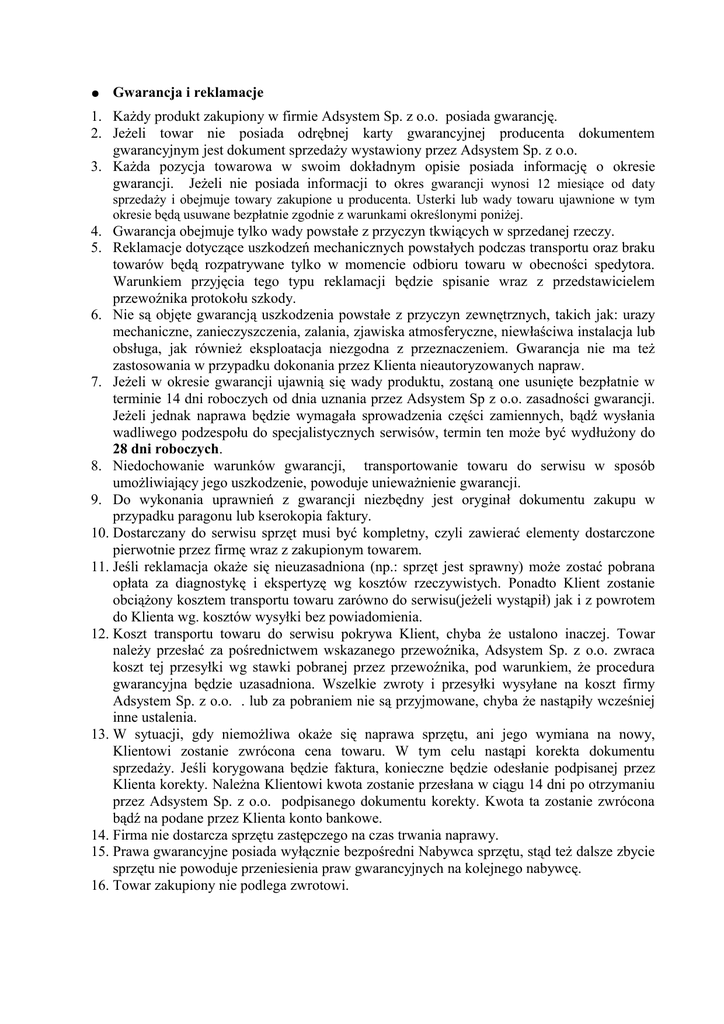 ● Gwarancja i reklamacje 1. Każdy produkt zakupiony w firmie Adsystem Sp. z o.o. posiada gwarancję. 2. Jeżeli towar nie posiada odrębnej karty gwarancyjnej producenta dokumentem gwarancyjnym jest dokument sprzedaży wystawiony przez Adsystem Sp. z o.o. 3. Każda pozycja towarowa w swoim dokładnym opisie posiada informację o okresie gwarancji. Jeżeli nie posiada informacji to okres gwarancji wynosi 12 miesiące od daty sprzedaży i obejmuje towary zakupione u producenta. Usterki lub wady towaru ujawnione w tym okresie będą usuwane bezpłatnie zgodnie z warunkami określonymi poniżej. 4. Gwarancja obejmuje tylko wady powstałe z przyczyn tkwiących w sprzedanej rzeczy. 5. Reklamacje dotyczące uszkodzeń mechanicznych powstałych podczas transportu oraz braku towarów będą rozpatrywane tylko w momencie odbioru towaru w obecności spedytora. Warunkiem przyjęcia tego typu reklamacji będzie spisanie wraz z przedstawicielem przewoźnika protokołu szkody. 6. Nie są objęte gwarancją uszkodzenia powstałe z przyczyn zewnętrznych, takich jak: urazy mechaniczne, zanieczyszczenia, zalania, zjawiska atmosferyczne, niewłaściwa instalacja lub obsługa, jak również eksploatacja niezgodna z przeznaczeniem. Gwarancja nie ma też zastosowania w przypadku dokonania przez Klienta nieautoryzowanych napraw. 7. Jeżeli w okresie gwarancji ujawnią się wady produktu, zostaną one usunięte bezpłatnie w terminie 14 dni roboczych od dnia uznania przez Adsystem Sp z o.o. zasadności gwarancji. Jeżeli jednak naprawa będzie wymagała sprowadzenia części zamiennych, bądź wysłania wadliwego podzespołu do specjalistycznych serwisów, termin ten może być wydłużony do 28 dni roboczych. 8. Niedochowanie warunków gwarancji, transportowanie towaru do serwisu w sposób umożliwiający jego uszkodzenie, powoduje unieważnienie gwarancji. 9. Do wykonania uprawnień z gwarancji niezbędny jest oryginał dokumentu zakupu w przypadku paragonu lub kserokopia faktury. 10. Dostarczany do serwisu sprzęt musi być kompletny, czyli zawierać elementy dostarczone pierwotnie przez firmę wraz z zakupionym towarem. 11. Jeśli reklamacja okaże się nieuzasadniona (np.: sprzęt jest sprawny) może zostać pobrana opłata za diagnostykę i ekspertyzę wg kosztów rzeczywistych. Ponadto Klient zostanie obciążony kosztem transportu towaru zarówno do serwisu(jeżeli wystąpił) jak i z powrotem do Klienta wg. kosztów wysyłki bez powiadomienia. 12. Koszt transportu towaru do serwisu pokrywa Klient, chyba że ustalono inaczej. Towar należy przesłać za pośrednictwem wskazanego przewoźnika, Adsystem Sp. z o.o. zwraca koszt tej przesyłki wg stawki pobranej przez przewoźnika, pod warunkiem, że procedura gwarancyjna będzie uzasadniona. Wszelkie zwroty i przesyłki wysyłane na koszt firmy Adsystem Sp. z o.o. . lub za pobraniem nie są przyjmowane, chyba że nastąpiły wcześniej inne ustalenia. 13. W sytuacji, gdy niemożliwa okaże się naprawa sprzętu, ani jego wymiana na nowy, Klientowi zostanie zwrócona cena towaru. W tym celu nastąpi korekta dokumentu sprzedaży. Jeśli korygowana będzie faktura, konieczne będzie odesłanie podpisanej przez Klienta korekty. Należna Klientowi kwota zostanie przesłana w ciągu 14 dni po otrzymaniu przez Adsystem Sp. z o.o. podpisanego dokumentu korekty. Kwota ta zostanie zwrócona bądź na podane przez Klienta konto bankowe. 14. Firma nie dostarcza sprzętu zastępczego na czas trwania naprawy. 15. Prawa gwarancyjne posiada wyłącznie bezpośredni Nabywca sprzętu, stąd też dalsze zbycie sprzętu nie powoduje przeniesienia praw gwarancyjnych na kolejnego nabywcę. 16. Towar zakupiony nie podlega zwrotowi. ● Zwrot towaru 1. Zgodnie z przepisami ustawy z dnia 2 marca 2000 roku o ochronie niektórych praw konsumentów oraz o odpowiedzialności za szkodę wyrządzoną przez produkt niebezpieczny, Klient będący osobą fizyczną, nie nabywającą towaru w celach związanych z działalnością gospodarczą, ma prawo odstąpić od umowy w ciągu 10 dni od dnia wydania towaru. Zwrot powinien nastąpić niezwłocznie, nie później niż w terminie 14 dni. Towar powinien wrócić w takim stanie w jakim został zakupiony, w oryginalnym opakowaniu wraz z instrukcją i akcesoriami. 2. W razie odstąpienia od umowy jest ona uważana za niezawartą i strony obowiązane są zwrócić to, co sobie świadczyły w stanie niezmienionym, co oznacza, że w sytuacji, gdy Klient zmienił stan towaru, a więc towar nosi ślady używania, niemożliwe jest odstąpienie od umowy. 3. Sprzedawca nie zwraca kosztów transportu. 4. Do wykonania uprawnień z tytułu ustawy z dnia 2 marca 2000 roku o ochronie niektórych praw konsumentów oraz o odpowiedzialności za szkodę wyrządzoną przez produkt niebezpieczny niezbędny jest oryginał dokumentu zakupu w przypadku paragonu lub kserokopia faktury. 5. W przypadku odstąpienia od umowy koszt przesyłki towaru do firmy Adsystem Sp. z o.o. . pokrywa Klient. Klient zobowiązany jest odpowiednio zabezpieczyć przesyłany towar, aby nie uległ zniszczeniu podczas transportu. W przypadku, gdy Klient zażądał wystawienia faktury, pieniądze zostaną zwrócone na konto w ciągu 14 dni po otrzymaniu przez firmę Adsystem Sp. z o.o. podpisanego dokumentu korekty. Korekta faktury zostanie sporządzona przez Adsystem Sp. z o.o. i niezwłocznie przesłana Klientowi listem. ● Pozostałe ustalenia 1. Oferta handlowa ważna tylko na terenie Polski. 2. Wszystkie wymienione produkty i nazwy są używane wyłącznie w celach identyfikacyjnych i mogą być zastrzeżonymi znakami towarowymi odpowiednich właścicieli. 3. Adsystem Sp. z o.o. nie ponosi odpowiedzialności za niewypełnienie zobowiązań umowy w przypadku siły wyższej, zakłóceń, ogólnego lub częściowego strajku, szczególnie w usługach pocztowych, przewozowych, w wypadku powodzi, pożaru lub wojny. 4. Adsystem Sp. z o.o. uchyla się od jakiejkolwiek odpowiedzialności za 