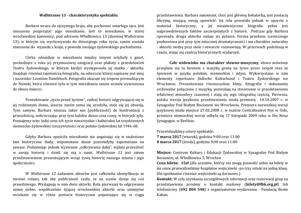 Wallstrasse 13 - charakterystyka spektaklu Barbara wraca do ojczystego kraju, aby pochować zmarłego ojca. Jest zmuszona posprzątać jego mieszkanie. Jest to mieszkanie, w starej wrocławskiej kamienicy, pod adresem Włodkowica 13 (dawniej Wallstrasse 13), w którym się wychowywała do dziesiątego roku życia, zanim została zmuszona do wyjazdu z kraju, z powodu swojego żydowskiego pochodzenia. Córka odnajduje w mieszkaniu między innymi artykuły z gazet, pochodzące z roku jej przymusowej emigracji oraz plakaty z przedstawień Teatru Żydowskiego, w którym kiedyś występowała jej matka - aktorka. Znajduje również tajemniczą fotografię, na odwrocie której napisane jest imię i nazwisko: Leontine Dambitsch. Fotografia okazuje się tropem prowadzącym do Niemki, która również żyła w tym mieszkaniu zanim została wywieziona do obozu śmierci. Poszukiwanie „życia przed życiem”, cudzej historii odgrywającej się w jej rodzinnym domu, jeszcze zanim sama się urodziła, staje się jej obsesją. Tym samym, Barbara zmusza także nas (publiczność) do konfrontacji z przeszłością, wskrzeszając przy tym ludzkie dusze oraz czasy, w których żyły. Poznajemy więc ludzi oraz ich życie towarzyskie i kulturalne lat trzydziestych niemiecko-żydowskiej rzeczywistości oraz polsko-żydowskiej lat 1946-68. Gdyby Barbara opuściła mieszkanie nie angażując się w znalezione tam historyczne ślady, wspomniane dusze pozostałyby zapomniane na zawsze. Podejmując jednak wyzwanie „odkrywania dalej”, wplata przeszłość w swoją historię i dzieli się nią z nami. Wallstrasse 13 jest zatem przedstawieniem prezentującym wciąż żywą historię naszego miasta i jego społeczności. W Wallstrasse 13 zadaniem aktorów jest całkowita identyfikacja ze swoimi rolami, tak aby publiczność czuła, że na scenie dzieje się coś prawdziwego. Występują w nim dwie aktorki. Rola pierwszej to odgrywanie samej siebie, współcześnie żyjącej wrocławskiej aktorki oraz umiejętne wcielanie się w różne postacie historyczne pojawiające się w ciągu przedstawienia. Barbara natomiast, choć jest główną bohaterką, jest postacią fikcyjną, snującą swoją opowieść. Jej rola powstała jednak w oparciu o materiał historyczny, a jej nieautentyczna biografia pełna jest najprawdziwszych faktów zaczerpniętych z historii. Podczas gdy Barbara opowiada, druga aktorka zadaje jej pytania. Forma przekazu scenicznego pozbawiona jest przy tym sztucznej dramatyczności i ma charakter naturalny - aktorki siedzą przy stole i otwarcie rozmawiają. W przerwach podróżują w czasie, stając się częścią historycznych wydarzeń. Całe widowisko ma charakter słowno-muzyczny, słowo mówione przeplata się tu bowiem z muzyką graną na żywo przez zespół oraz ze śpiewem w języku polskim, niemieckim i jidysz. Wykorzystano w nim elementy repertuaru Jüdische Kulturbund i Teatru Żydowskiego we Wrocławiu. Prezentowane równocześnie filmy, fotografie i dokumenty archiwalne połączone z muzyką, pozwalają na stworzenie w przedstawieniu właściwej atmosfery czasowej i stają się jego integralną częścią. Pierwsza, polska wersja językowa przedstawienia miała premierę 10.10.2007 r. w Synagodze Pod Białym Bocianem we Wrocławiu. Premiera norweskiej wersji językowej miała miejsce 27.02.2008 r. w teatrze Centralteatret Nye w Oslo, premiera niemieckiej wersji odbyła się 17 listopada 2009 roku w Die Neue Synagogue. w Berlinie. Przewidzieliśmy cztery spektakle: 7 marca 2017 (wtorek), godzina 9:00 oraz 11:00 8 marca 2017 (środa), godzina 9:00 oraz 11:00 Miejsce: Centrum Kultury i Edukacji Żydowskiej w Synagodze Pod Białym Bocianem, ul. Włodkowica 5, Wrocław Cena biletu: 15zł (dla uczniów, którzy nie mogą pozwolić sobie na bilety w tej cenie przewidzieliśmy bezpłatne wejściówki -po trzy sztuki na jedną klasę. Dla opiekunów również wejściówki są darmowe.) Kontakt: W celu uzyskania szczegółowych informacji oraz rezerwacji grup na przedstawienia prosimy o kontakt mailowy ([email protected]) lub telefoniczny (692 804 540) z organizatorem wydarzenia - Fundacją Bente Kahan.